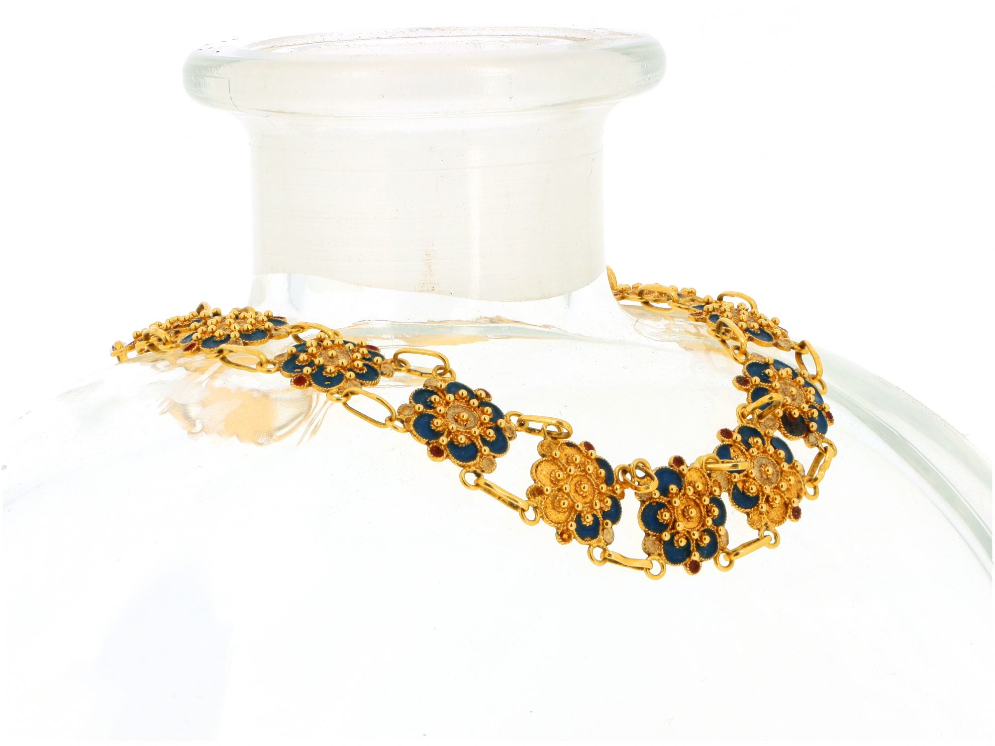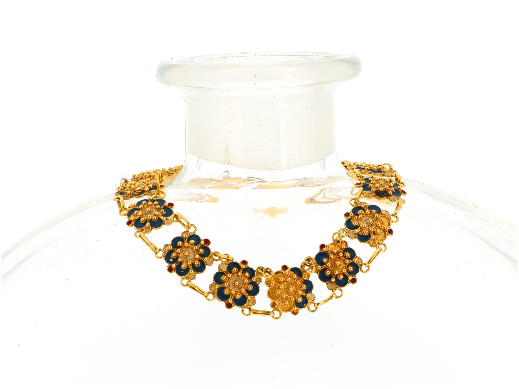 Lote 003 - Pulseira ANTIGA em Ouro de malha Caramujo com Rosas Portuguesas, trabalhados e pintados à mão em FILIGRANA, com centro mais caído, acompanhado por três pingentes em losango, elaborado em OURO 19,2 QUILATES. Estado de Conservação: pequenas falhas ou imperfeições. Contraste: sem marcas de contraste, com mais de 50 anos ao abrigo do Decreto Lei 120/2017, artigo 2.º, alínea c). Medidas (CxL): 21,3cm. Peso Total: 10,75g.