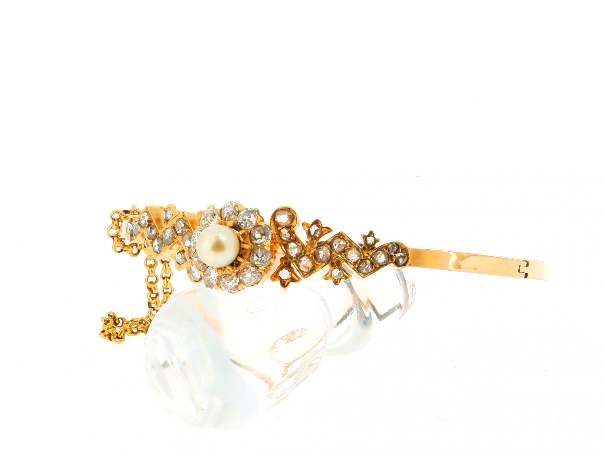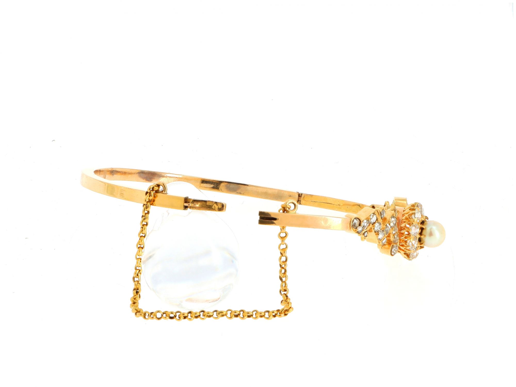 Lote 008 - Bracelete ALTA JOALHARIA em Ouro, com parte frontal em tiaras cravejadas com 30 DIAMANTES em talhe redondo e centro tipo flor com 1 Pérola com rebordo cravejado de 10 DIAMANTES em talhe redondo e fecho caixa, com corrente de proteção, elaborado em OURO 19,2 QUILATES. Estado de Conservação: Muito Bom, ligeiros sinais de uso. Contraste: Marca de Ourives. (ao abrigo do Decreto Lei 120/2017, artigo 3.º, alínea z). Medidas (LxA): 10,4*7cm. Peso Total: 15,26g.