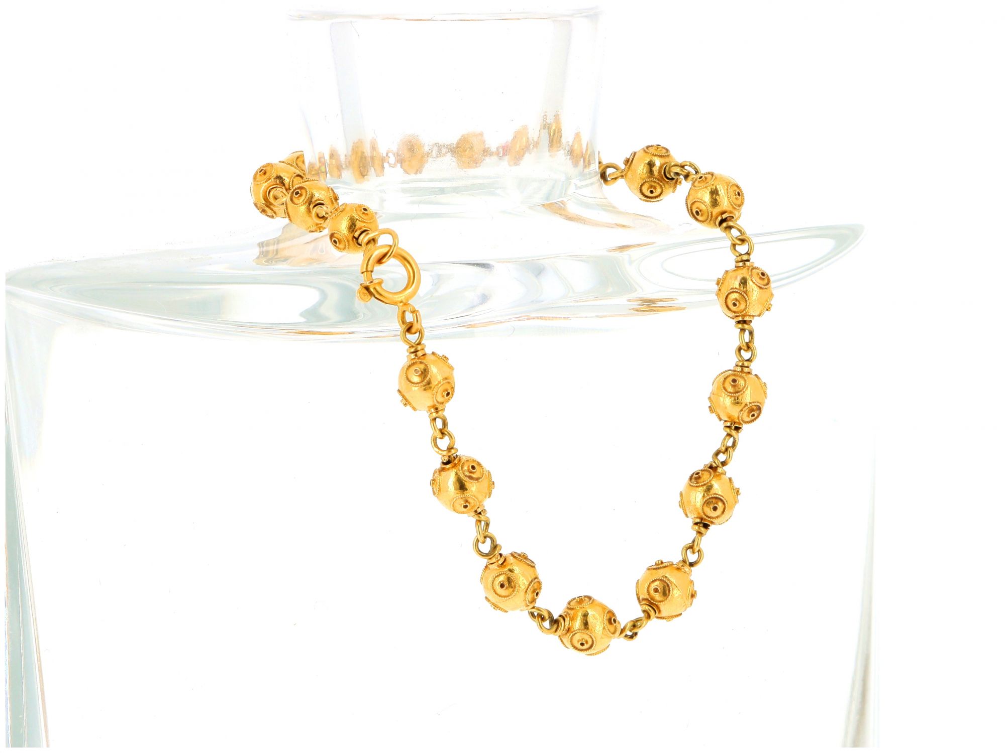 Lote 013 - Pulseira em Ouro de malha elos intercalada com contas de Viana trabalhadas em Filigrana e com fecho bóia, elaborado em OURO 19,2 QUILATES. Estado de Conservação: Bom. Contraste: sem marcas de contraste, com mais de 50 anos ao abrigo do Decreto Lei 120/2017, artigo 2.º, alínea c). Medidas (Comp): 22,3cm. Peso Total: 7,4g.