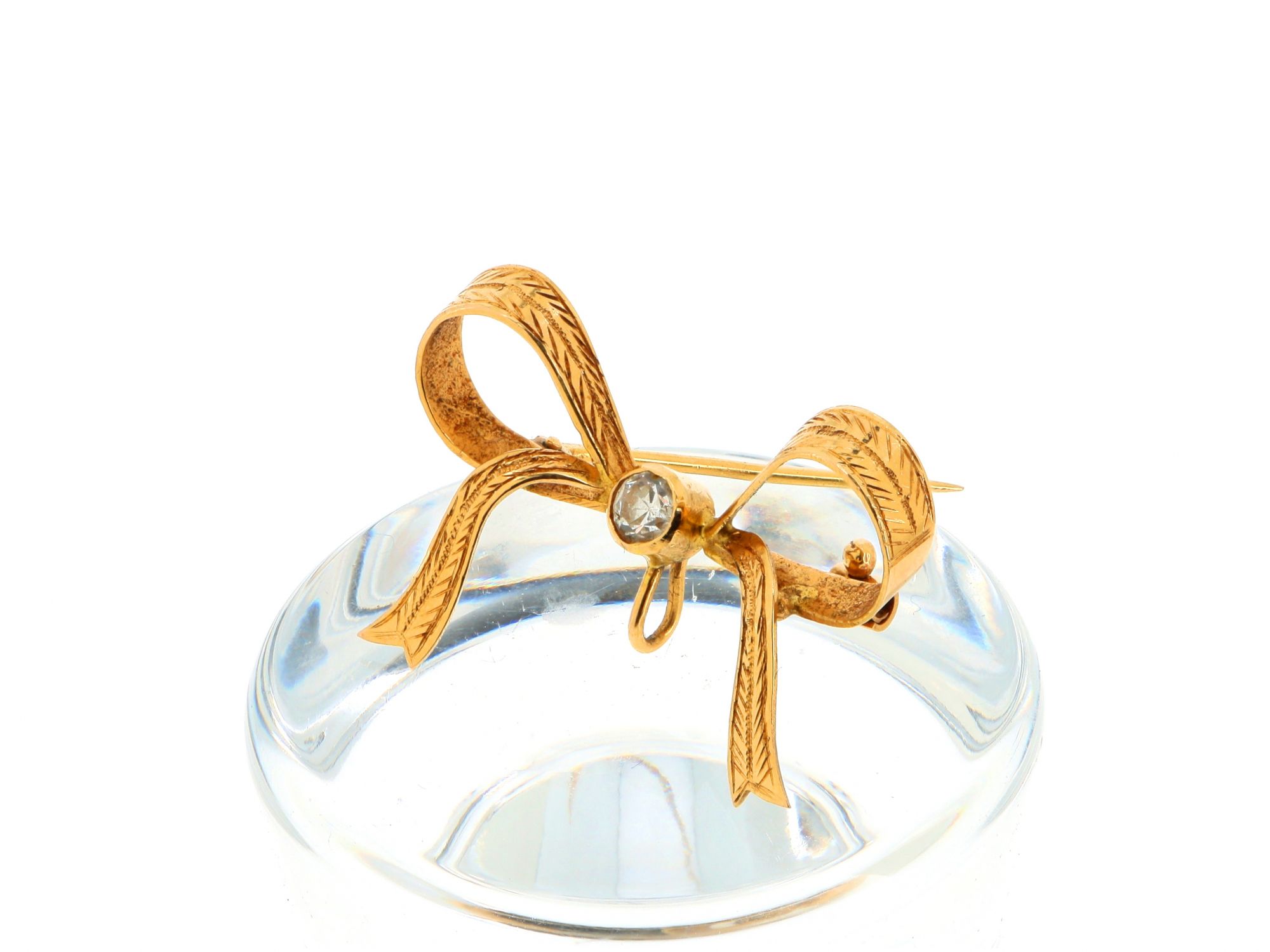 Lote 015 - Alfinete de Peito em Ouro com forma de Laço, trabalhado a cinzel e com zicórnia incolor no centro, elaborado em OURO 19,2 QUILATES. Estado de Conservação: Bom, sinais de uso. Contraste: sem marcas de contraste, com mais de 50 anos ao abrigo do Decreto Lei 120/2017, artigo 2.º, alínea c). Medidas (CxA): 3,1*2,2cm. Peso Total: 3,41g.