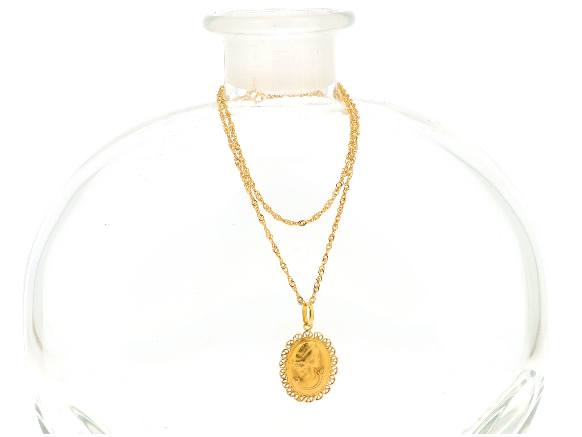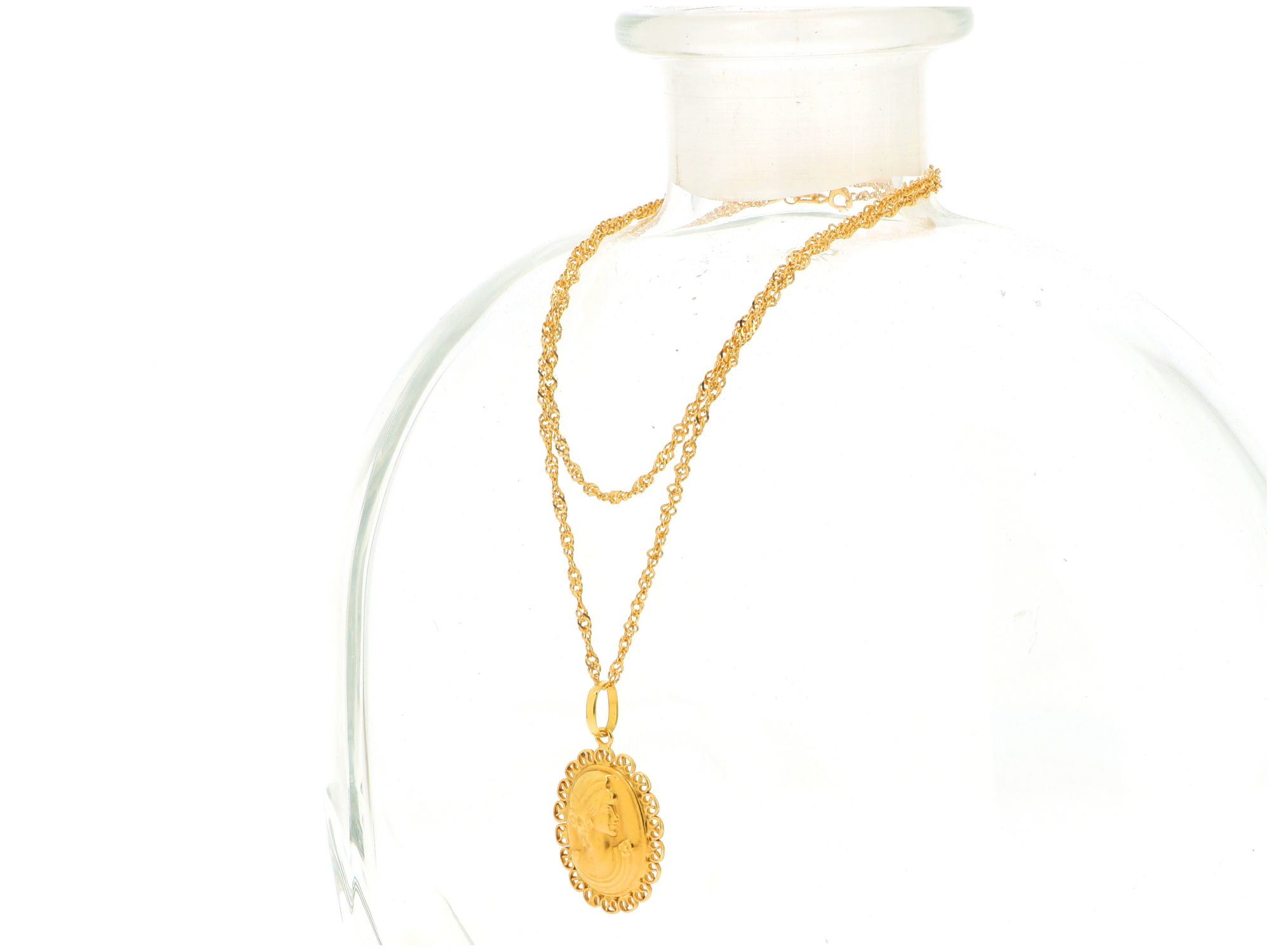 Lote 021 - Gargantilha em Ouro de malha Singapura com medalha Camafeu (2,8*1,7), elaborado em OURO 18 QUILATES. Estado de Conservação: Bom. Contraste: Marca 750. (OURO - ao abrigo do Decreto Lei 120/2017, artigo 3.º, alínea x). Medidas (Comp): 40cm. Peso Total: 4,18g.