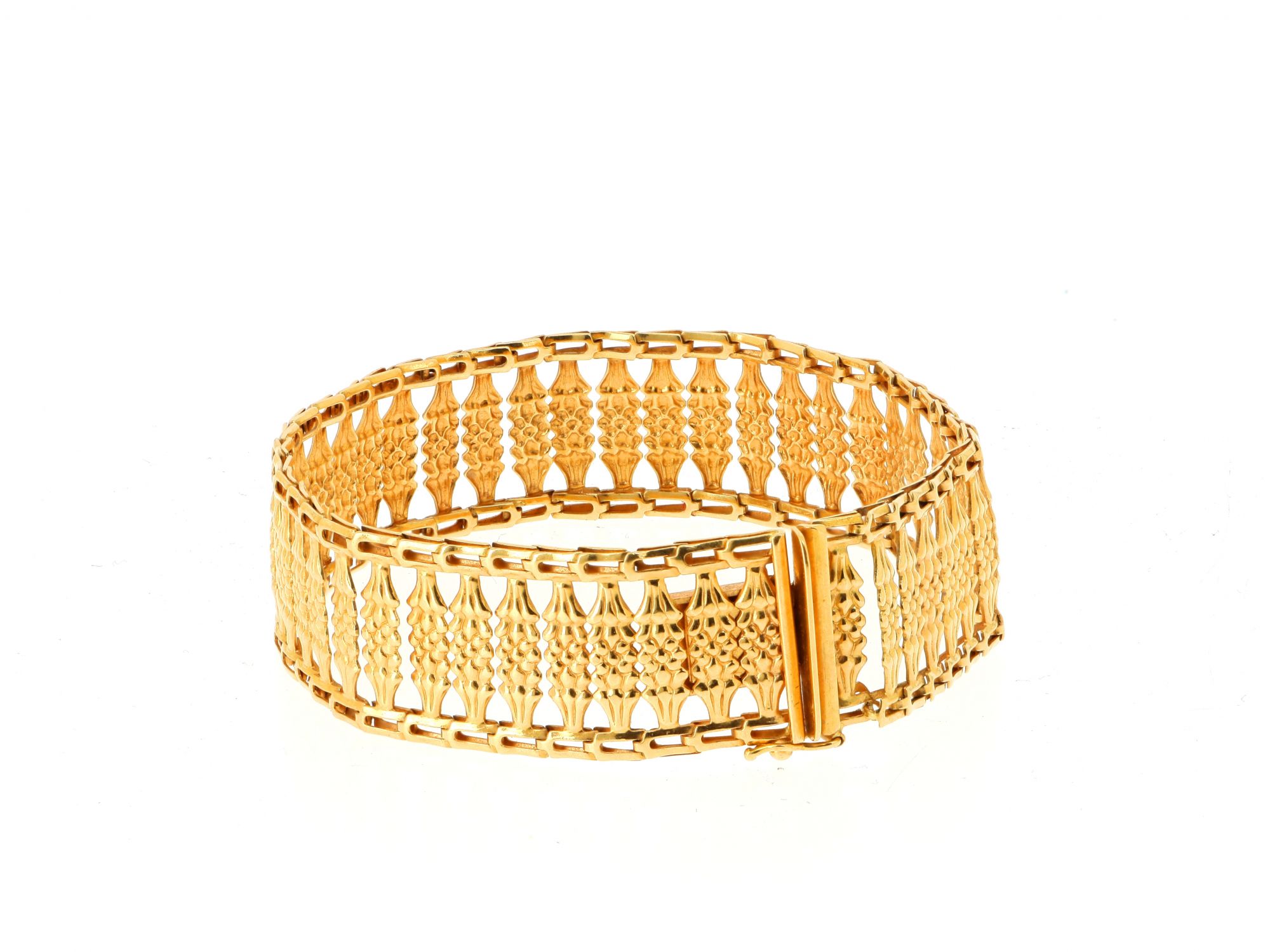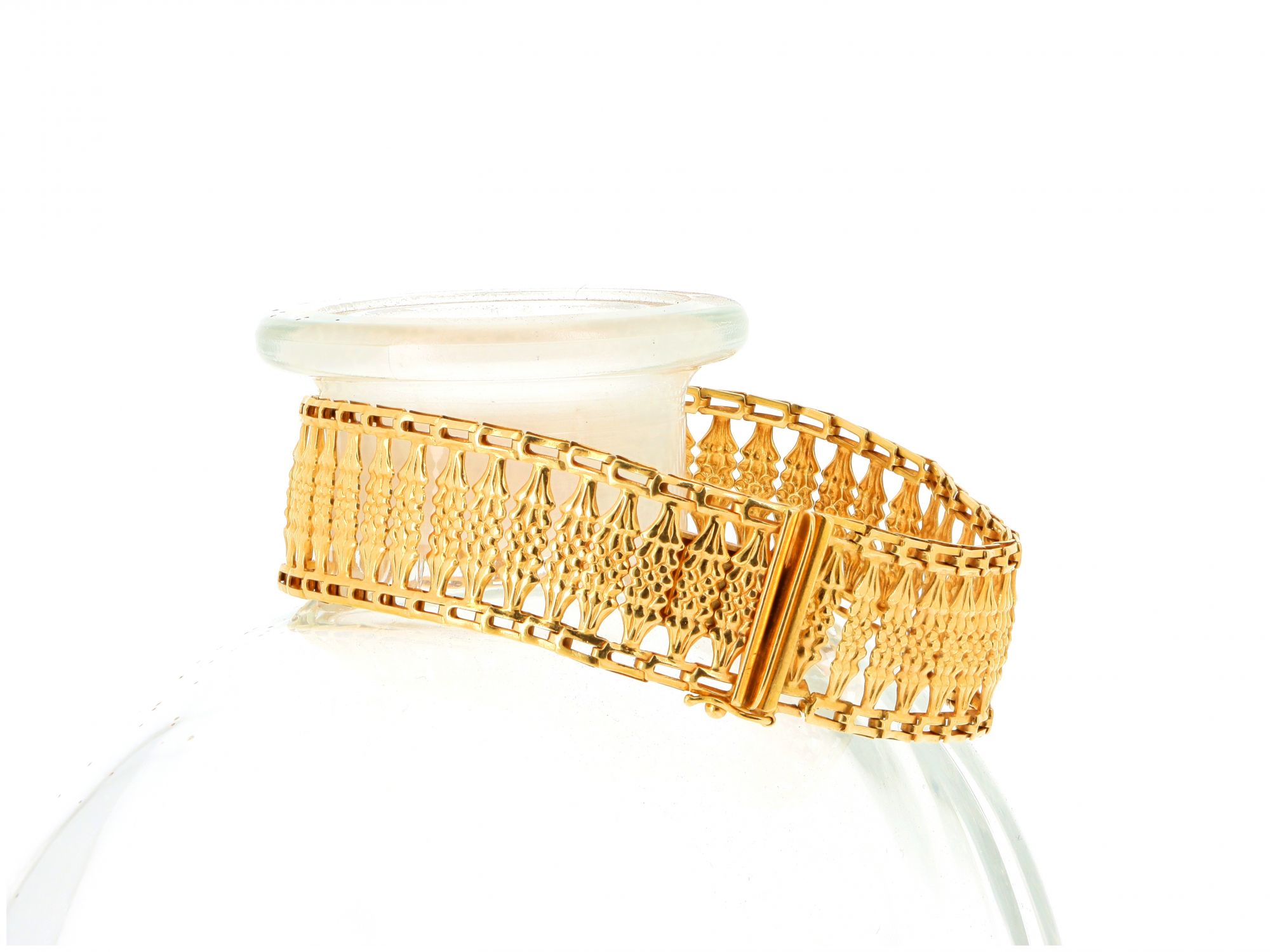 Lote 032 - Bracelete em Ouro de malha larga e intrincada com fecho caixa e mola de proteção, elaborado em OURO 19,2 QUILATES. Estado de Conservação: Muito Bom, ligeiros sinais de uso. Contraste: Cabeça de Veado 800 (OURO - 1985-2020, ao abrigo do Decreto Lei 120/2017, artigo 3.º, alínea y). Medidas (CxL): 19,9*1,8cm. Peso Total: 19,98g.