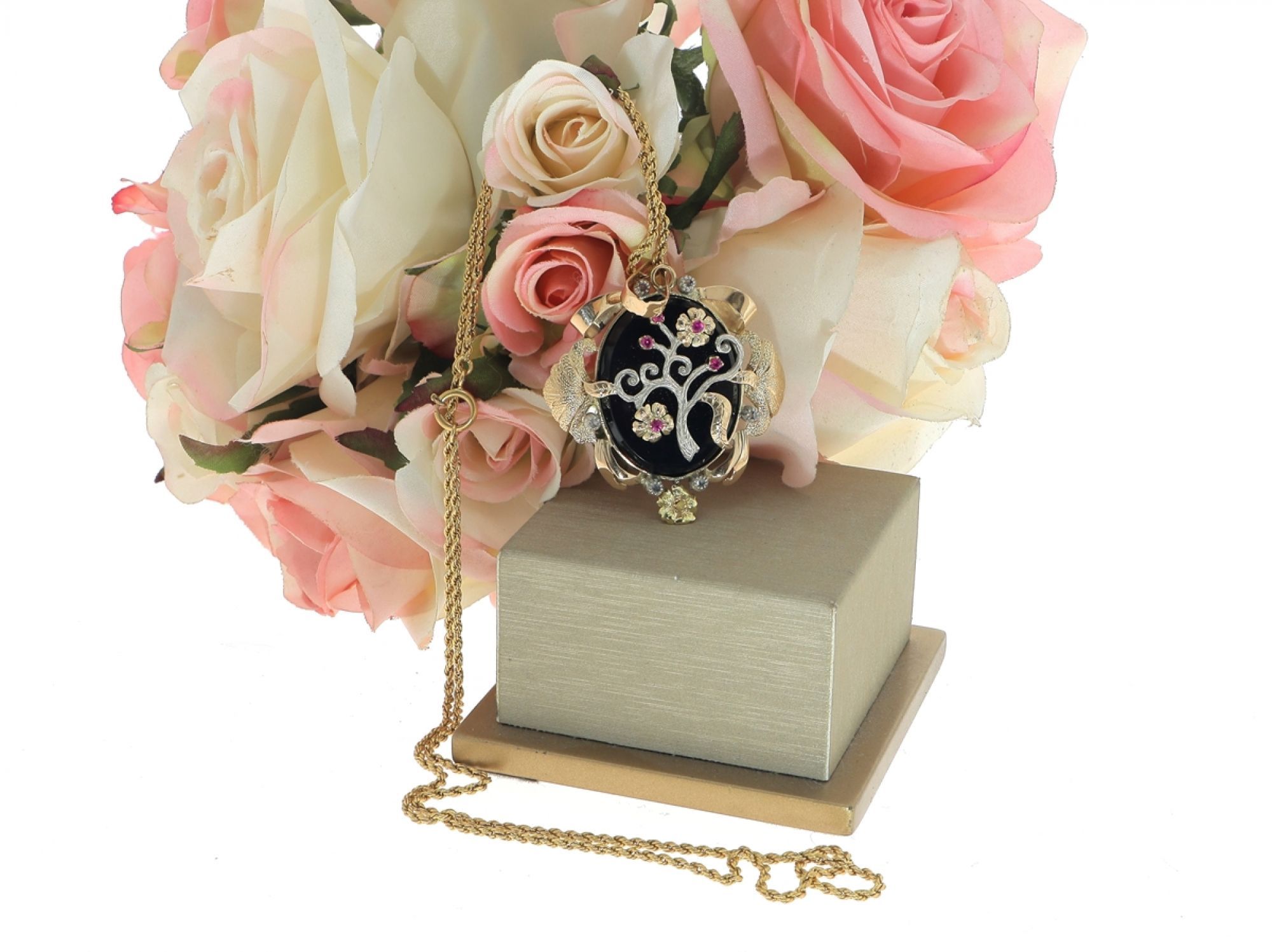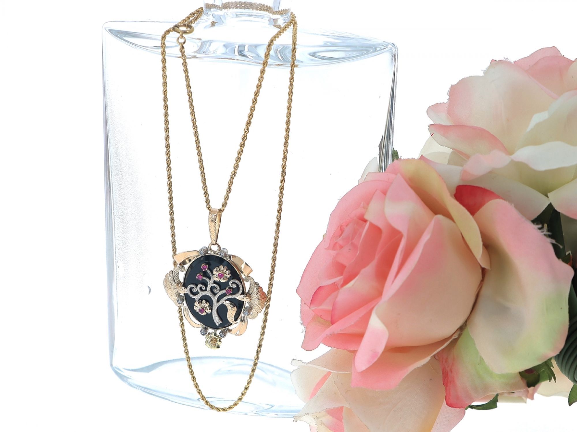 Fio e Pingente ANTIGOS em OURO 19,2K - 6 DIAMANTES, RUBIS e PÉROLA