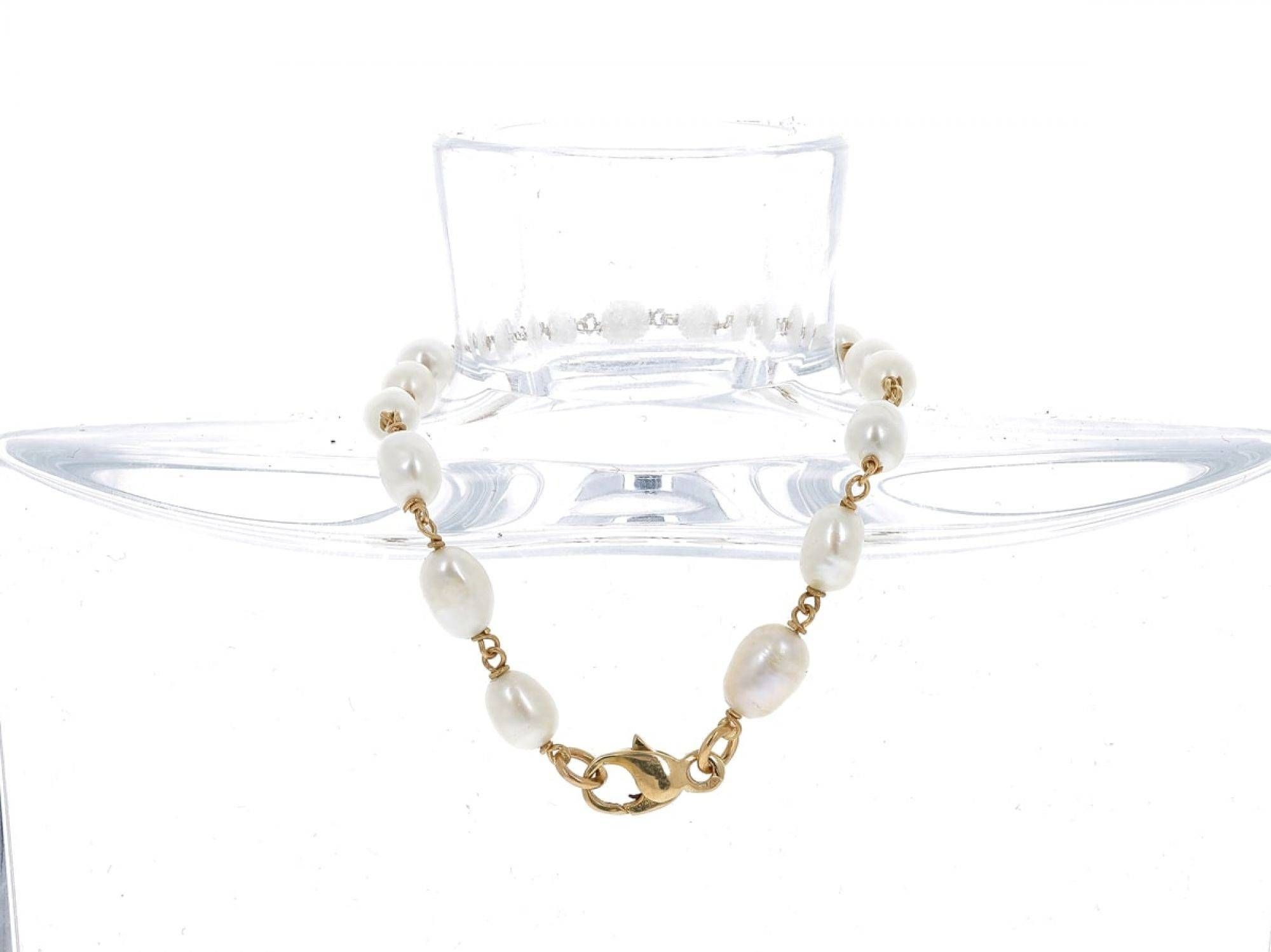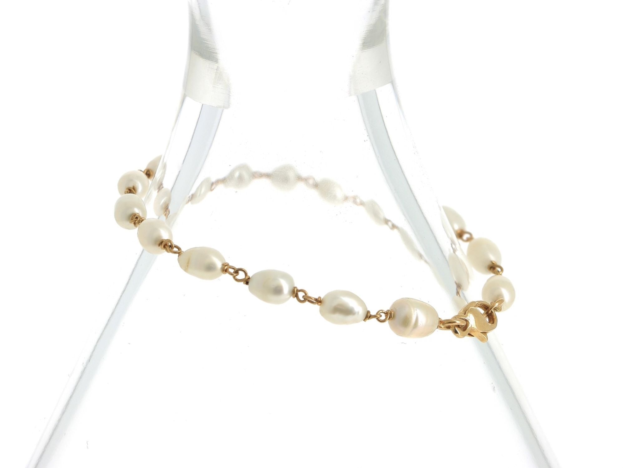 Lote 006 - Pulseira de PÉROLAS e OURO 19,2 Quilates, composto por 15 pérolas de água doce, intercaladas em Ouro. Estado de Conservação: Muito Bom. Contraste: Cabeça de Veado 800 (OURO - 1985-2020, ao abrigo do Decreto Lei 120/2017, artigo 3.º, alínea y). Medidas (CxL): 19,2x0,6 cm. Peso Total: 7g.