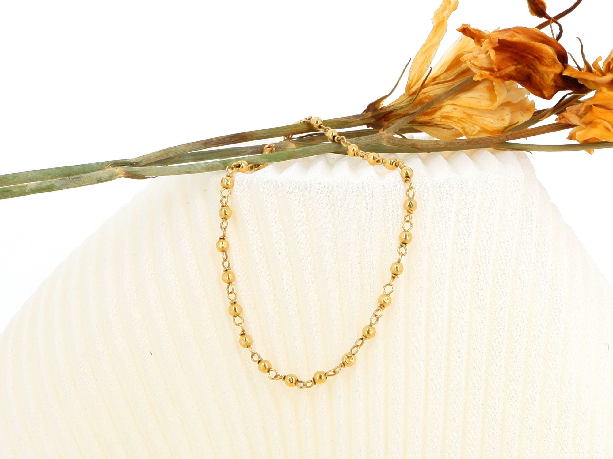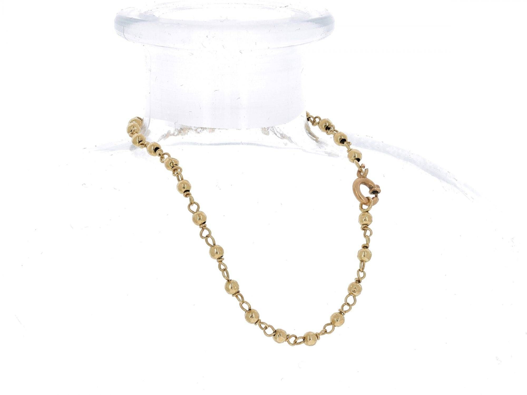 Lote 009 - Pulseira elaborada em OURO 18 Quilates, com elos simples e pequenas esferas em ouro polido. Estado de Conservação: Muito Bom. Contraste: Marca 750. (OURO - ao abrigo do Decreto Lei 120/2017, artigo 3.º, alínea x). Medidas (Comp): 19cm. Peso Total: 2,34g.