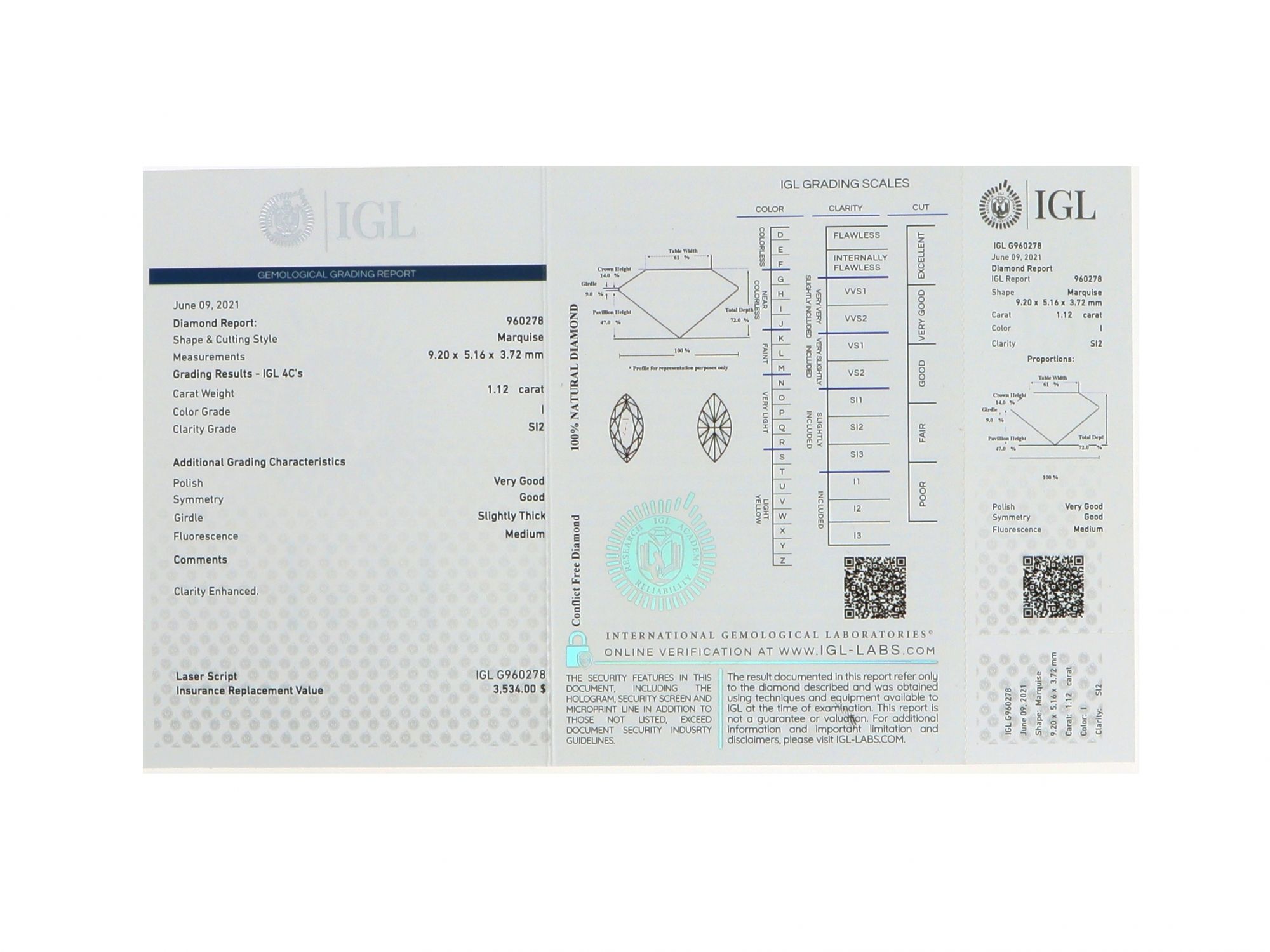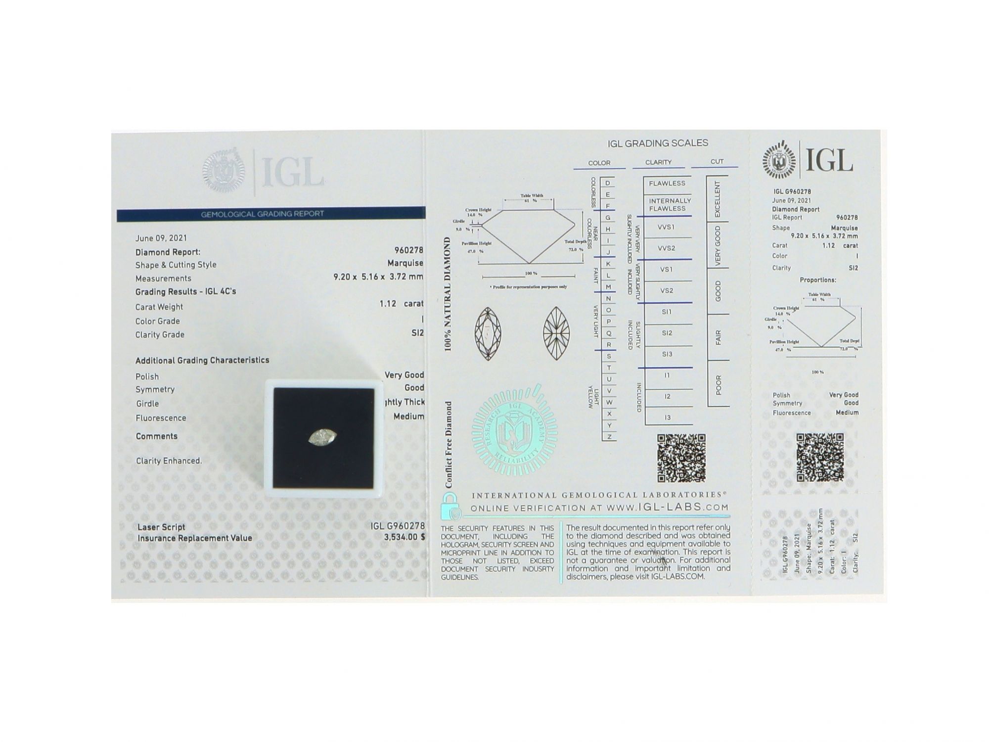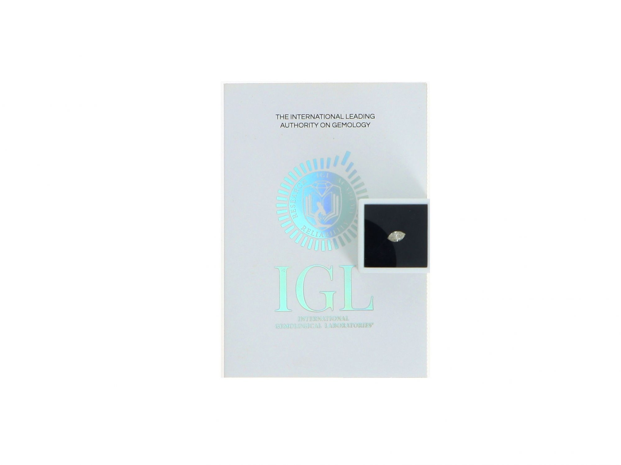 Lote 007 - Pedra Diamante Natural, talhe Marquise, cor I, pureza SI2, "Clarity Enhanced". Com certificado IGL International Gemological Laboratories Nº 960278. Valor estimado de retalho de € 3.034 ($ 3.534) presente no certificado. Número do certificado inscrito a laser no diamante. Estado de Conservação: Excelente. Medidas (CxLxA): 9.20*5.16*3.72 mm. Peso Total (ct): 1,12.