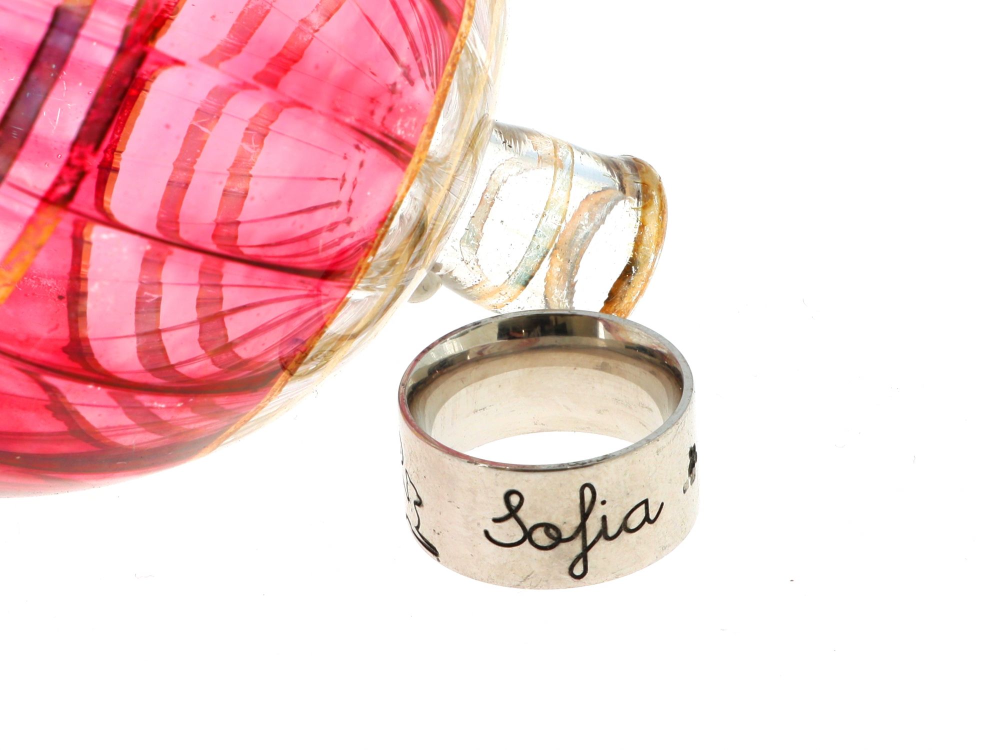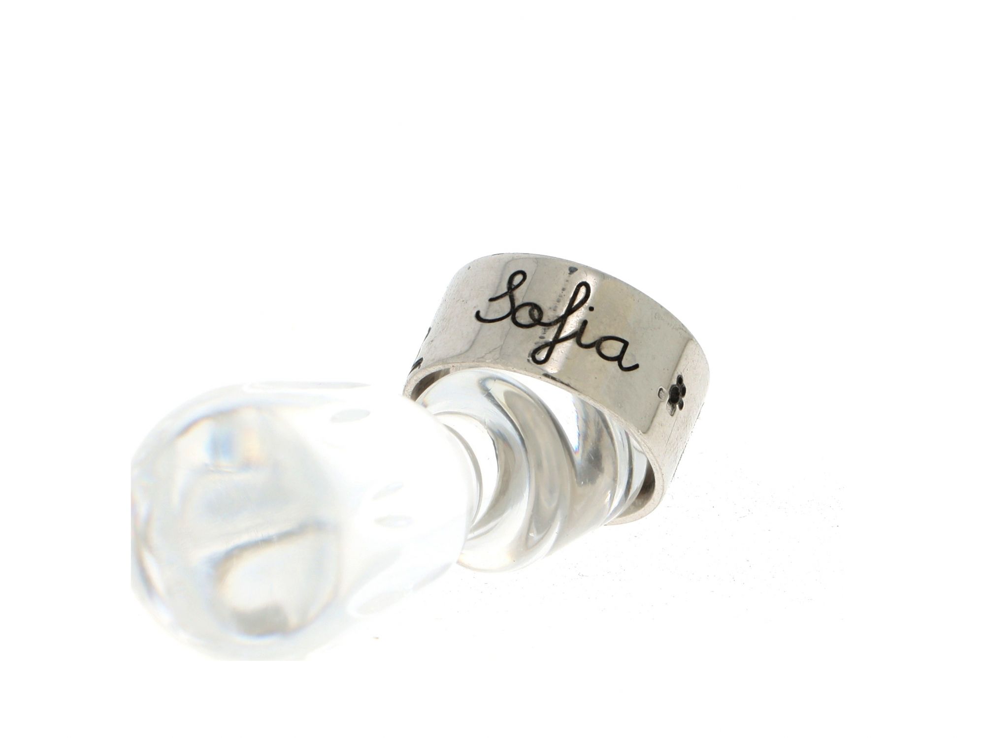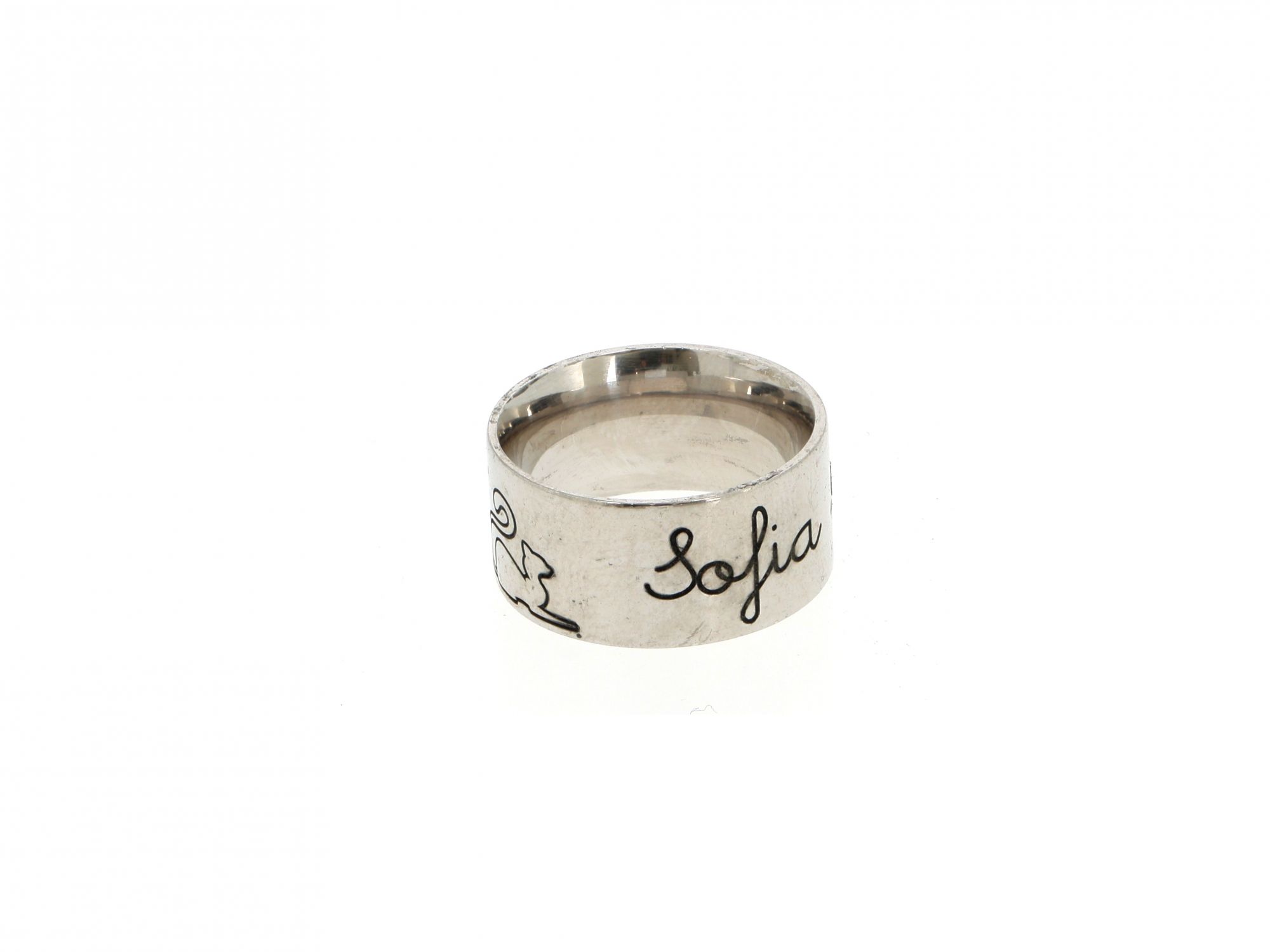 Lote 065 - Aliança em Prata com imagens de gatos com gravação de nome “SOFIA”, elaborado em PRATA 925. Estado de Conservação: Bom. Contraste: Cabeça de Águia virada à esquerda 925 (1985-2020 - ao abrigo do Decreto Lei 120/2017, artigo 3.º, alínea y). Tam.: 11,5. Medidas (CxLxA): 2,1*1*2,1cm. Peso Total: 9,38g.