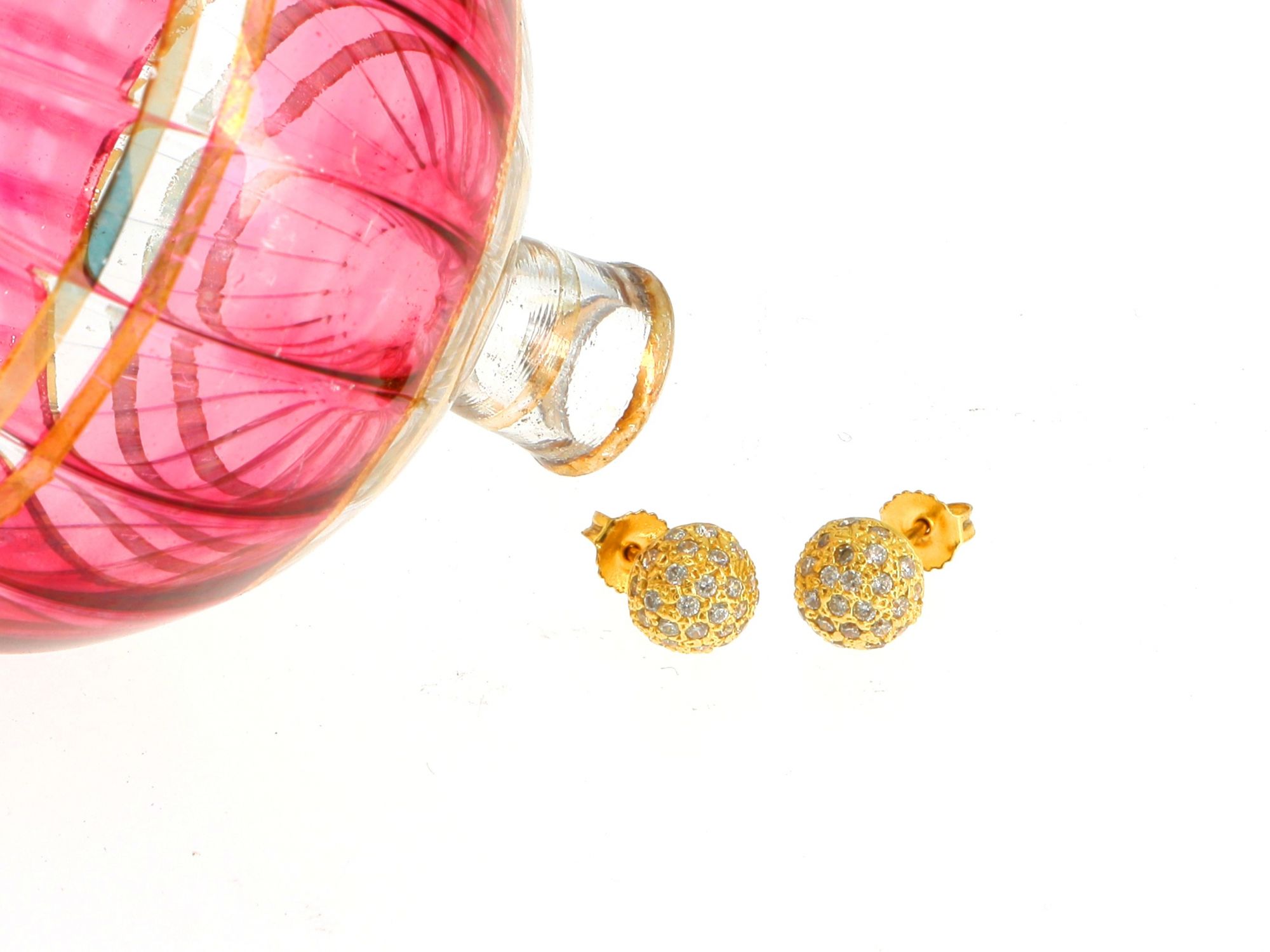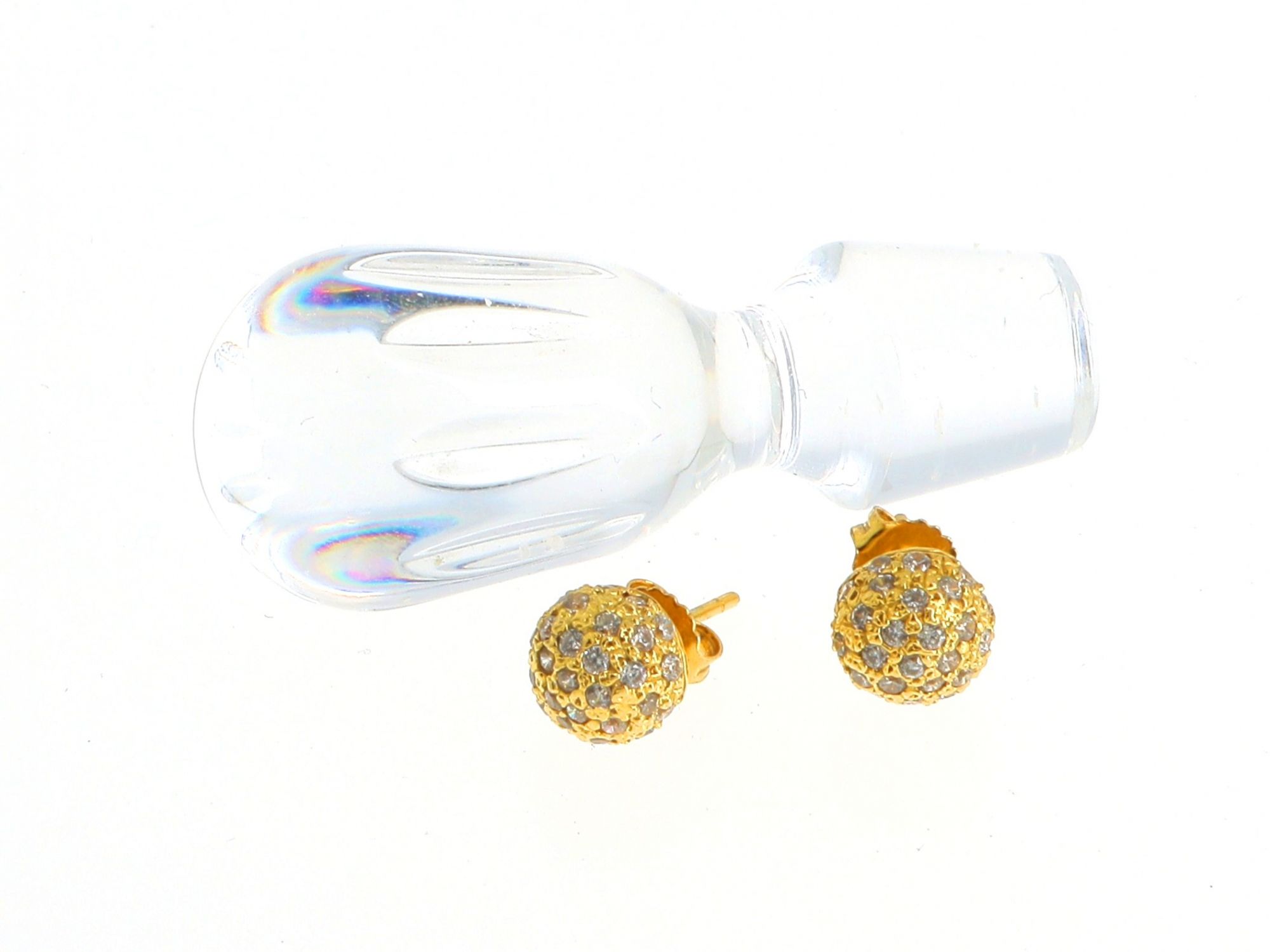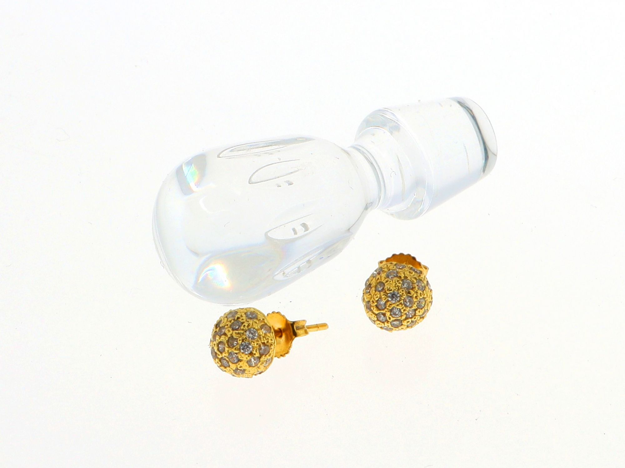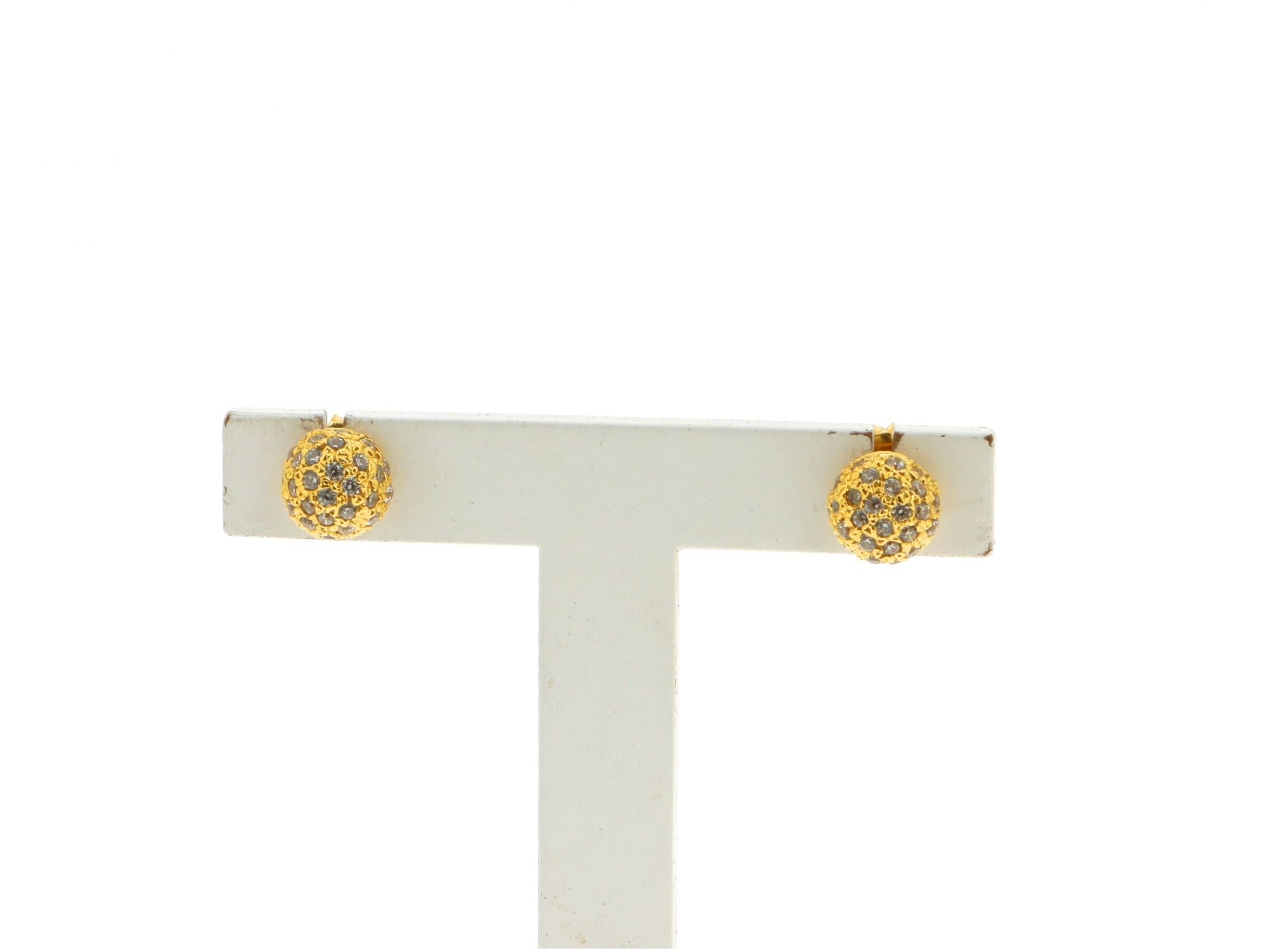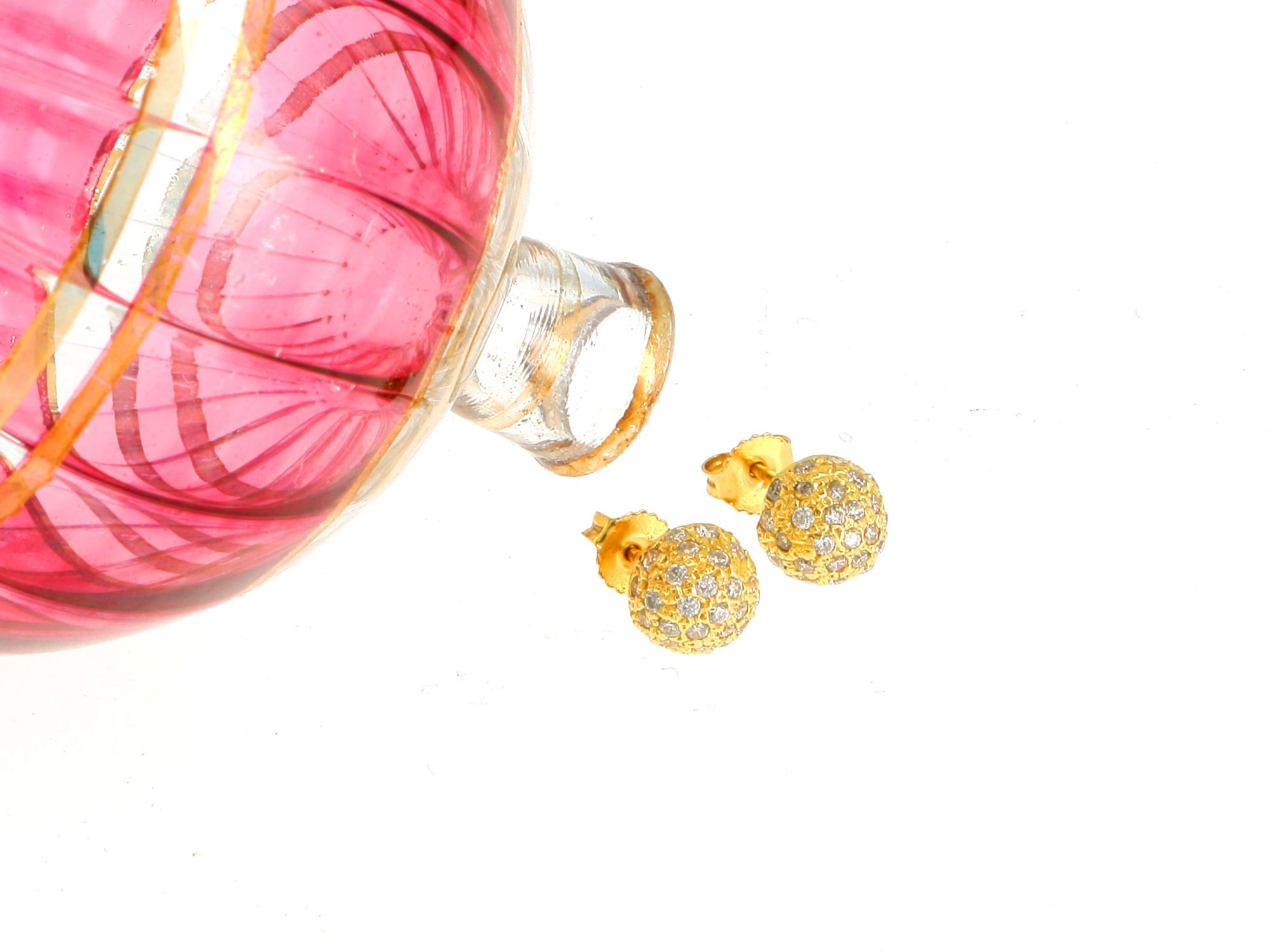 Lote 012 - Brincos em Prata Dourada de meia bola cravejados com zicórnias incolores, elaborado em PRATA 925. Estado de Conservação: Bom. Contraste: Marca 925. (PRATA - ao abrigo do Decreto Lei 120/2017, artigo 3.º, alínea x). Medidas (Larg): 0,8cm. Peso Total: 2,62g.