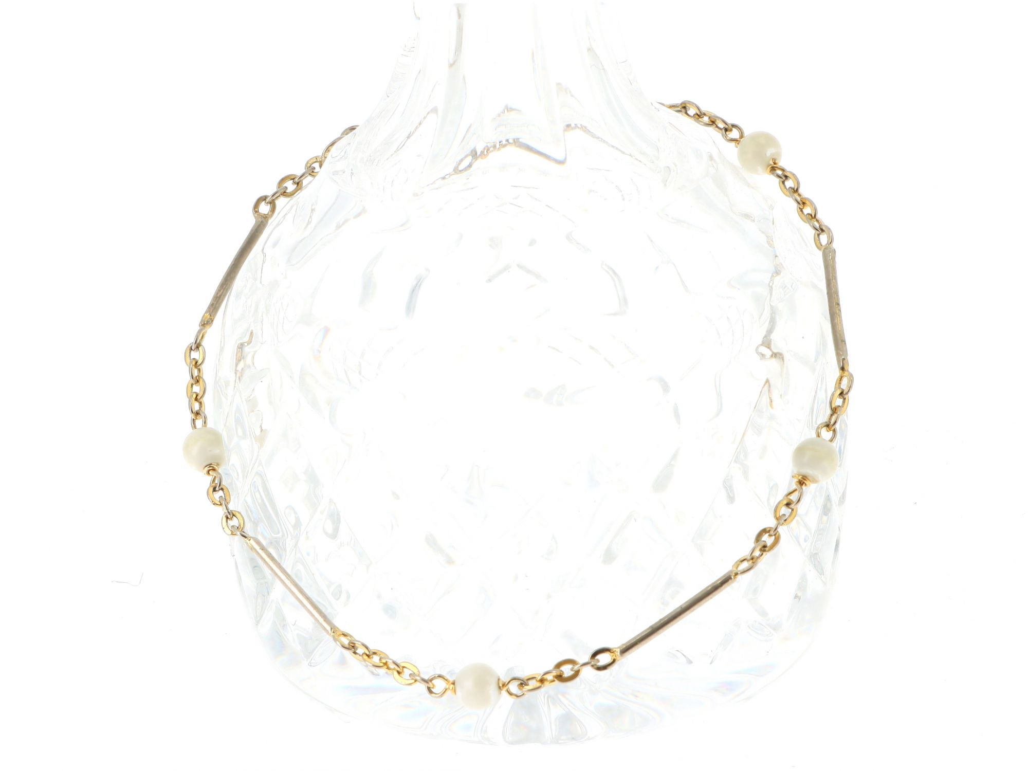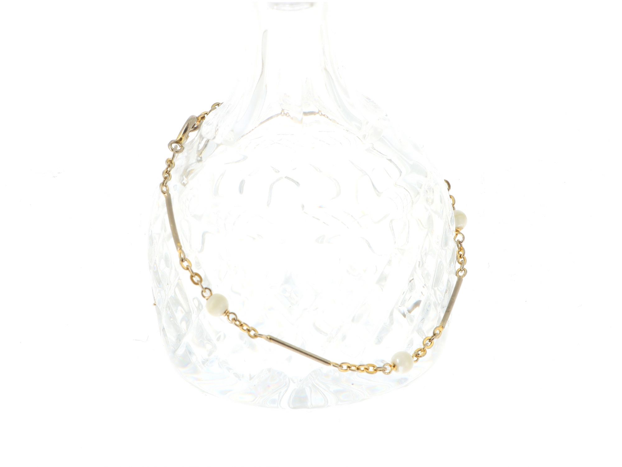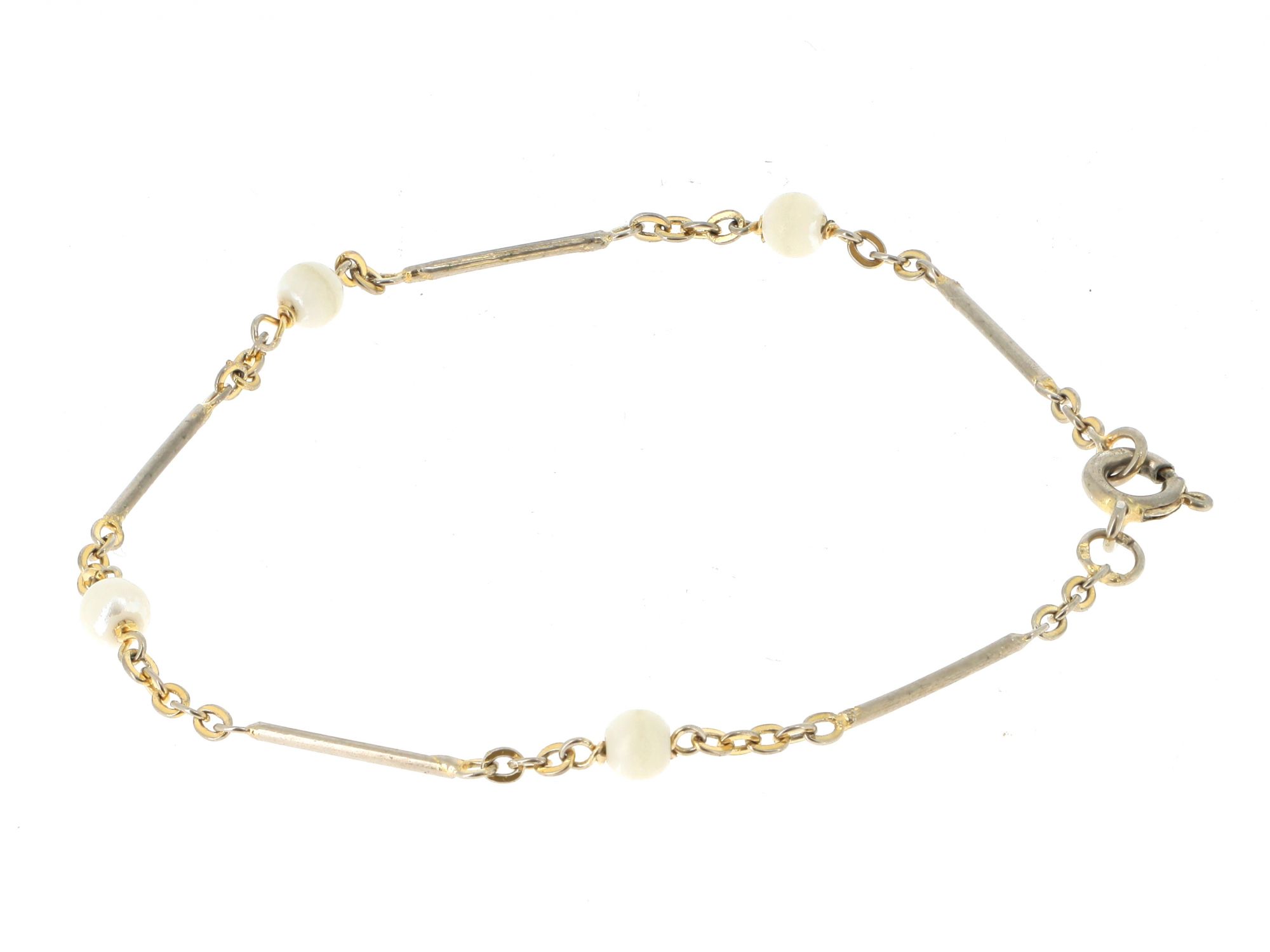 Lote 022 - Pulseira em Prata de malha cartier e canutilho intercalados com bolas brancas e com fecho bóia, elaborado em PRATA 835. Estado de Conservação: Bom, sinais de uso. Contraste: Cabeça de Águia virada à direita 835 (1985-2020 - ao abrigo do Decreto Lei 120/2017, artigo 3.º, alínea y). Medidas (Comp): 18,3cm. Peso Total: 1,7g.