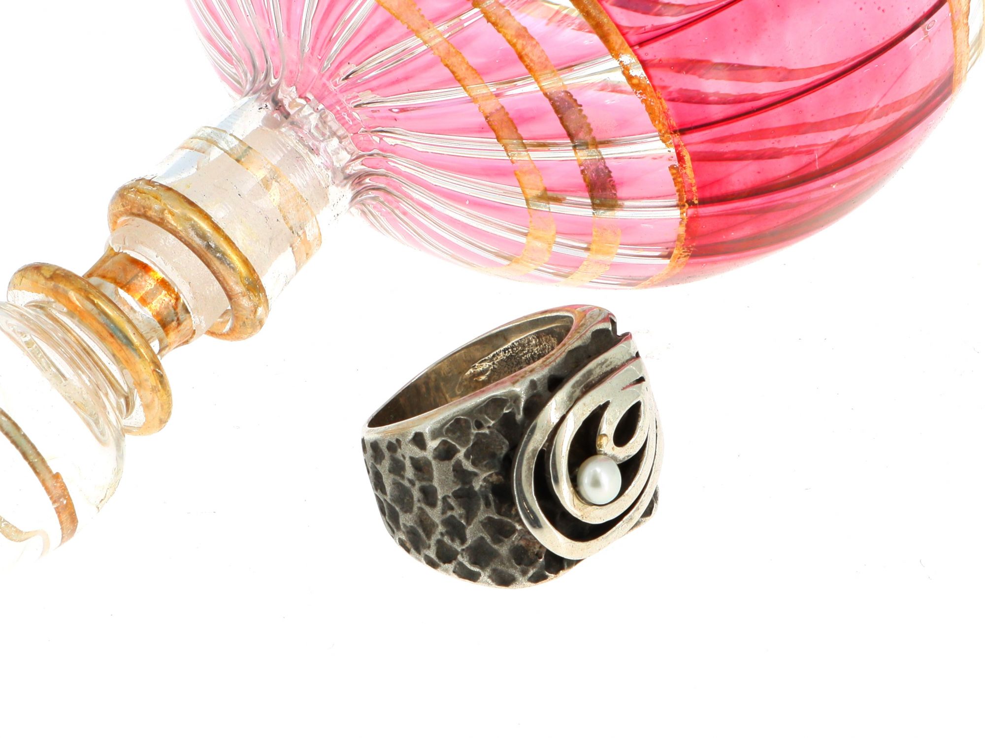 Lote 007 - Anel em Prata com efeito martelado e topo em forma de lágrima tripla com pérola cravejada, elaborado em PRATA 835. Estado de Conservação: Bom, sinais de uso. Contraste: Cabeça de Águia virada à direita 835 (1985-2020 - ao abrigo do Decreto Lei 120/2017, artigo 3.º, alínea y). Tam.: 12. Medidas (CxLxA): 2,2*1,6*2,3cm. Peso Total: 11,47g.