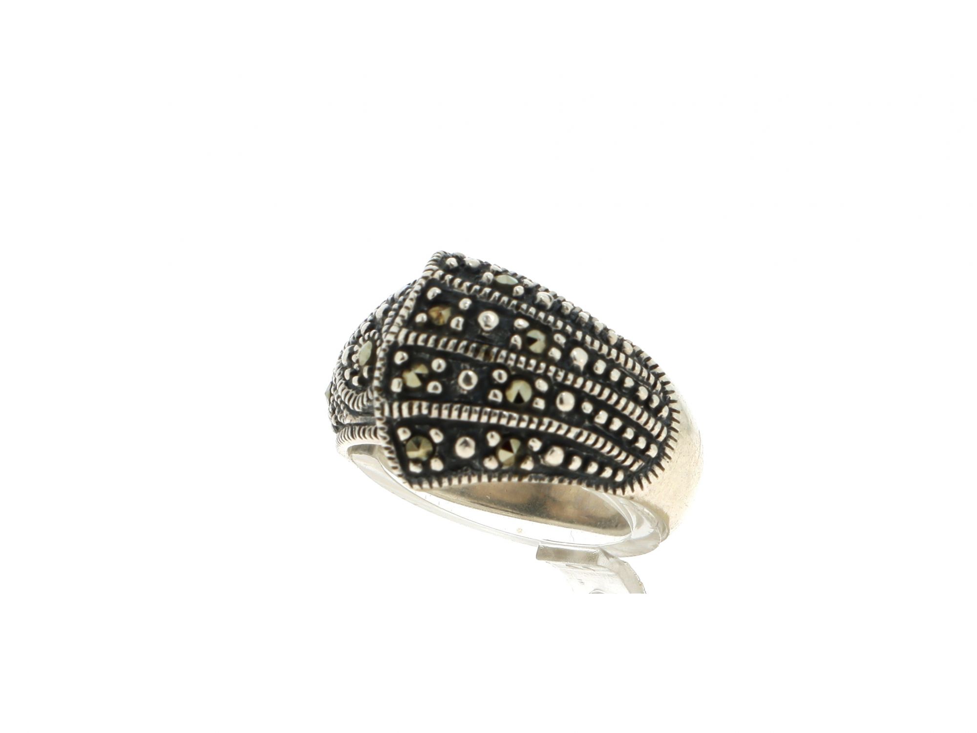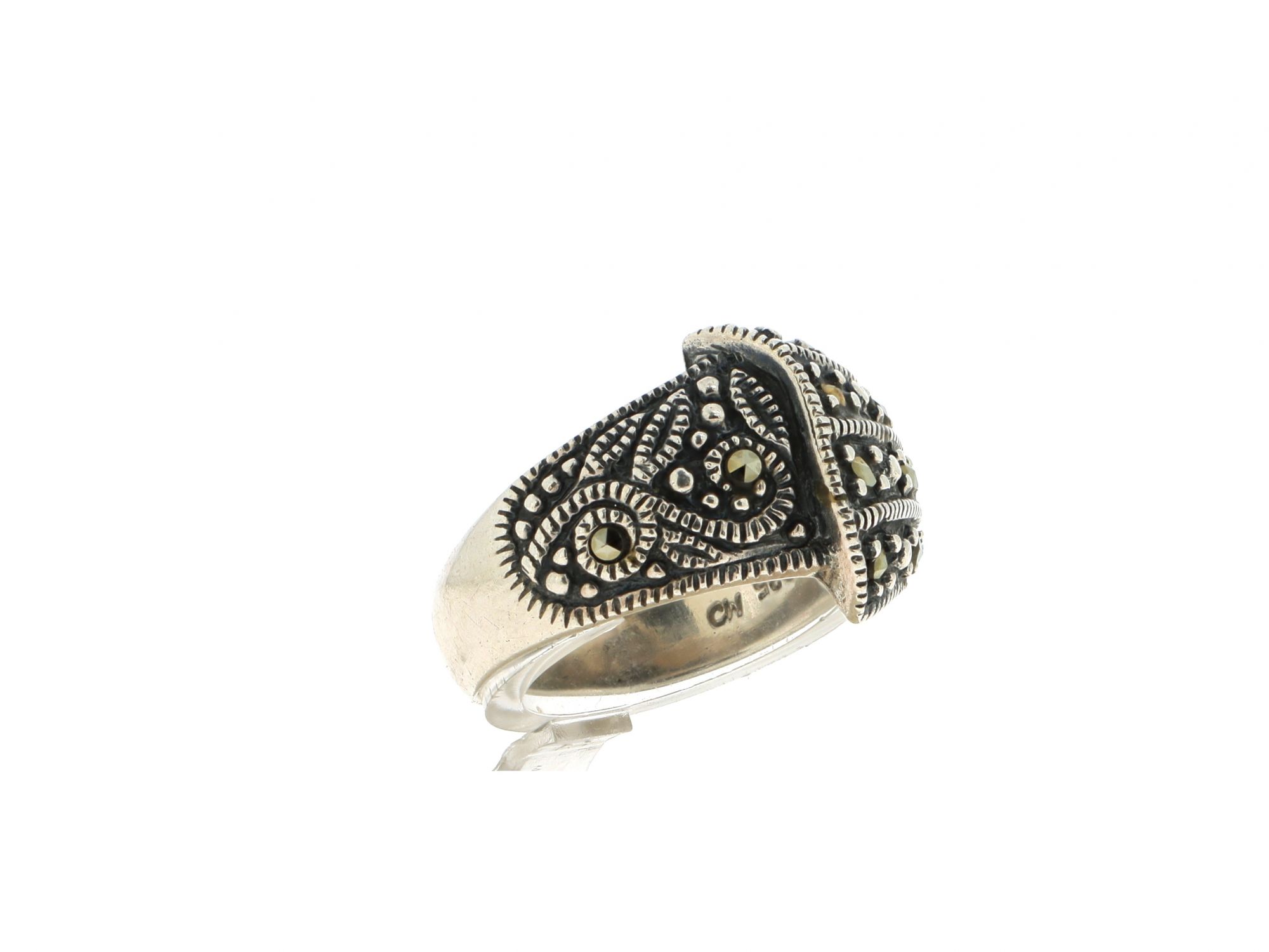 Lote 006 - Anel em Prata com marcassitas e um design floral, elaborado em PRATA 925. Estado de Conservação: Bom, sinais de uso. Contraste: Marca 925. (PRATA - ao abrigo do Decreto Lei 120/2017, artigo 3.º, alínea x). Tam.: 17. Medidas (CxLxA): 1,9*1,5*2,2cm. Peso Total: 4,77g.