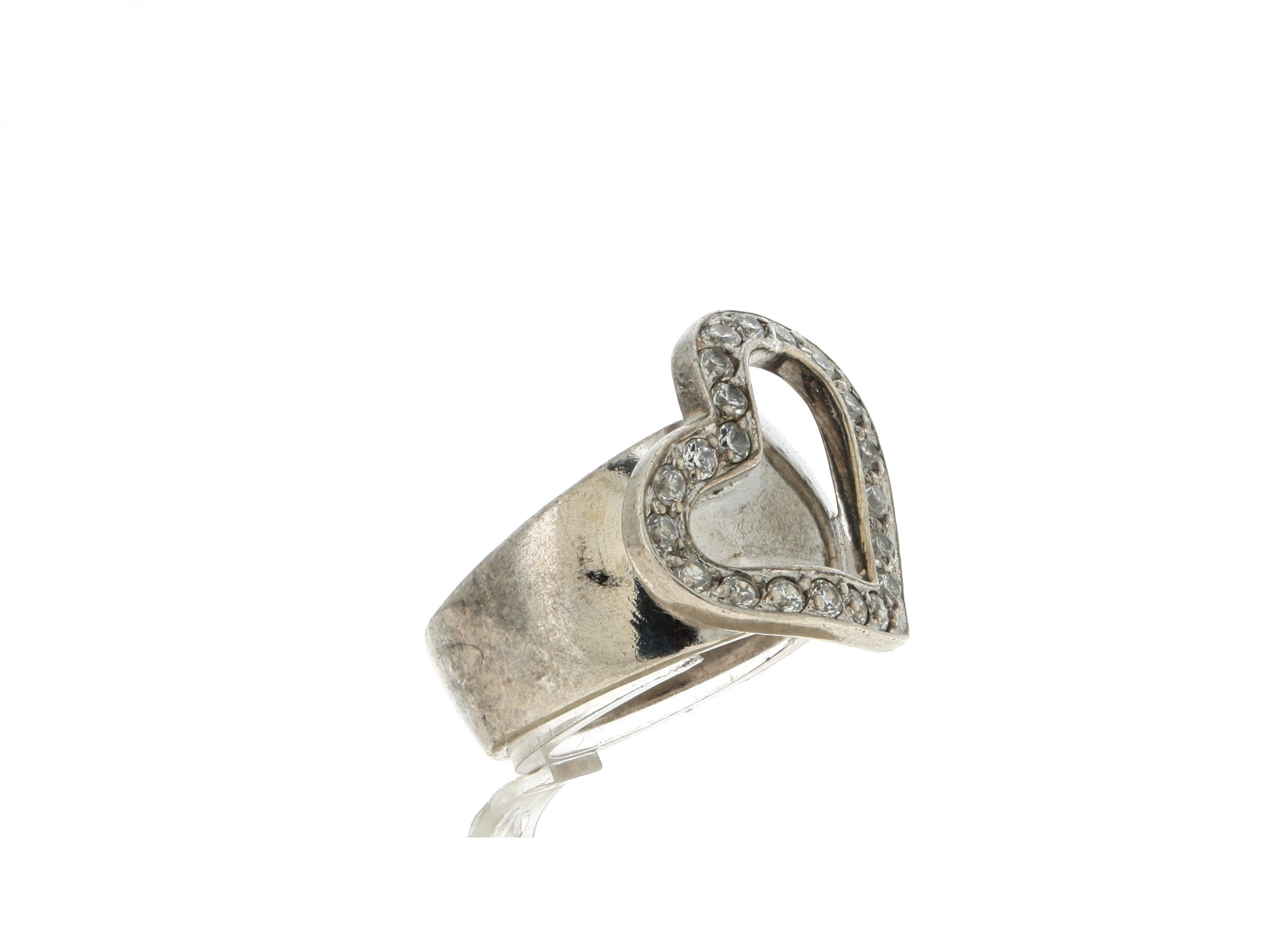 Lote 013 - Anel em Prata polido largo, com topo em coração cravejado com zicórnias incolores, elaborado em PRATA 925. Estado de Conservação: Bom, sinais de uso. Contraste: Cabeça de Águia virada à esquerda 925 (1985-2020 - ao abrigo do Decreto Lei 120/2017, artigo 3.º, alínea y). Tam.: 11,5. Medidas (CxLxA): 1,9*1,9*2,1cm. Peso Total: 9,5g.