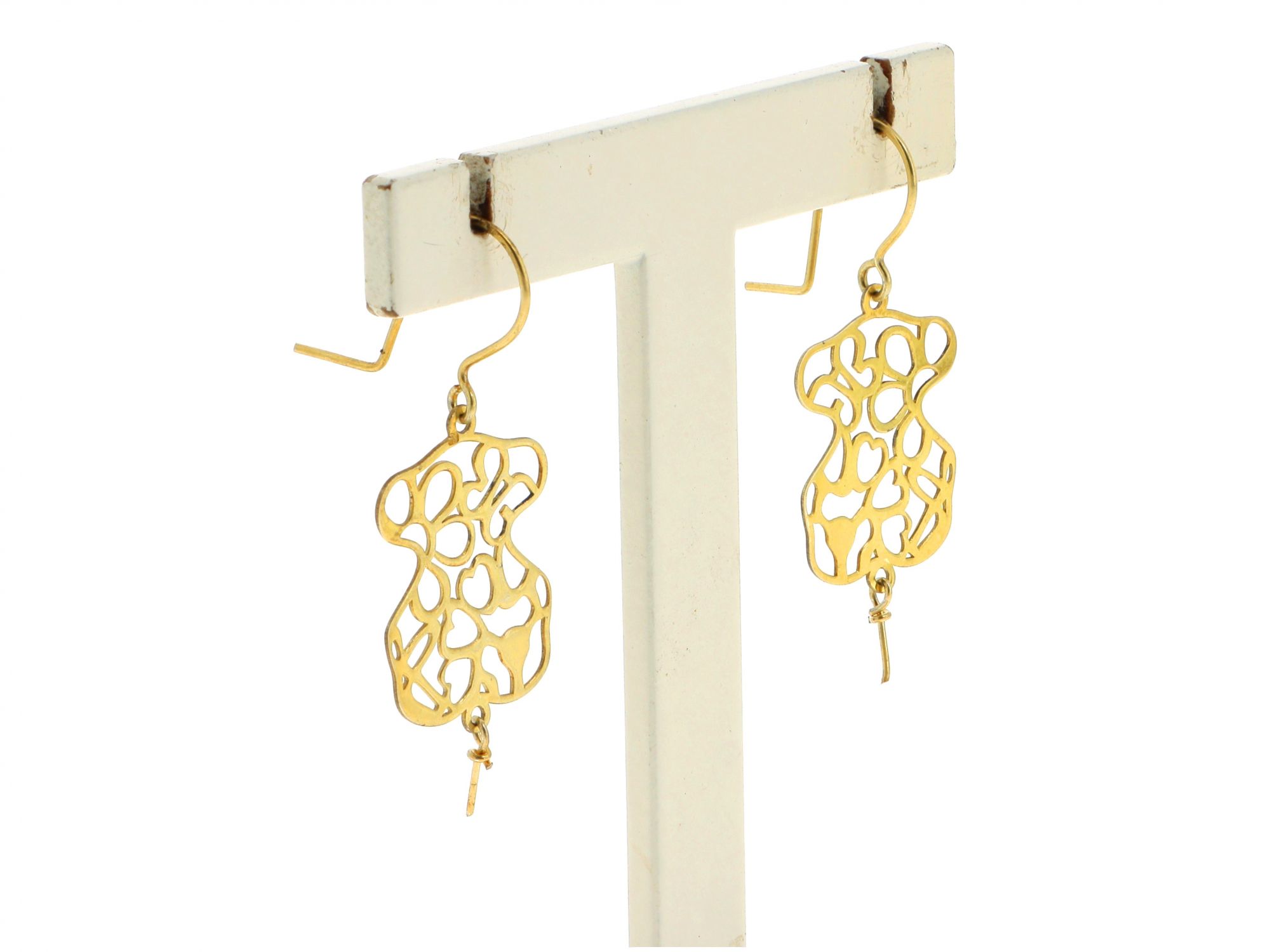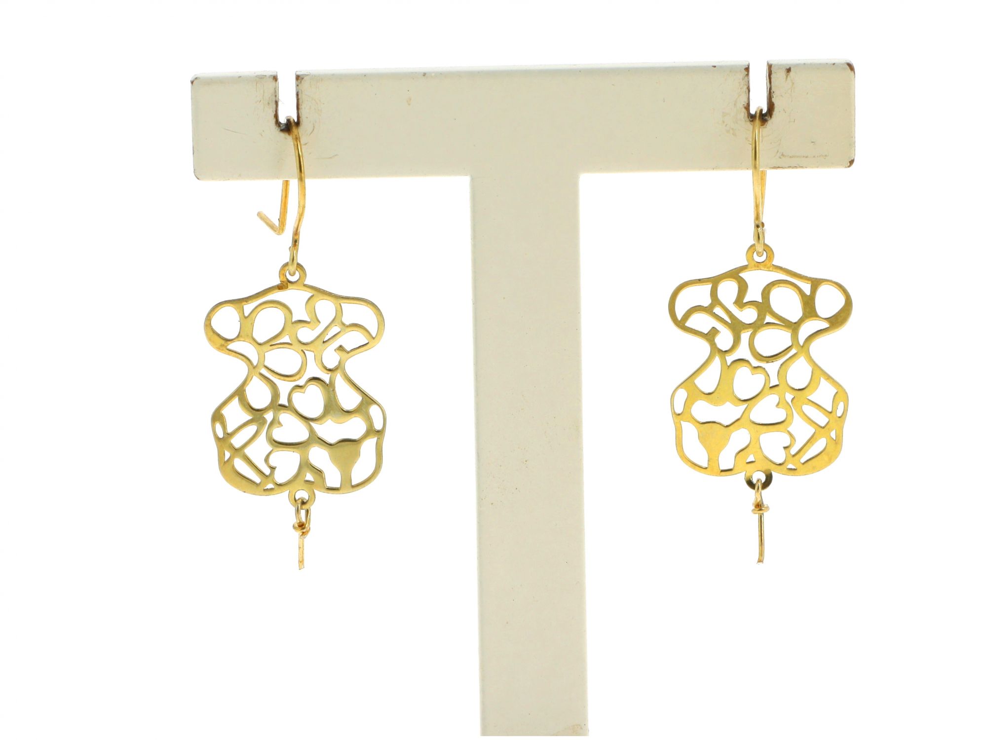Lote 005 - Brincos em Prata Dourada de gancho, estilo TOUS, com centro recortado em flores, elaborado em PRATA 925. Estado de Conservação: Bom, sinais de uso. Contraste: Marca de Ourives. (ao abrigo do Decreto Lei 120/2017, artigo 3.º, alínea z). artigo 9.º, alínea 4 peso da prata ≤ 2 gramas). Medidas (CxL): 4,2*1,7cm. Peso Total: 1,58g.