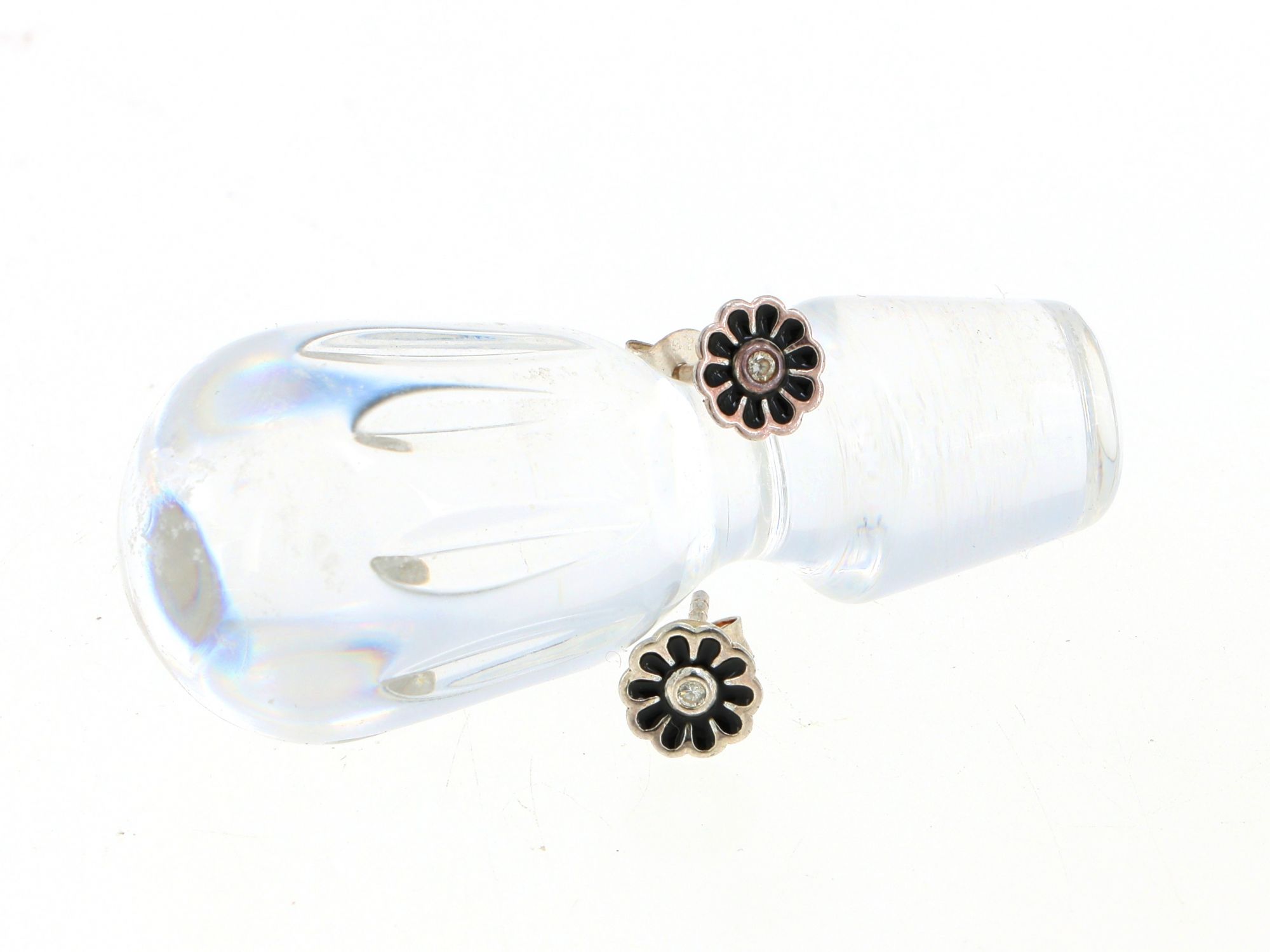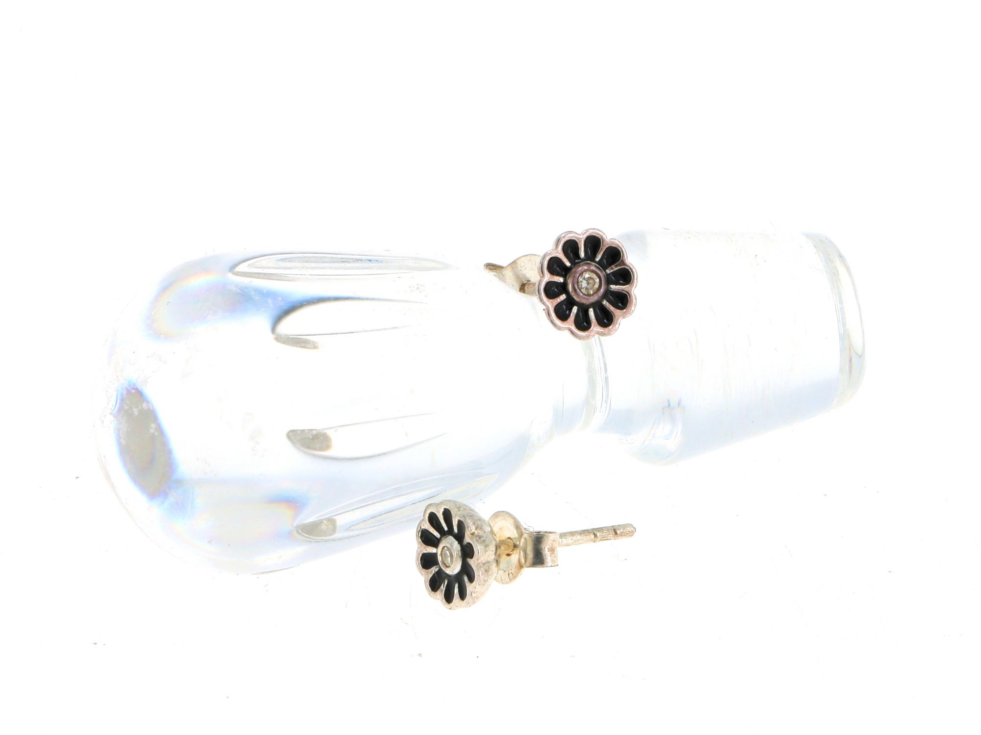 Lote 012 - Brincos SPJ em Prata com forma de Flor Margarida, de pétalas esmaltadas em preto e centro com zicórnia cúbica incolor, elaborado em 925. Estado de Conservação: Muito Bom. Contraste: Marca 925. (PRATA - ao abrigo do Decreto Lei 120/2017, artigo 3.º, alínea x). Medidas (Larg): 0,6cm. Peso Total: 1,59g.