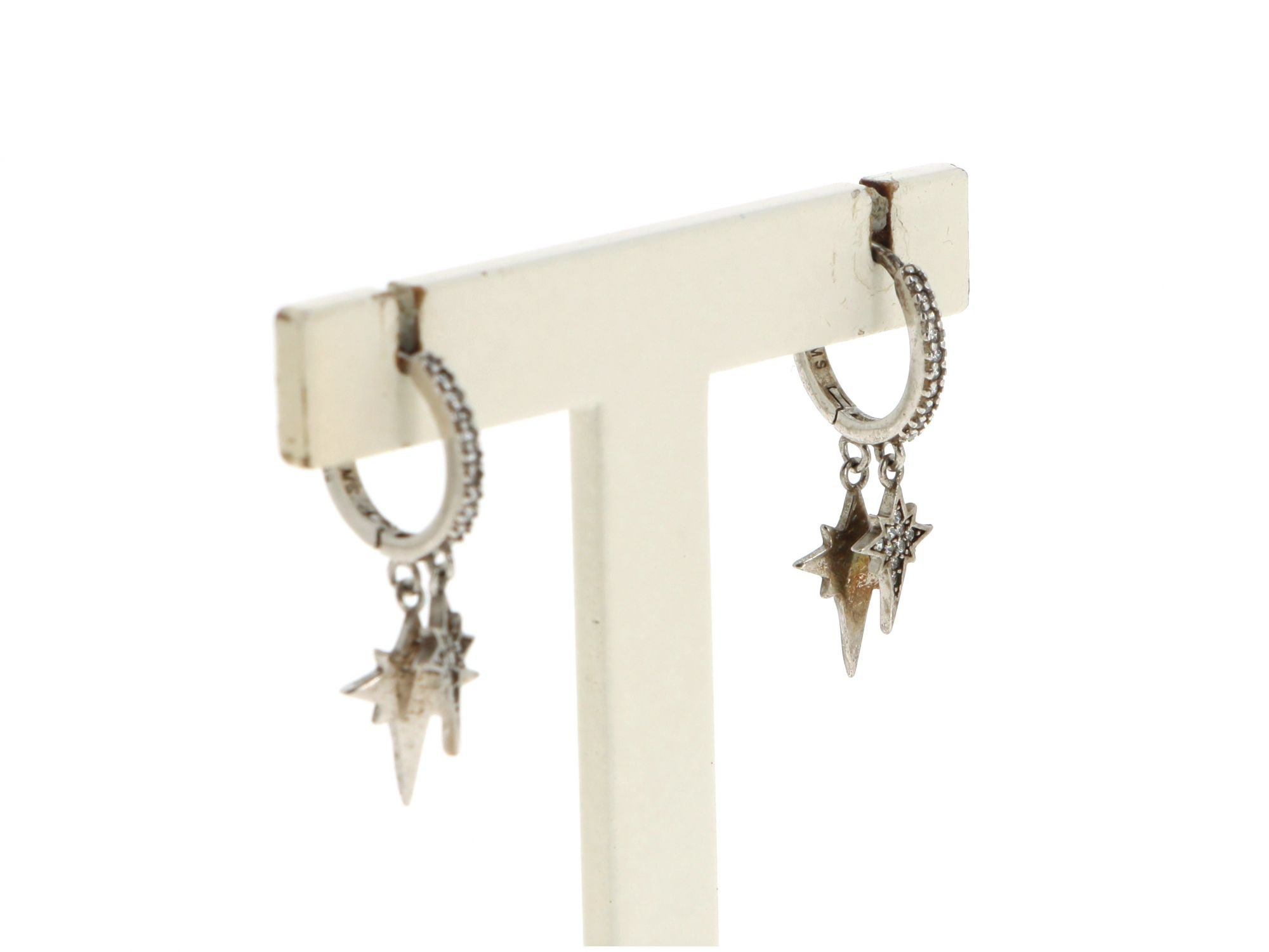 Lote 015 - Argolas em Prata pequenas, com frente cravejada com brilhantes e dois pingentes em forma de Estrela cadente, elaborado em PRATA 925. Estado de Conservação: Bom, sinais de uso. Contraste: Marca 925. (PRATA - ao abrigo do Decreto Lei 120/2017, artigo 3.º, alínea x). Medidas (Comp): 2,8*cm. Peso Total: 2,98g.