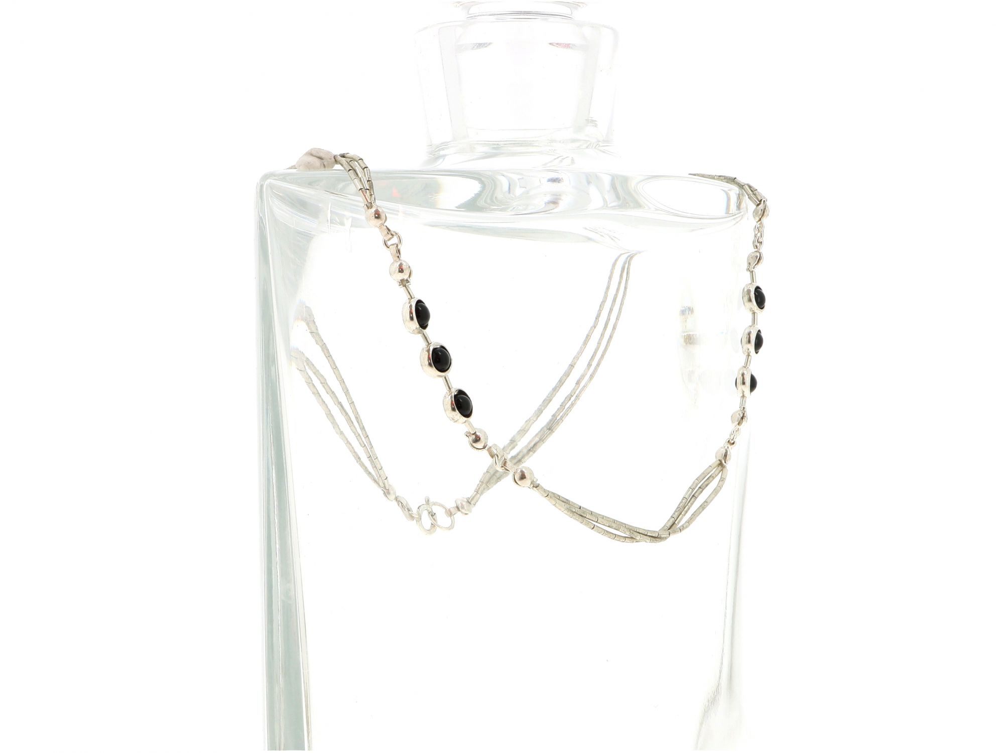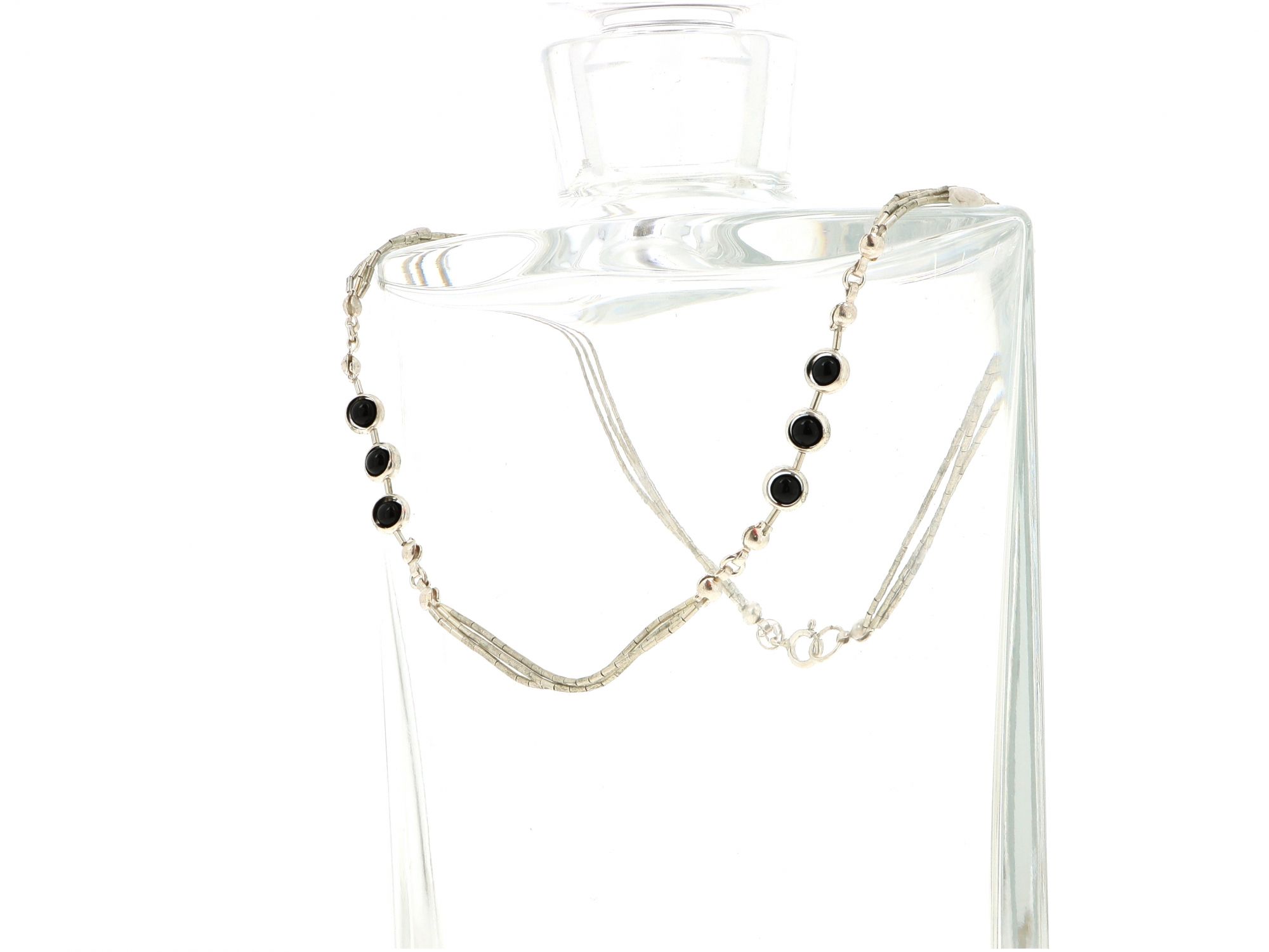 Lote 019 - Gargantilha em Prata de malha canutilho triplo, intercalada com três círculos de pedra preta, elaborado em PRATA 925. Estado de Conservação: Muito Bom, ligeiros sinais de uso. Contraste: Cabeça de Águia virada à esquerda 925 (1985-2020 - ao abrigo do Decreto Lei 120/2017, artigo 3.º, alínea y). Medidas (Comp): 39cm. Peso Total: 7,17g.
