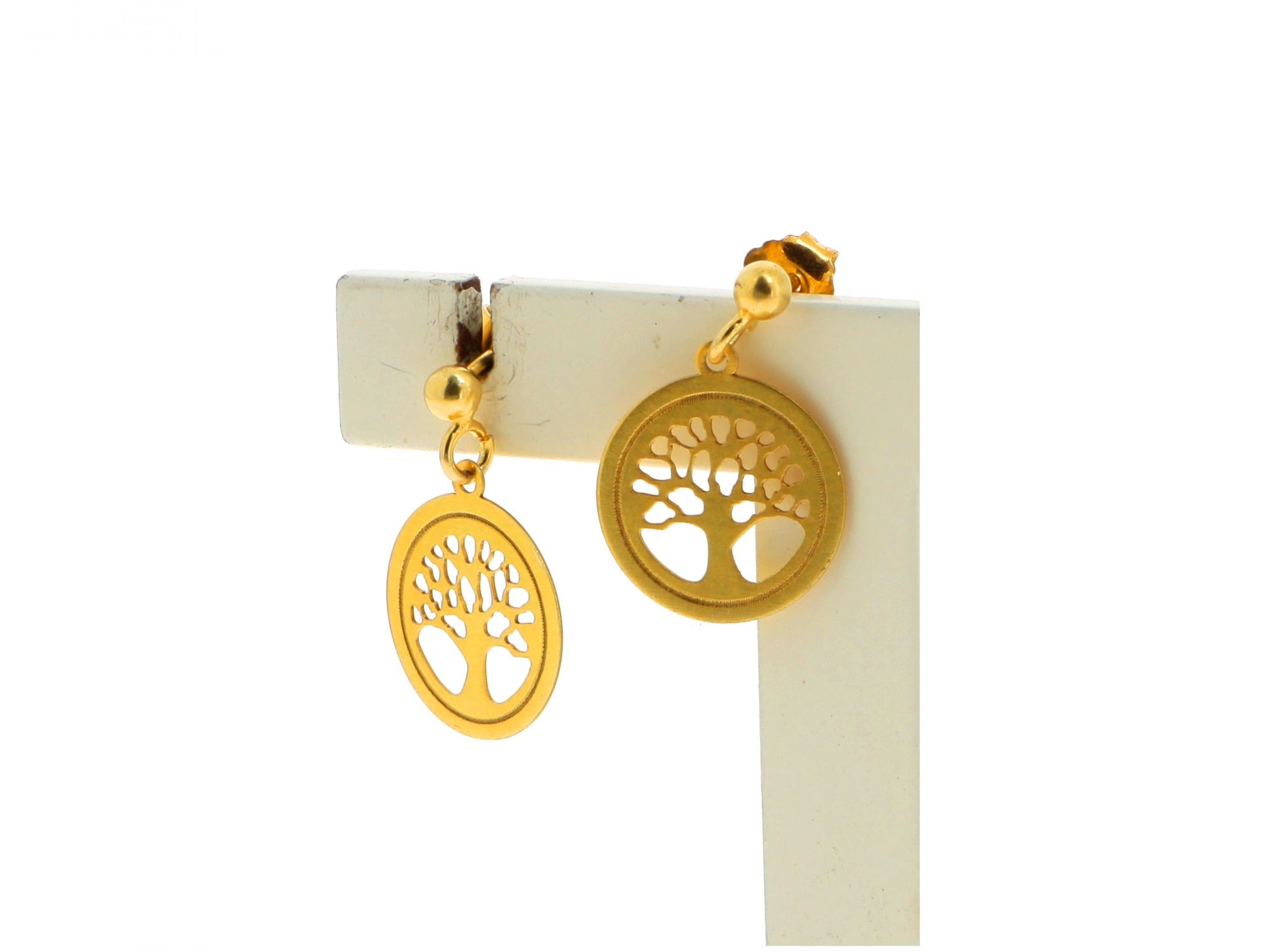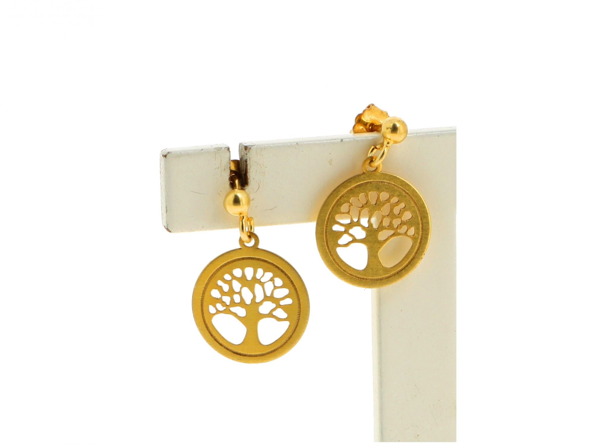 Lote 022 - Brincos em Prata Dourada de pingente redondo com árvore da vida, elaborado em PRATA 925. Estado de Conservação: Bom. Contraste: Marca de Ourives. (ao abrigo do Decreto Lei 120/2017, artigo 3.º, alínea z). artigo 9.º, alínea 4 peso da prata ≤ 2 gramas). Medidas (CxL): 2*1,4cm. Peso Total: 1,21g.