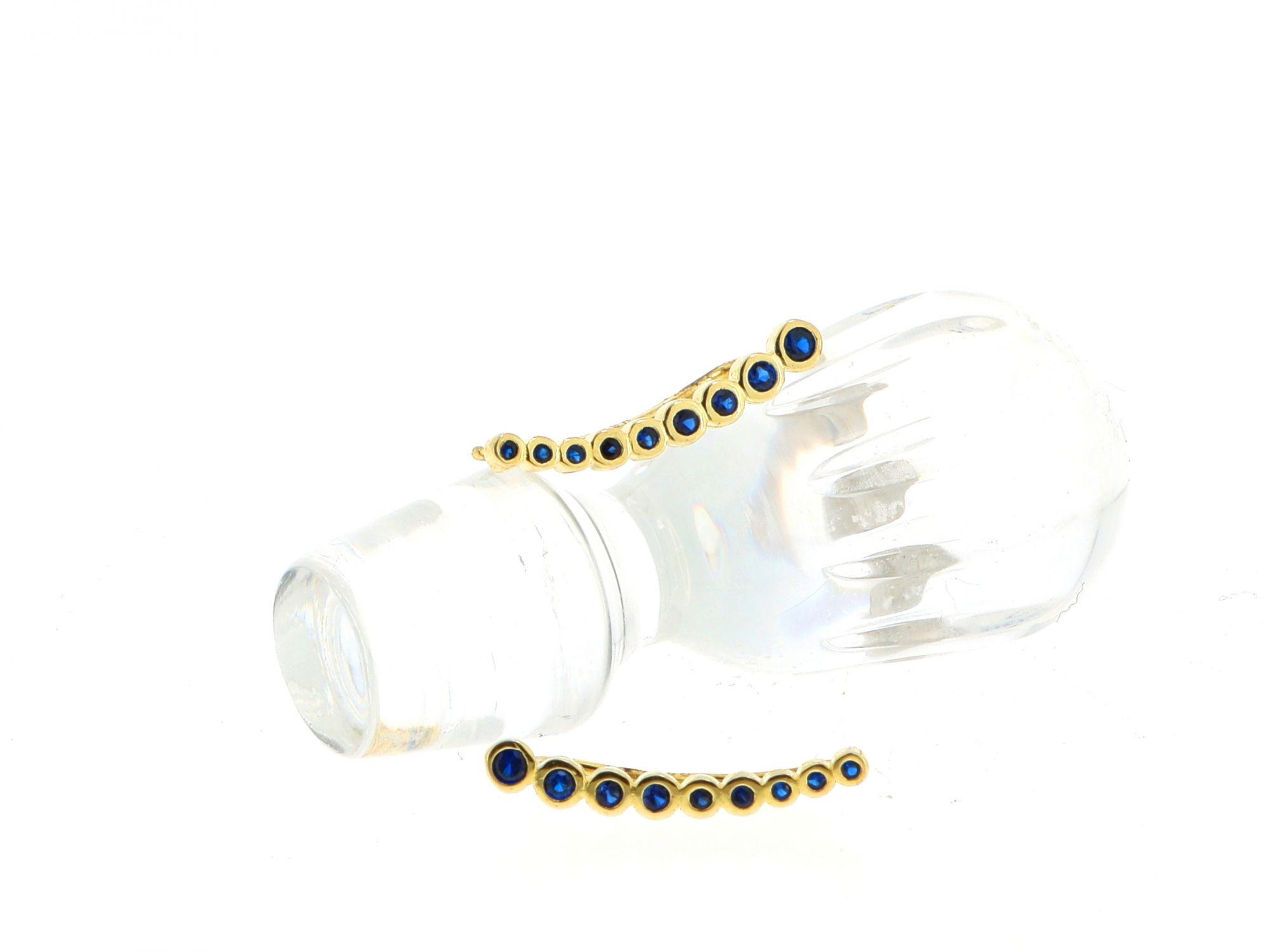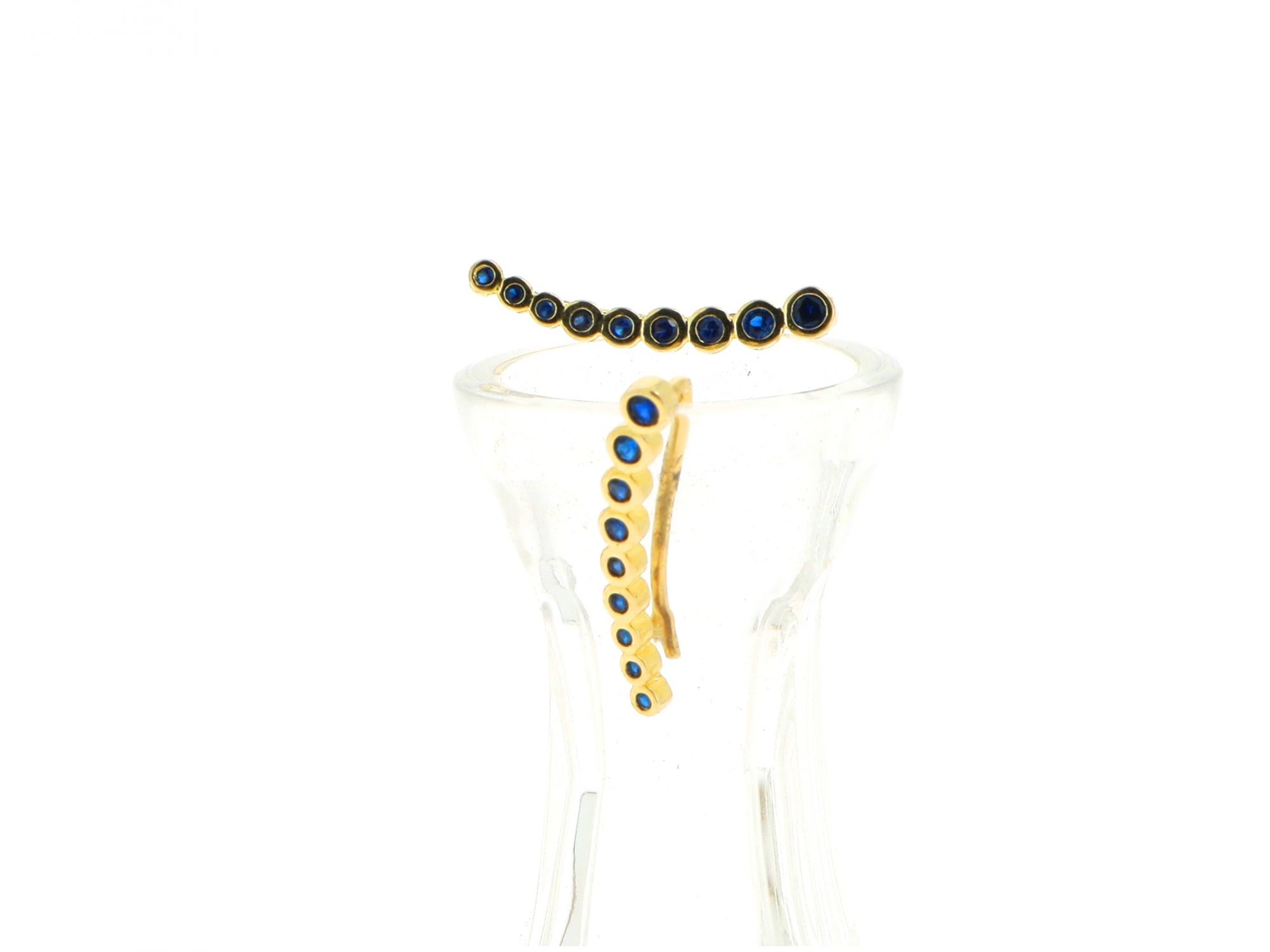 Lote 026 - Brincos em Prata Dourado compridos em círculos, cravejados com zicórnias azuis escuras, elaborado em PRATA 925. Estado de Conservação: Bom, sinais de uso. Contraste: Marca 925. (PRATA - ao abrigo do Decreto Lei 120/2017, artigo 3.º, alínea x). Medidas (Comp): 2cm. Peso Total: 1,28g.