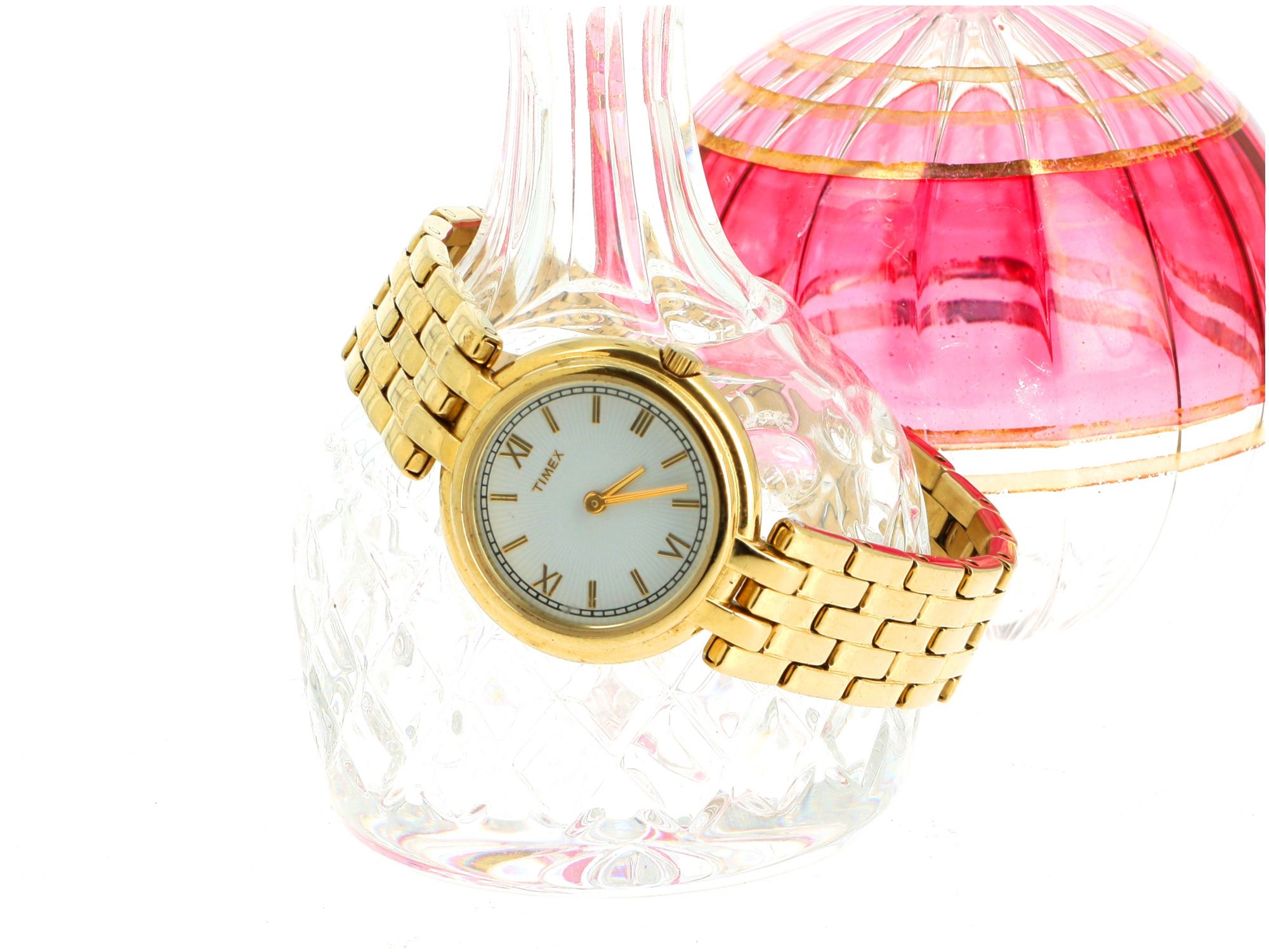 Lote 021 - Relógio TIMEX com mostrador branco, pontuação romana e aro e bracelete em elos todos dourados. Estado de Conservação: Bom. Medidas (Diâm): 2,8cm. Peso Total: 53,79g.