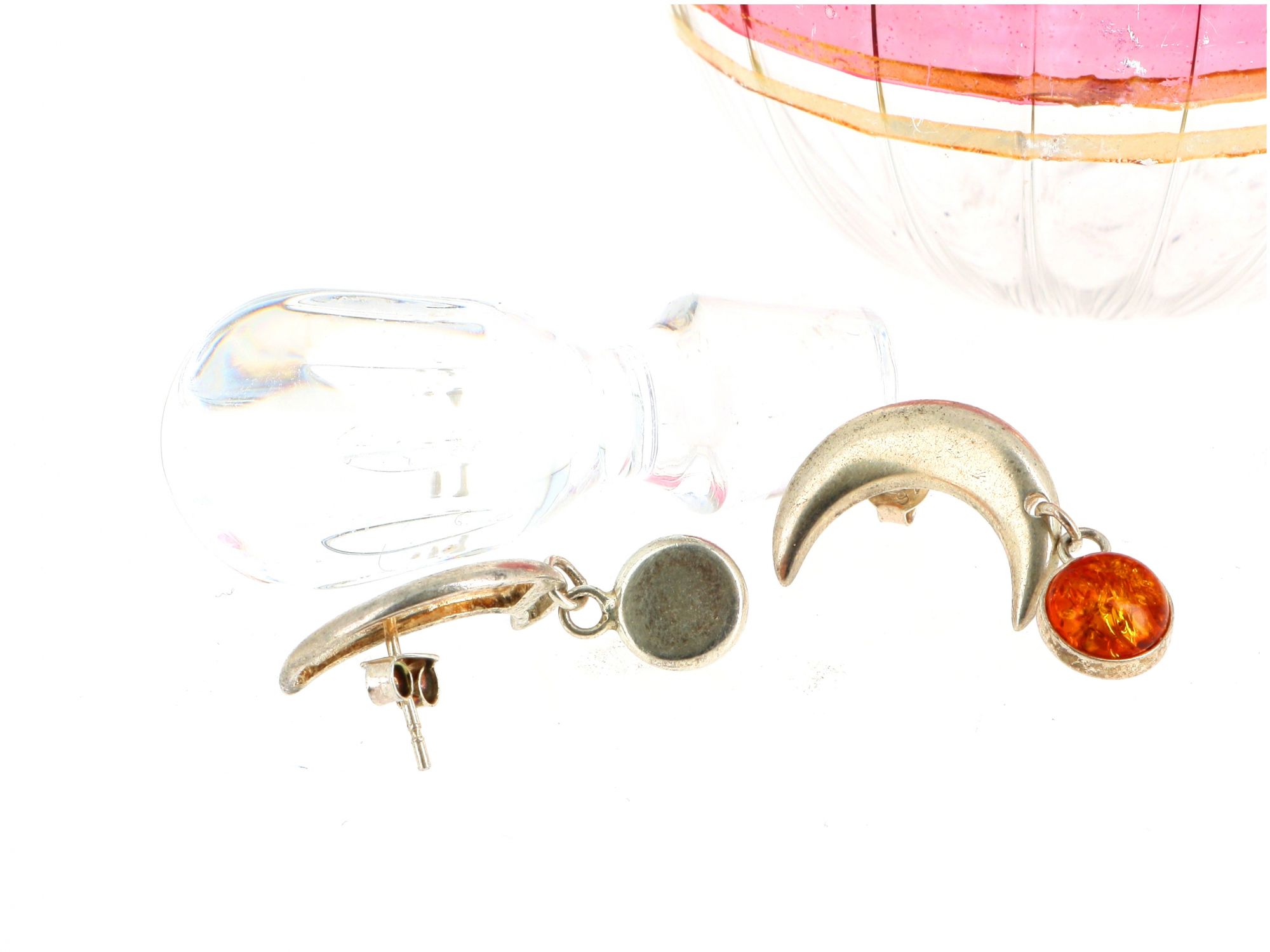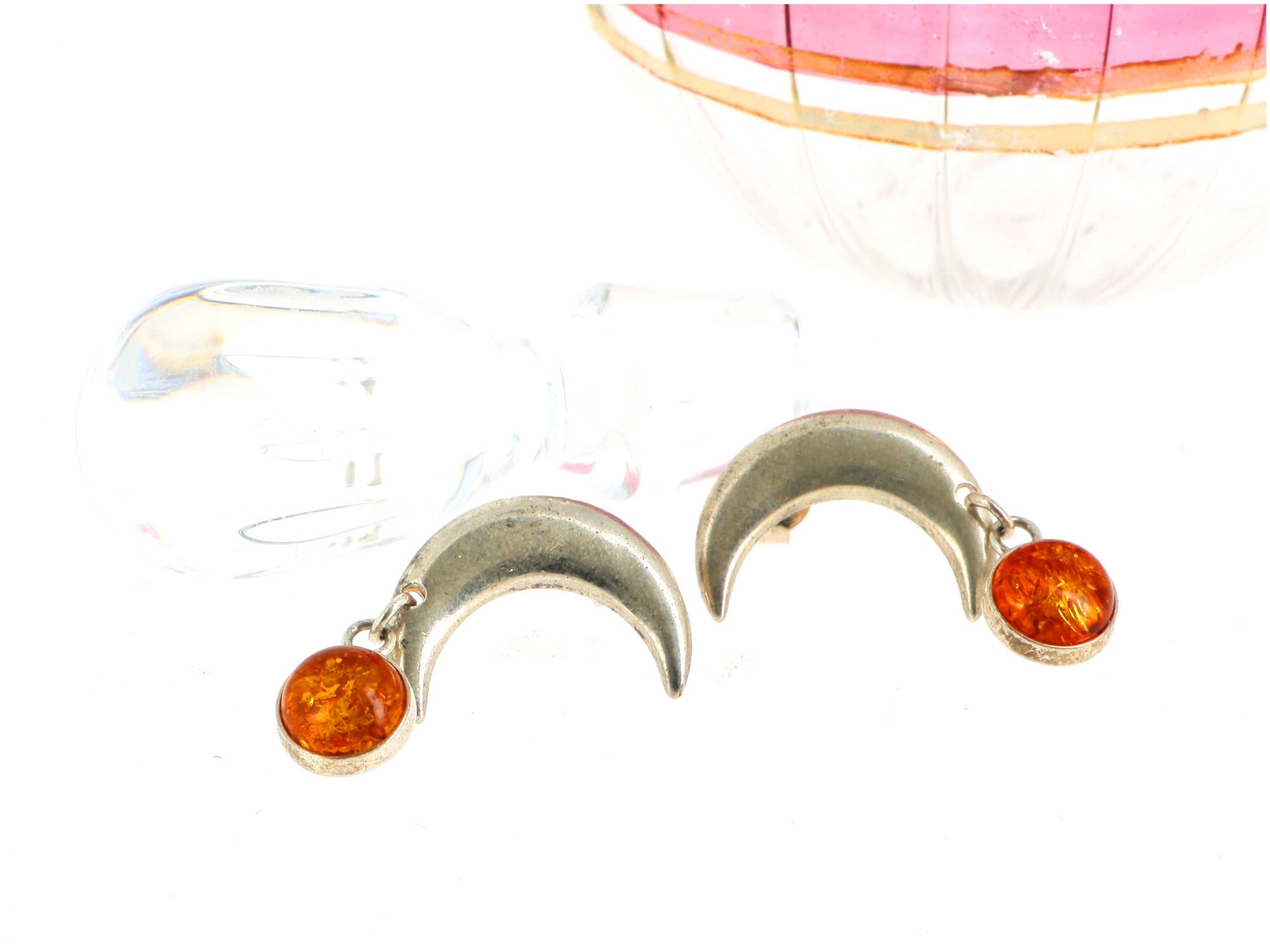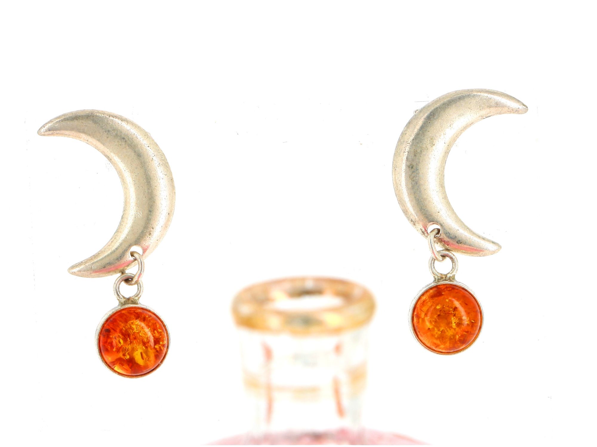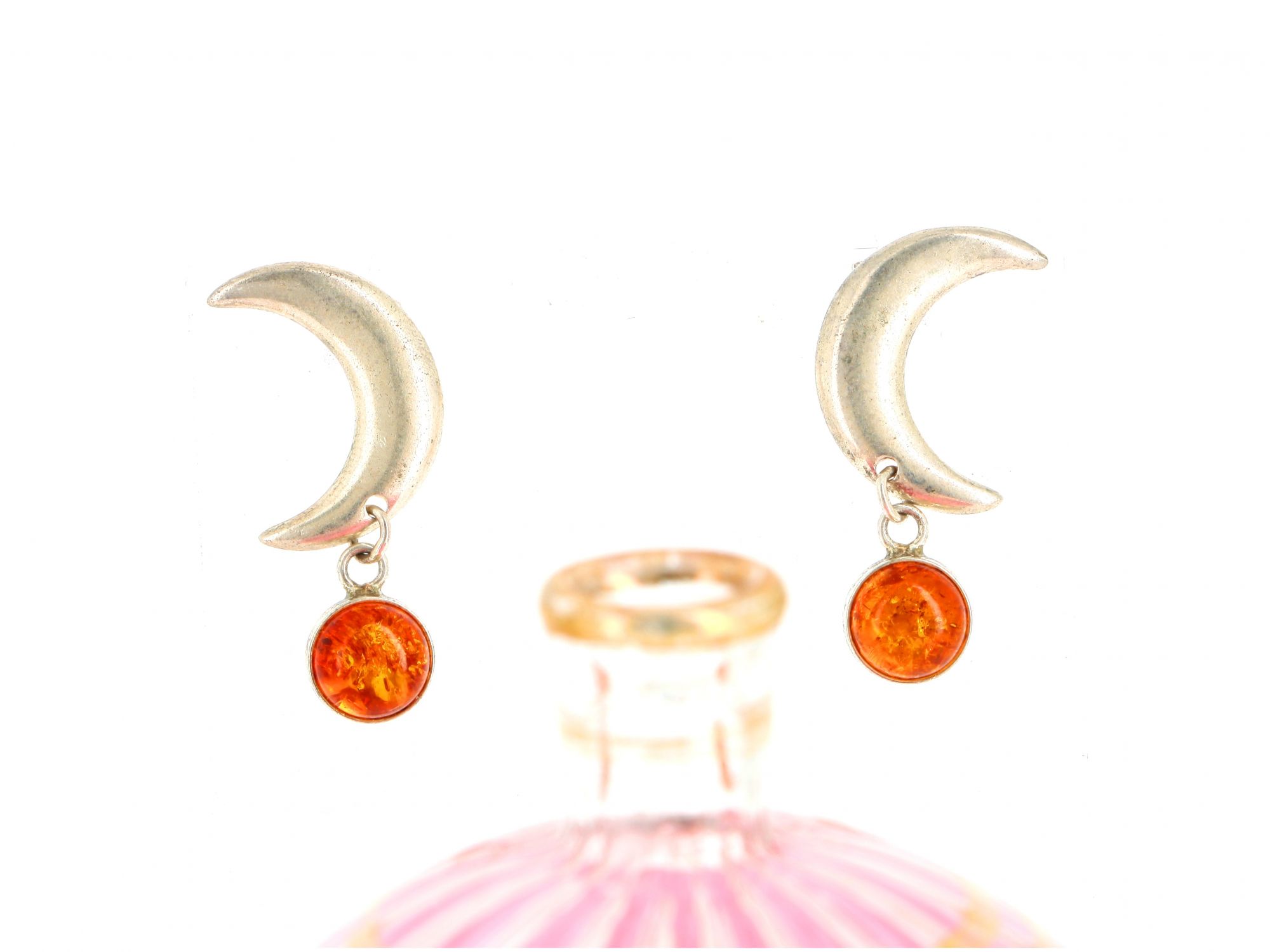 Lote 005 - Brincos em Prata de lua com pingentes redondos com âmbar, elaborado em PRATA 925. Estado de Conservação: Bom, sinais de uso. Contraste: Marca 925. (PRATA - ao abrigo do Decreto Lei 120/2017, artigo 3.º, alínea x). Medidas (CxL): 3*0,9cm. Peso Total: 4,79g.