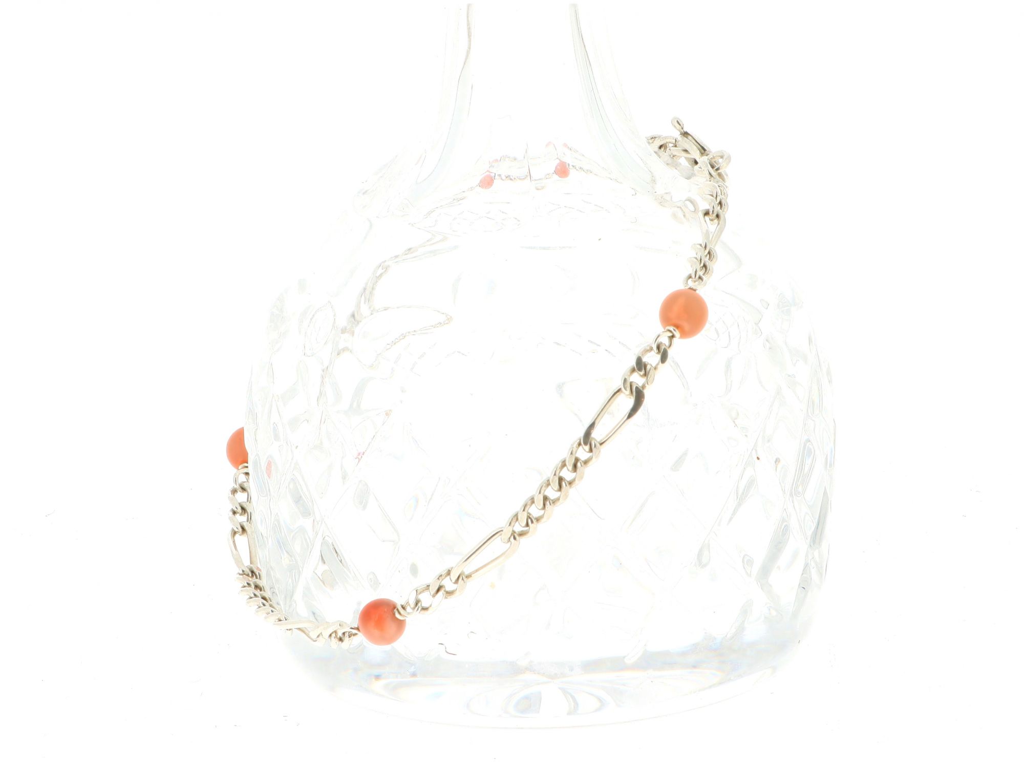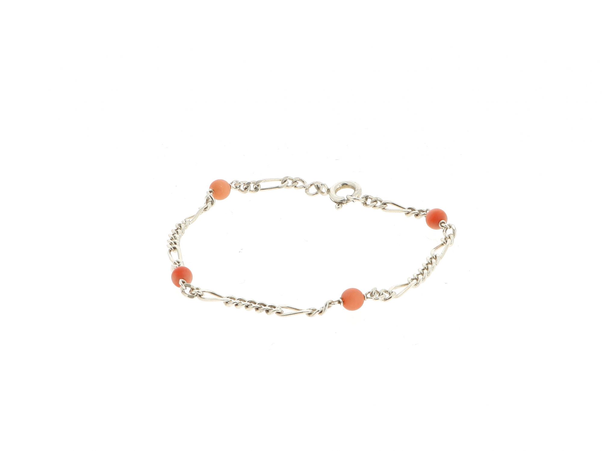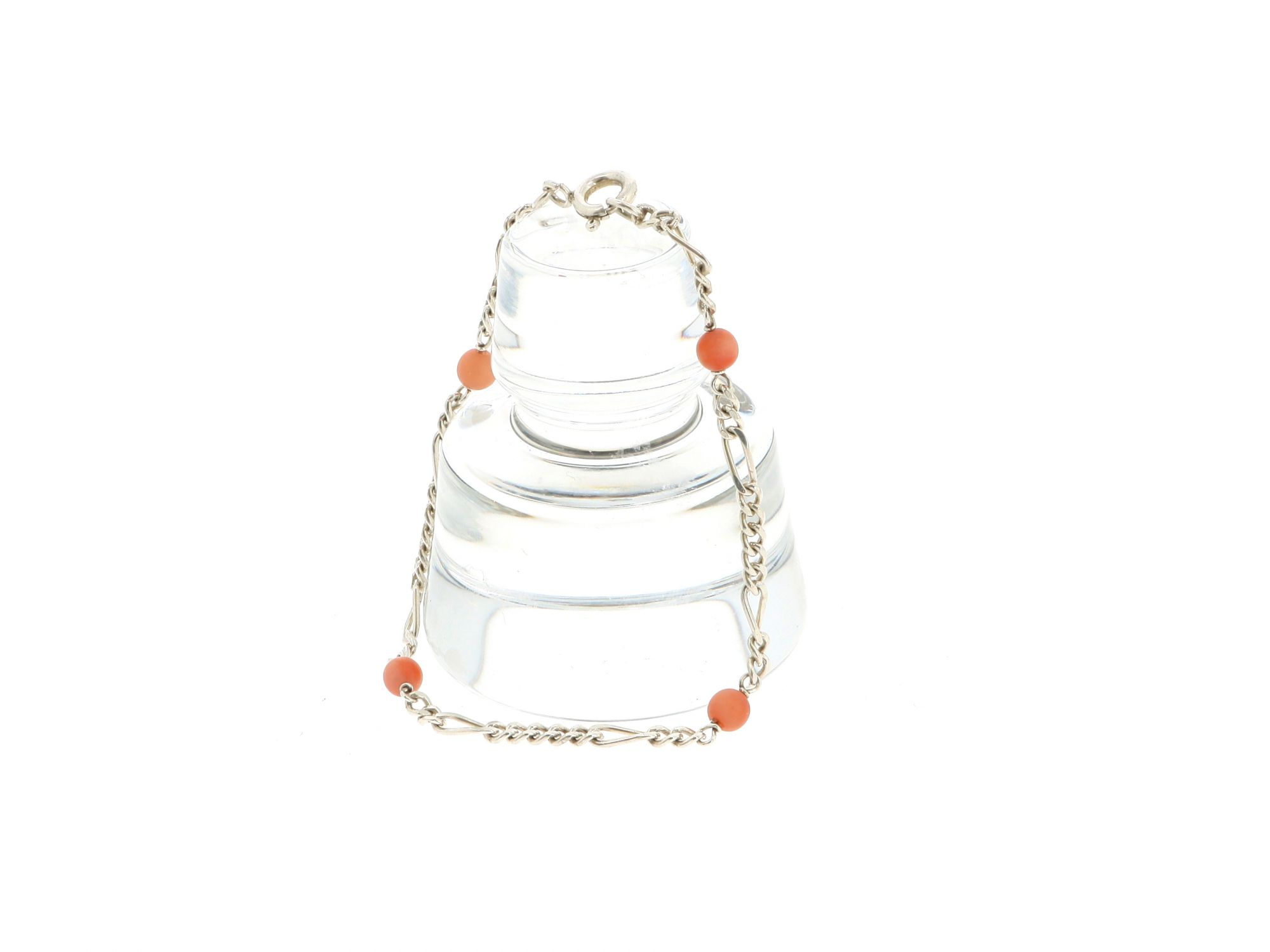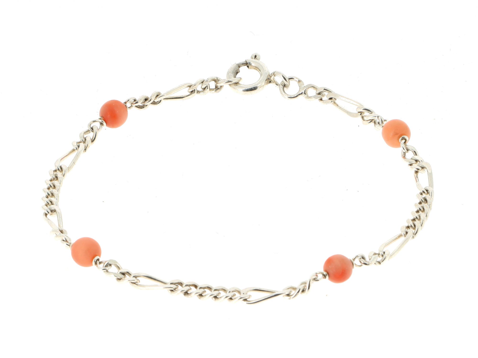 Lote 035 - Pulseira em Prata de malha longe e perto intercalada com bolas rosa e com fecho bóia, elaborado em PRATA 835. Estado de Conservação: Bom, sinais de uso. Contraste: Cabeça de Águia virada à direita 835 (1985-2020 - ao abrigo do Decreto Lei 120/2017, artigo 3.º, alínea y). Medidas (Comp): 18cm. Peso Total: 3,15g.