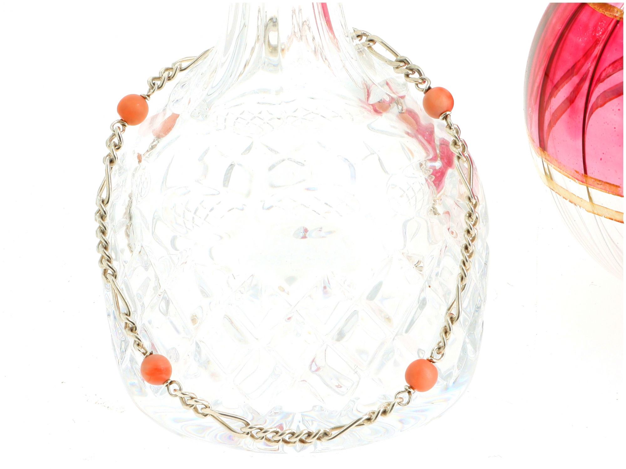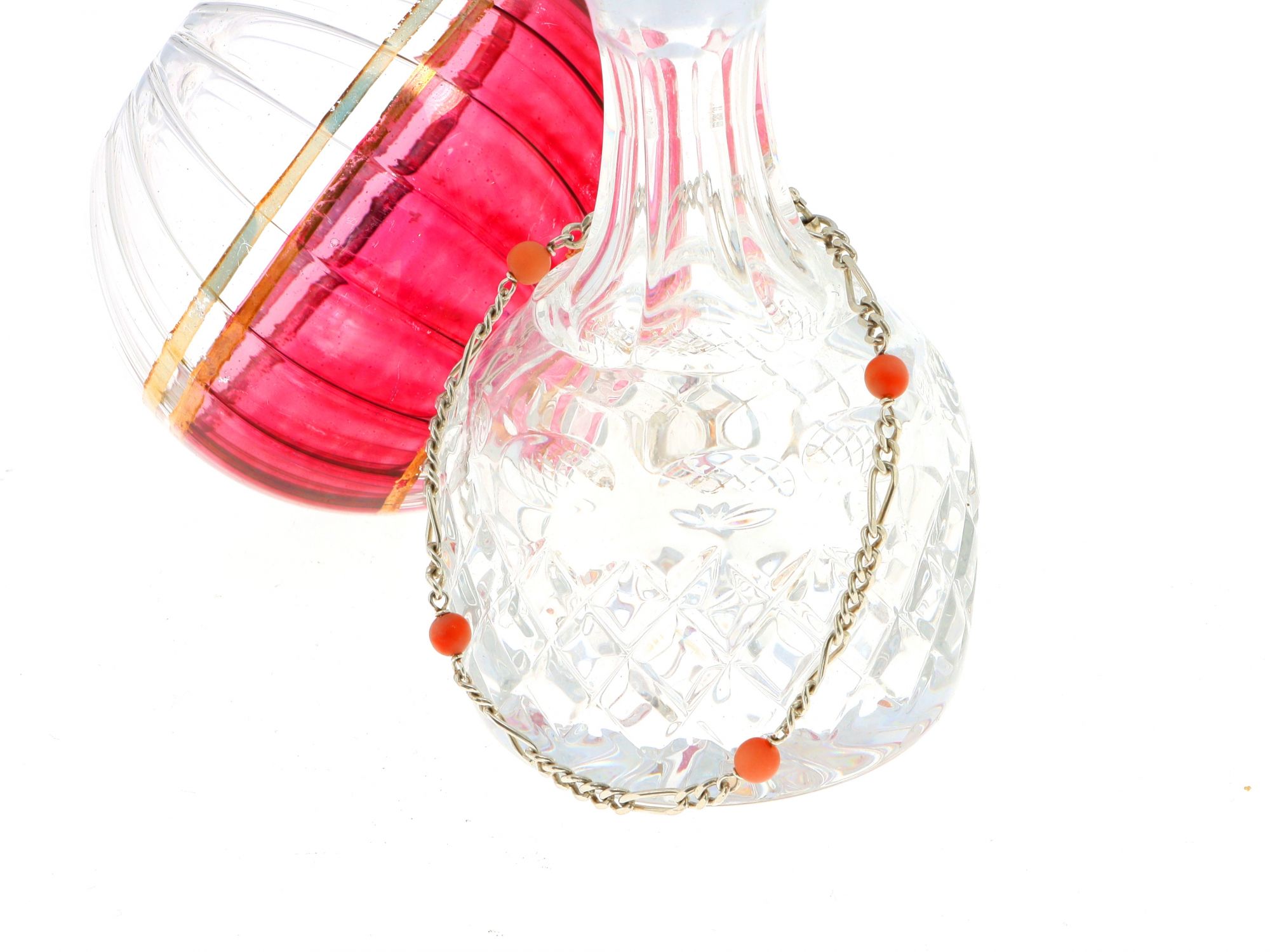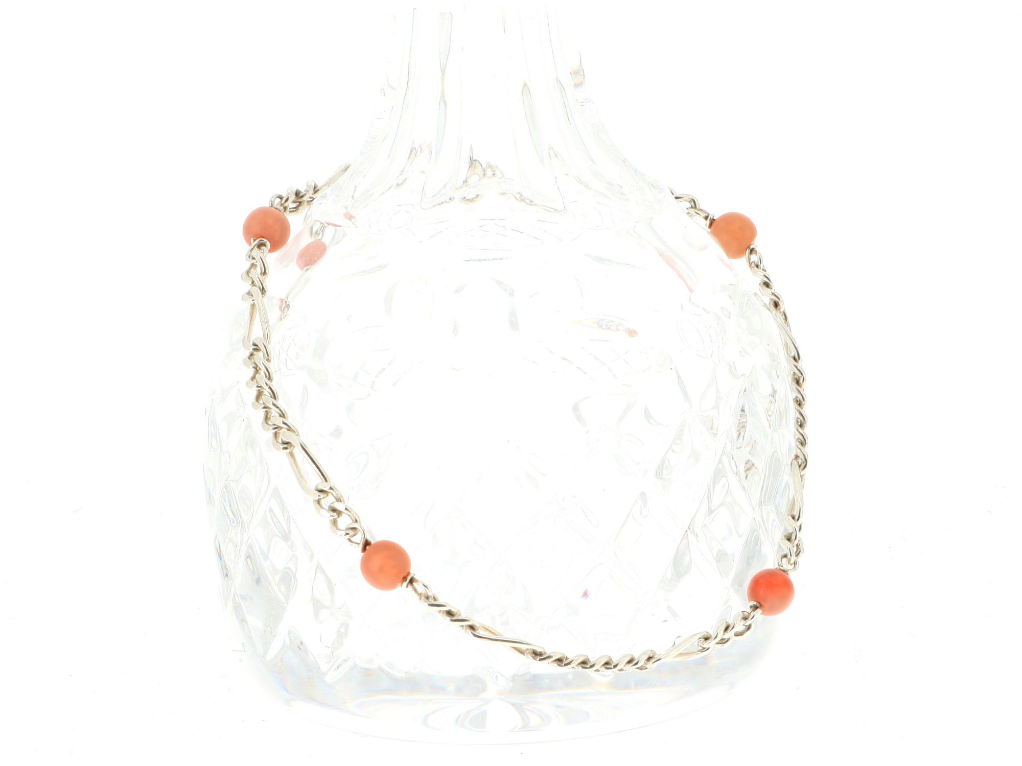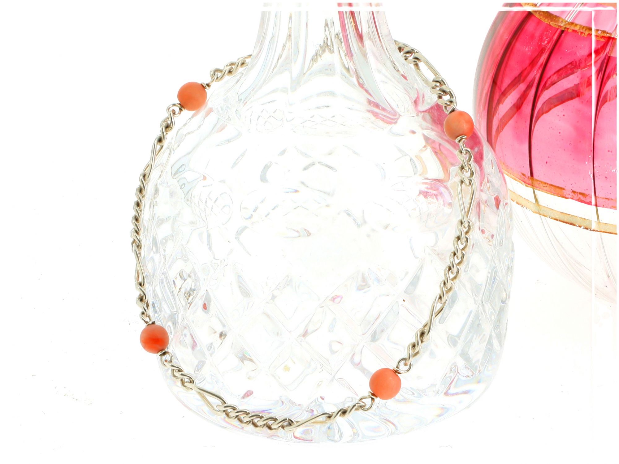 Lote 035 - Pulseira em Prata de malha longe e perto intercalada com bolas rosa e com fecho bóia, elaborado em PRATA 835. Estado de Conservação: Bom, sinais de uso. Contraste: Cabeça de Águia virada à direita 835 (1985-2020 - ao abrigo do Decreto Lei 120/2017, artigo 3.º, alínea y). Medidas (Comp): 18cm. Peso Total: 3,15g.