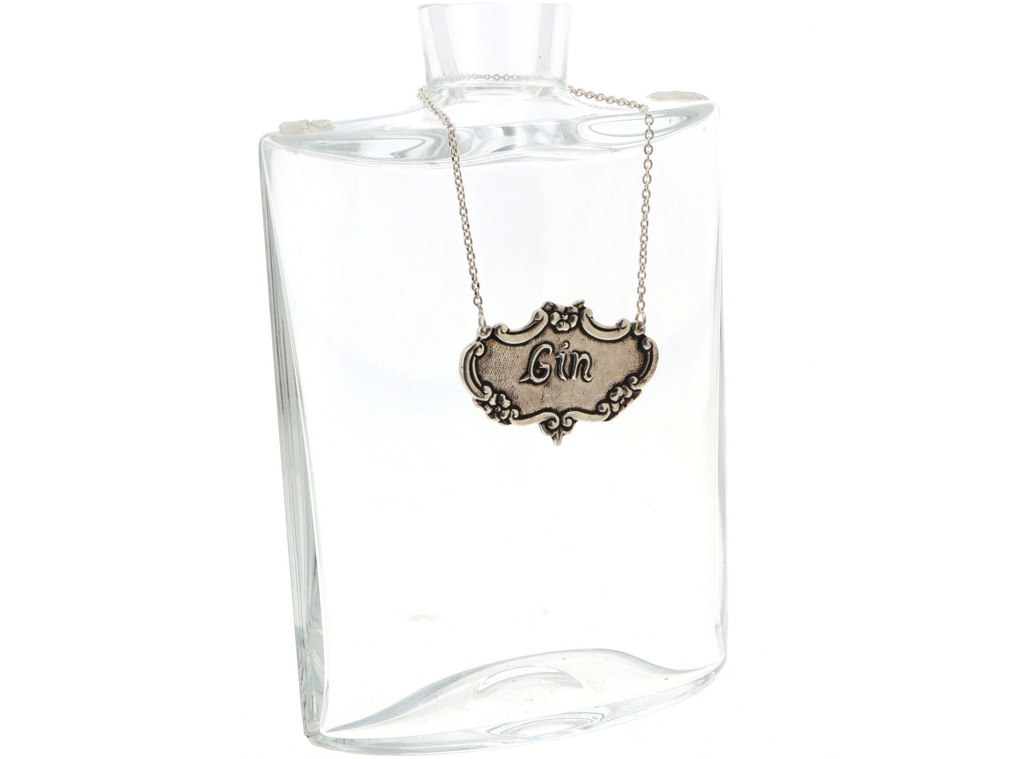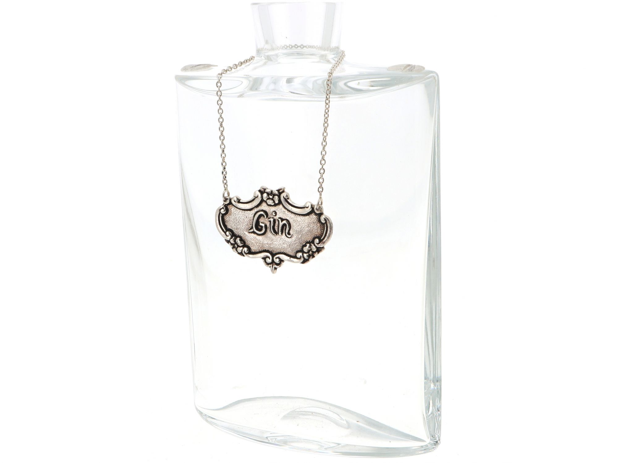 Lote 013 - Etiqueta para decantador de garrafas em Prata com chapa trabalhada floral e com gravação “GIN” e com corrente, elaborado em PRATA 835 Estado de Conservação: Bom. Contraste: Cabeça de Águia virada à direita 835 (1985-2020 - ao abrigo do Decreto Lei 120/2017, artigo 3.º, alínea y).Medidas (CxL): 5*3.5cm. Peso Total: 14,02g.