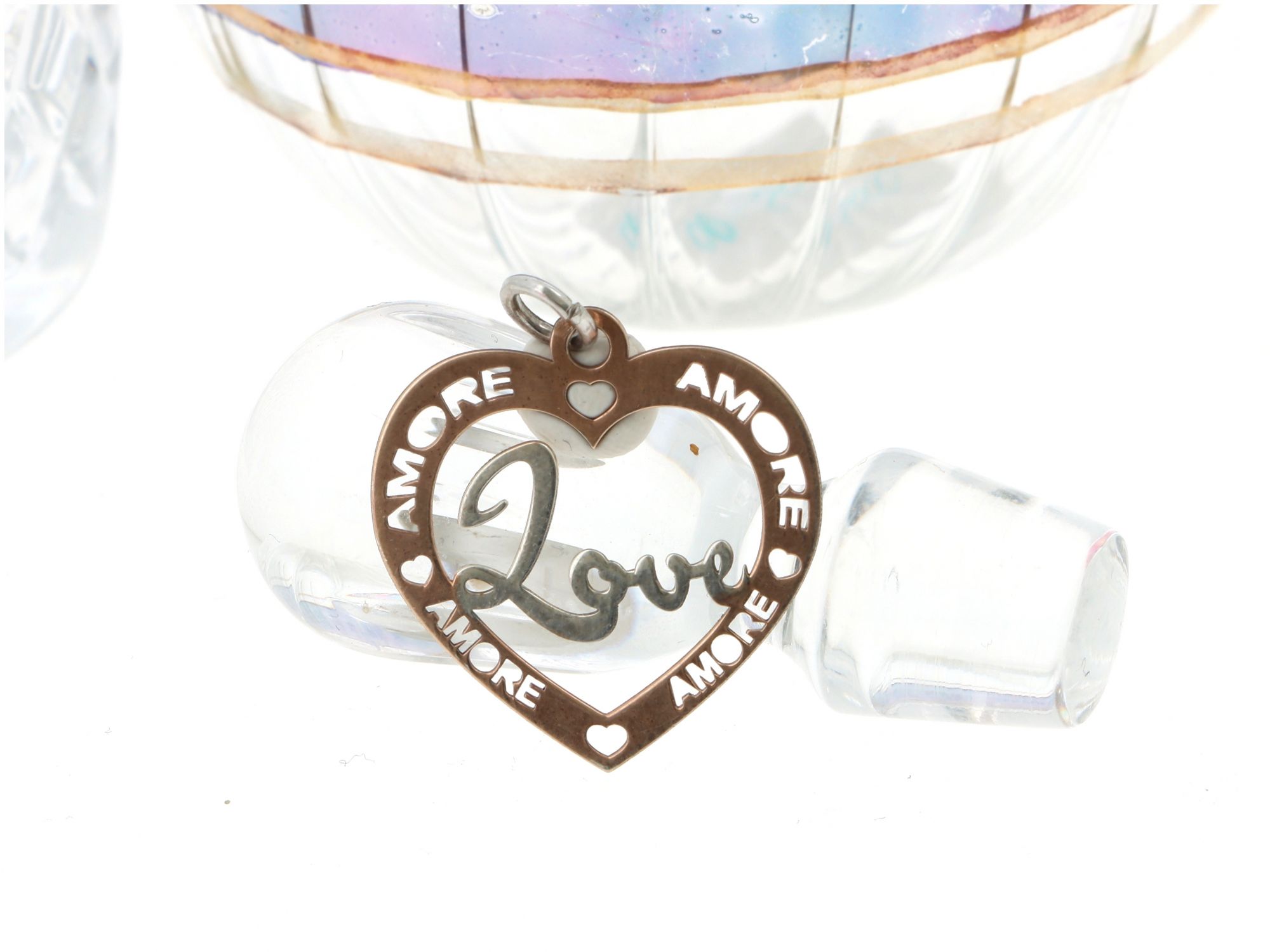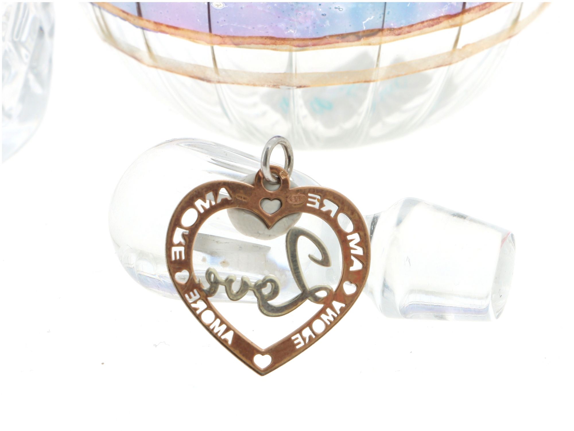 Lote 023 - Pendente elaborado em prata dourada 925 em formato de Coração, com as palavras "Love" e "Amore" Estado de Conservação: Muito Bom. Contraste: Marca 925. (PRATA - ao abrigo do Decreto Lei 120/2017, artigo 3.º, alínea x).Medidas (CxL): 2.5*2.5cm. Peso Total: 1,23g.