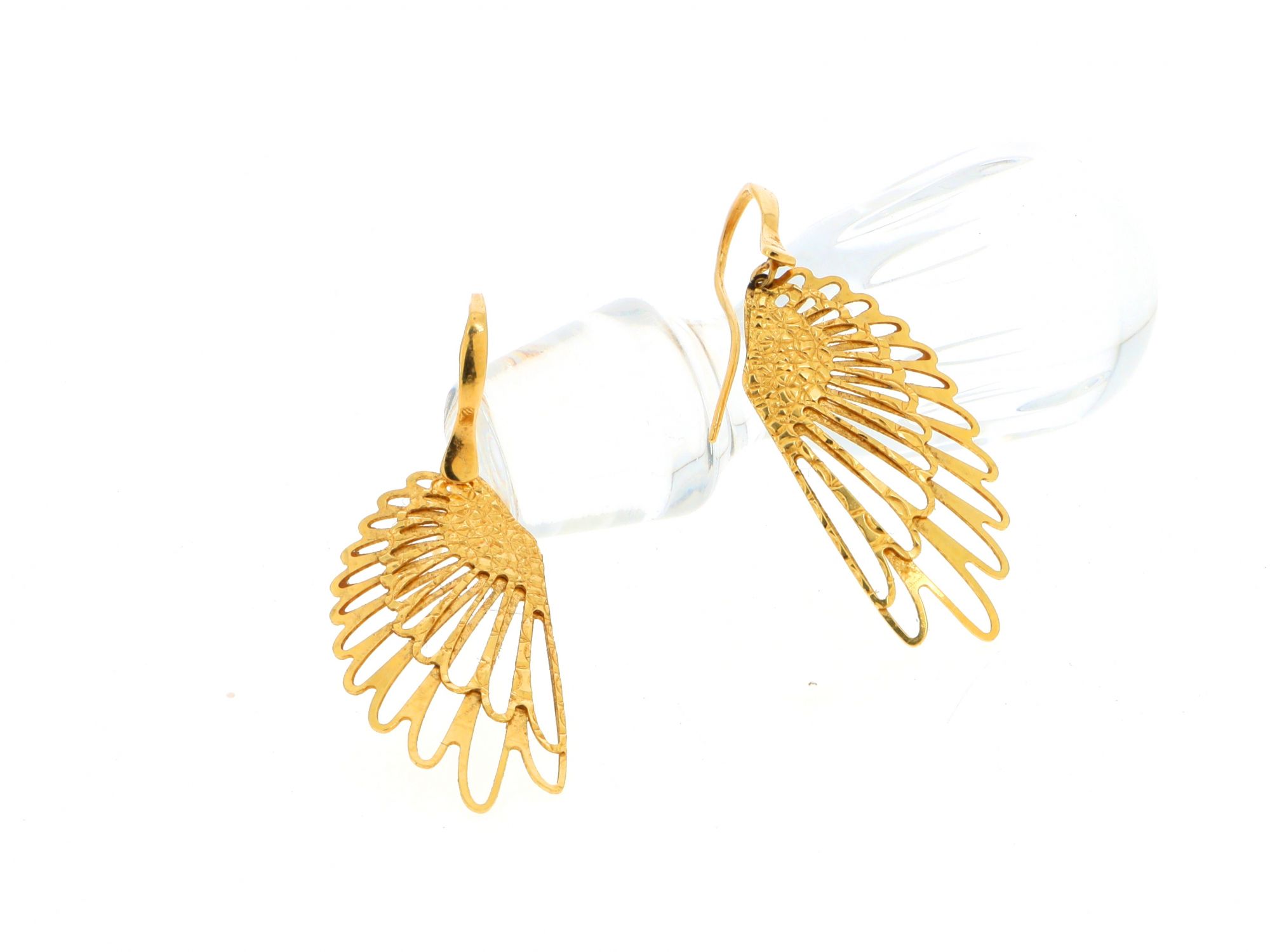 Lote 003 - Brincos em Ouro de gancho em formato de Asas trabalhadas a cinzel, elaborado em OURO 18 QUILATES. Estado de Conservação: Bom. Contraste: Marca 750. (OURO - ao abrigo do Decreto Lei 120/2017, artigo 3.º, alínea x). Medidas (CxL): 4*1,5cm. Peso Total: 2,8g.