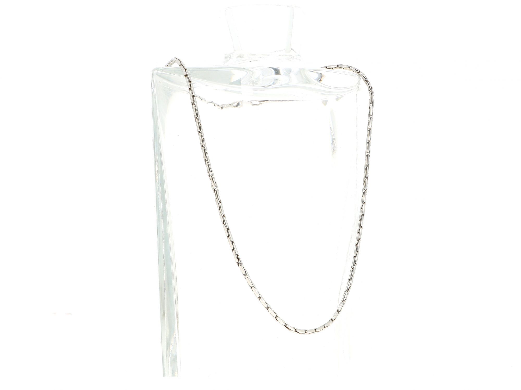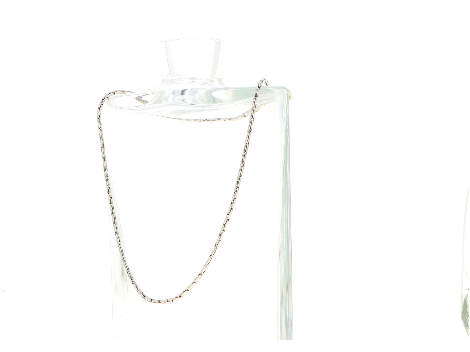 Lote 010 - Gargantilha em Ouro Branco de malha Rabo de Rato com fecho bico de papagaio, elaborado em OURO 19,2 QUILATES. Estado de Conservação: Muito Bom. Contraste: Cabeça de Veado 800 (OURO - 1985-2020, ao abrigo do Decreto Lei 120/2017, artigo 3.º, alínea y). Medidas (Comp): 41,5cm. Peso Total: 7.13gr.