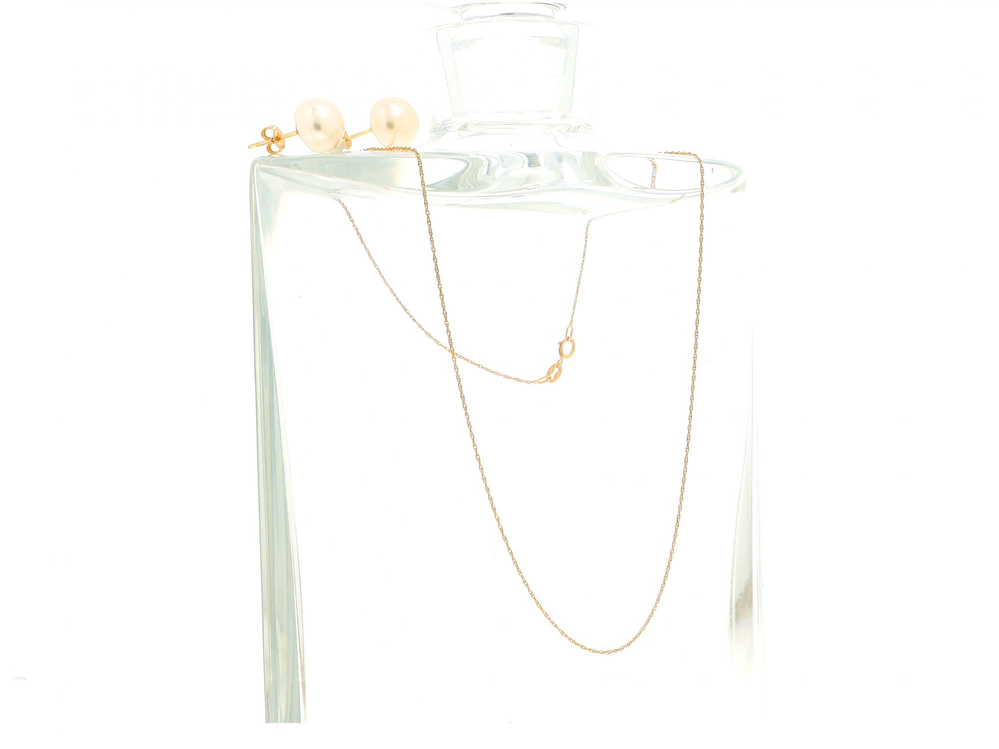 Lote 006 - Conjunto de Colar e Brincos em Ouro (fio) de malha Singapura, acompanhado com par de brincos de pérolas, elaborado em OURO 18 QUILATES.. Estado de Conservação: Excelente. Contraste: Marca 750. (OURO - ao abrigo do Decreto Lei 120/2017, artigo 3.º, alínea x). Medidas (Comp): 42 (1,1)cm. Peso Total: 4,15g.