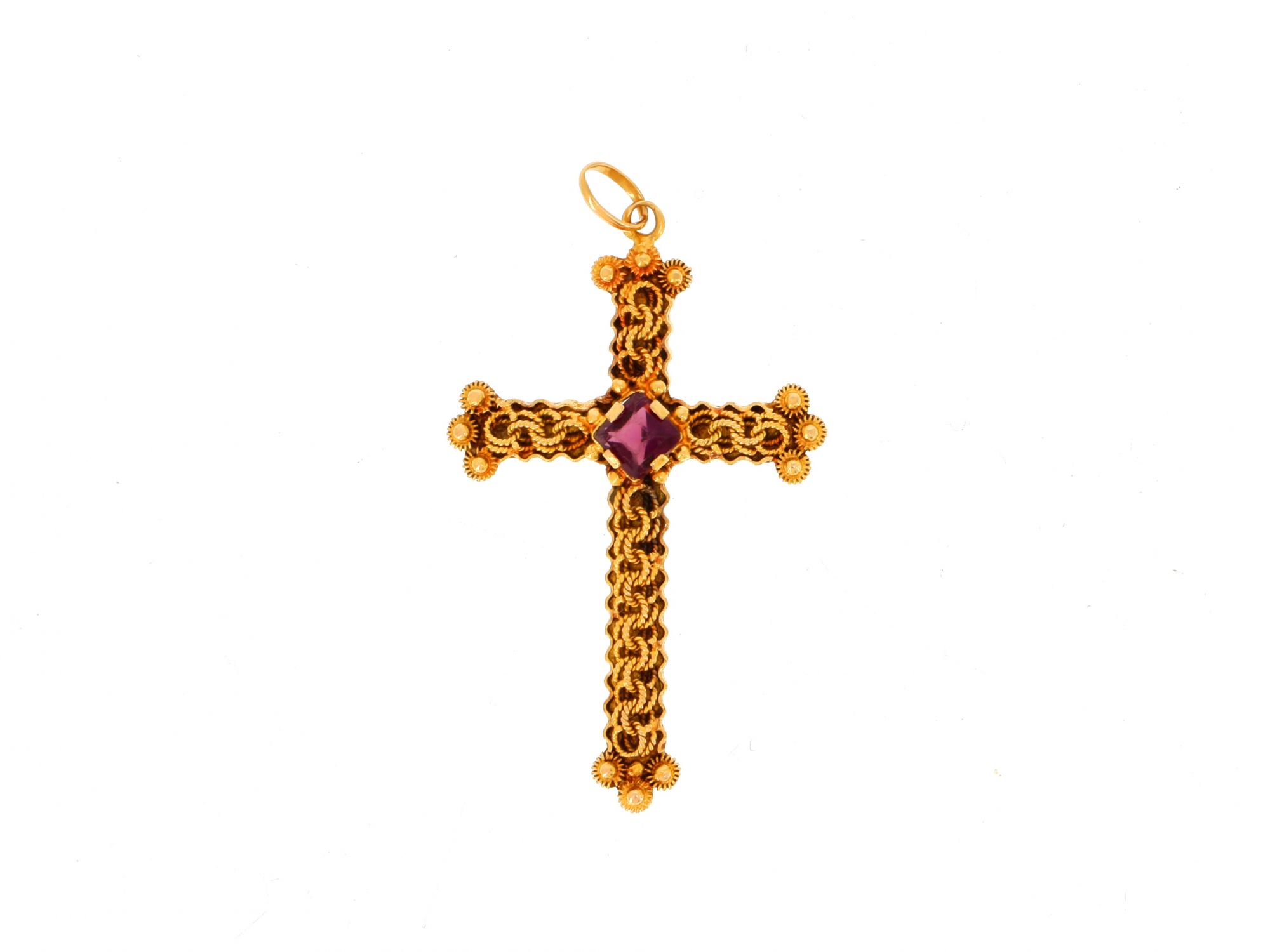 Lote 007 - Medalha ANTIGA em Ouro com formato de Cruz trabalhada à mão em FILIGRANA com zicórnia roxa ao centro e cantos em caramujo, elaborado em OURO 19,2 QUILATES. Estado de Conservação: Muito Bom, ligeiros sinais de uso. Contraste: Cabeça de Dragão 800 (1938-1984 - ao abrigo do Decreto Lei 120/2017, artigo 3.º, alínea y). Medidas (CxL): 5*2,9cm. Peso Total: 3,96g.