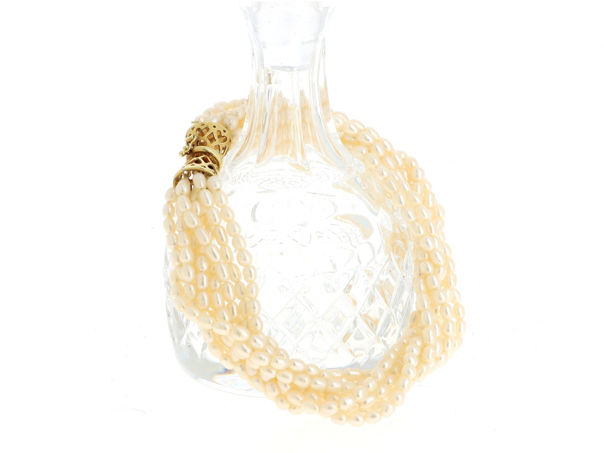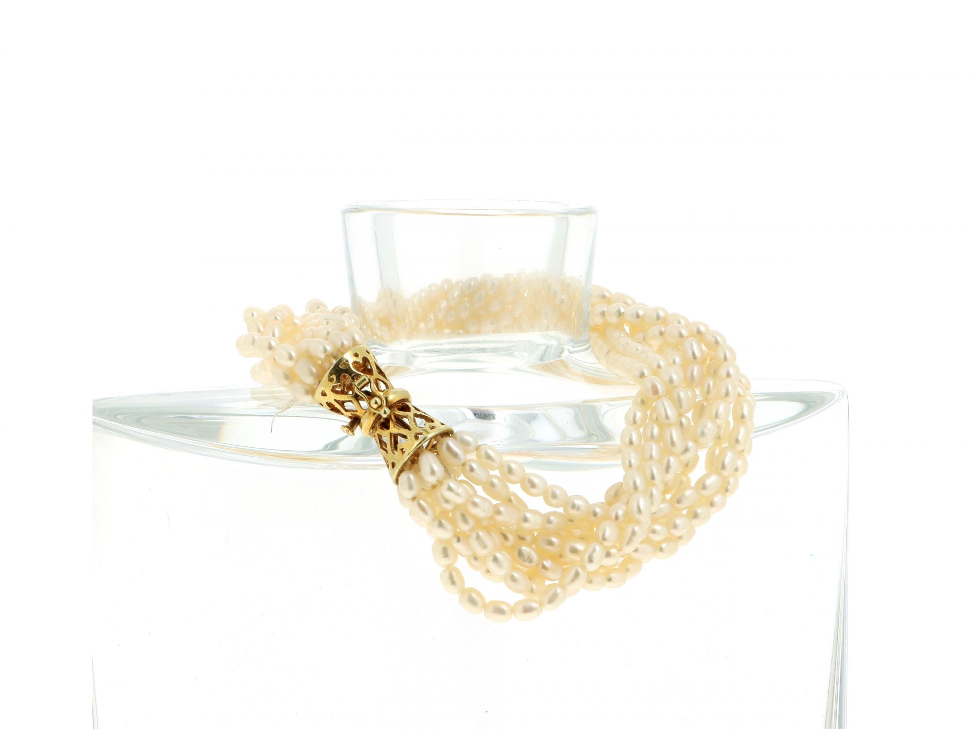 Lote 032 - Pulseira Torça composta por 10 fiadas de Pérolas de Rio com fecho em Ouro, elaborado em OURO 14 QUILATES. Estado de Conservação: Bom, sinais de uso. Contraste: Marca 585. (OURO - ao abrigo do Decreto Lei 120/2017, artigo 3.º, alínea x). Medidas (Comp): 21cm. Peso Total: 28,31g.