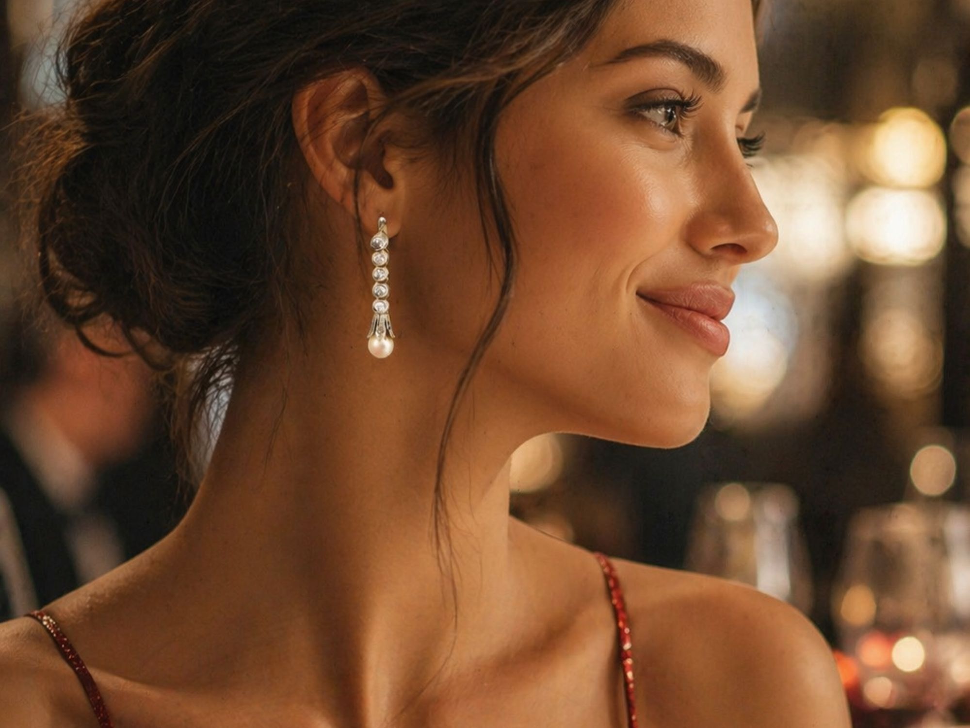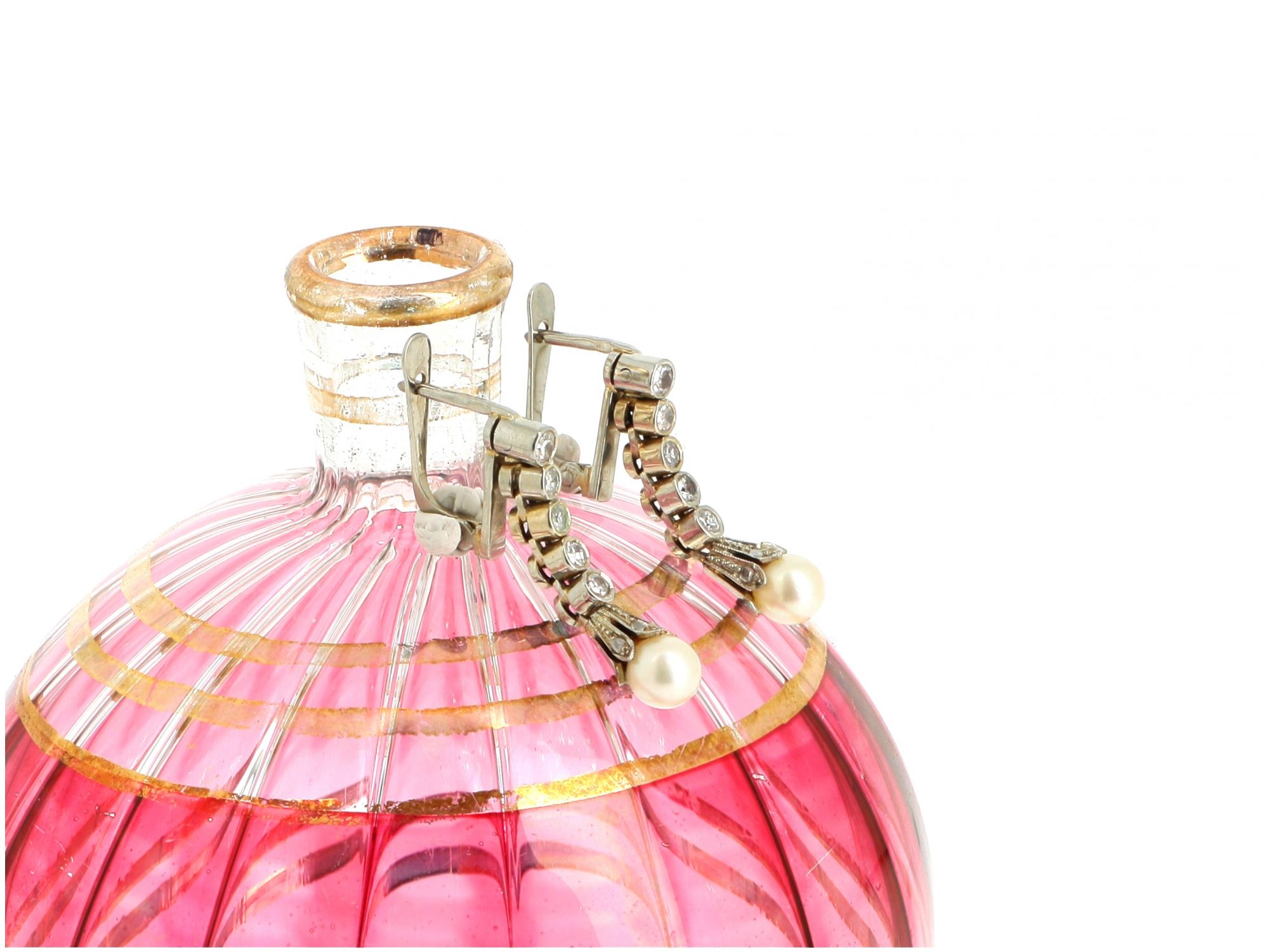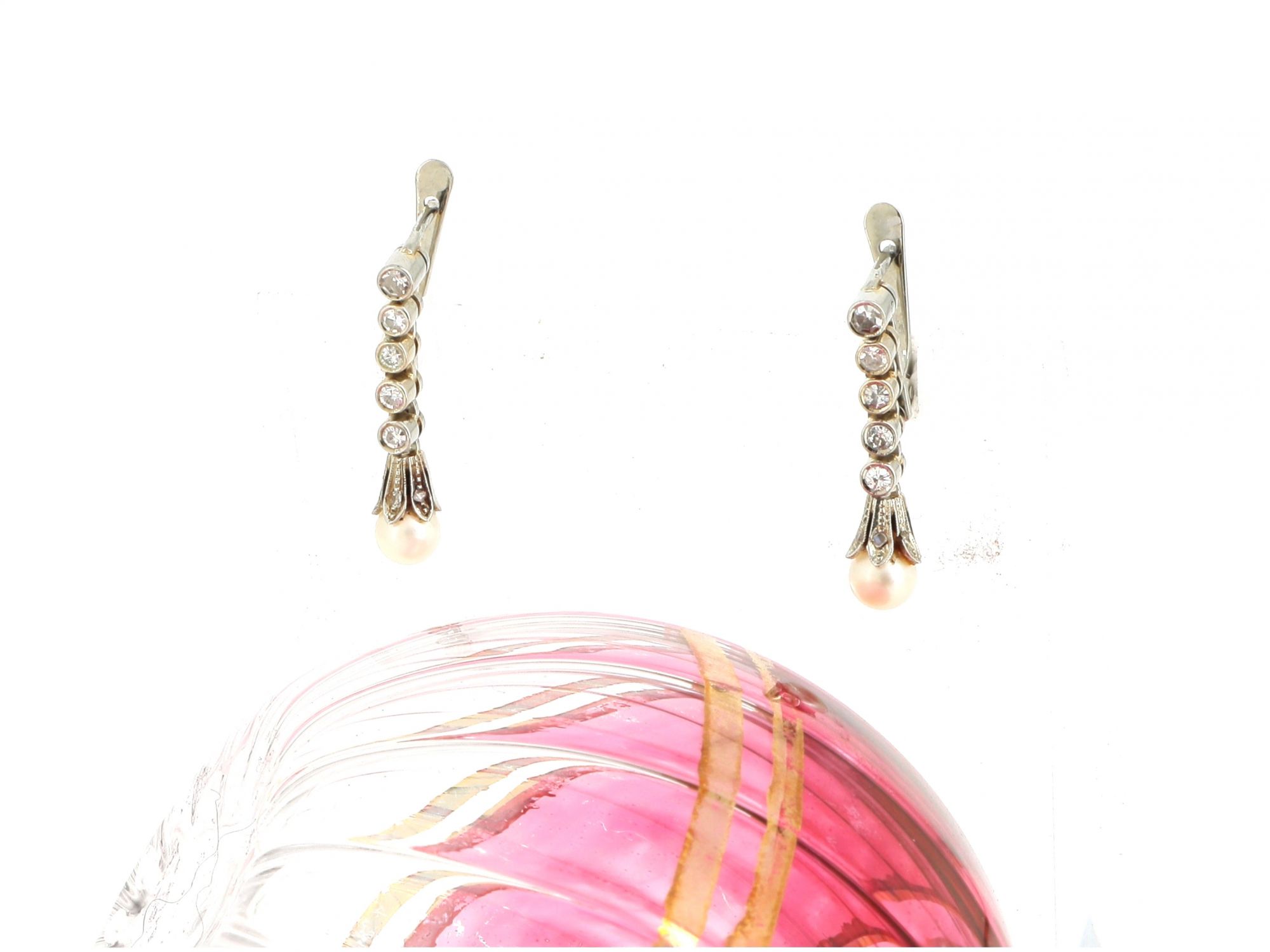 Lote 004 - Brincos ANTIGOS em Ouro Branco compridos em tira de círculos cravejados com 10 DIAMANTES em talhe brilhante com pendente em pérola da cultura, elaborado em OURO 19,2 QUILATES. Estado de Conservação: Bom. Contraste: Formiga (Ouro Branco 800) (1938-1984 - ao abrigo do Decreto Lei 120/2017, artigo 3.º, alínea y). Medidas (Comp): 2,2cm. Peso Total: 3,88gr.