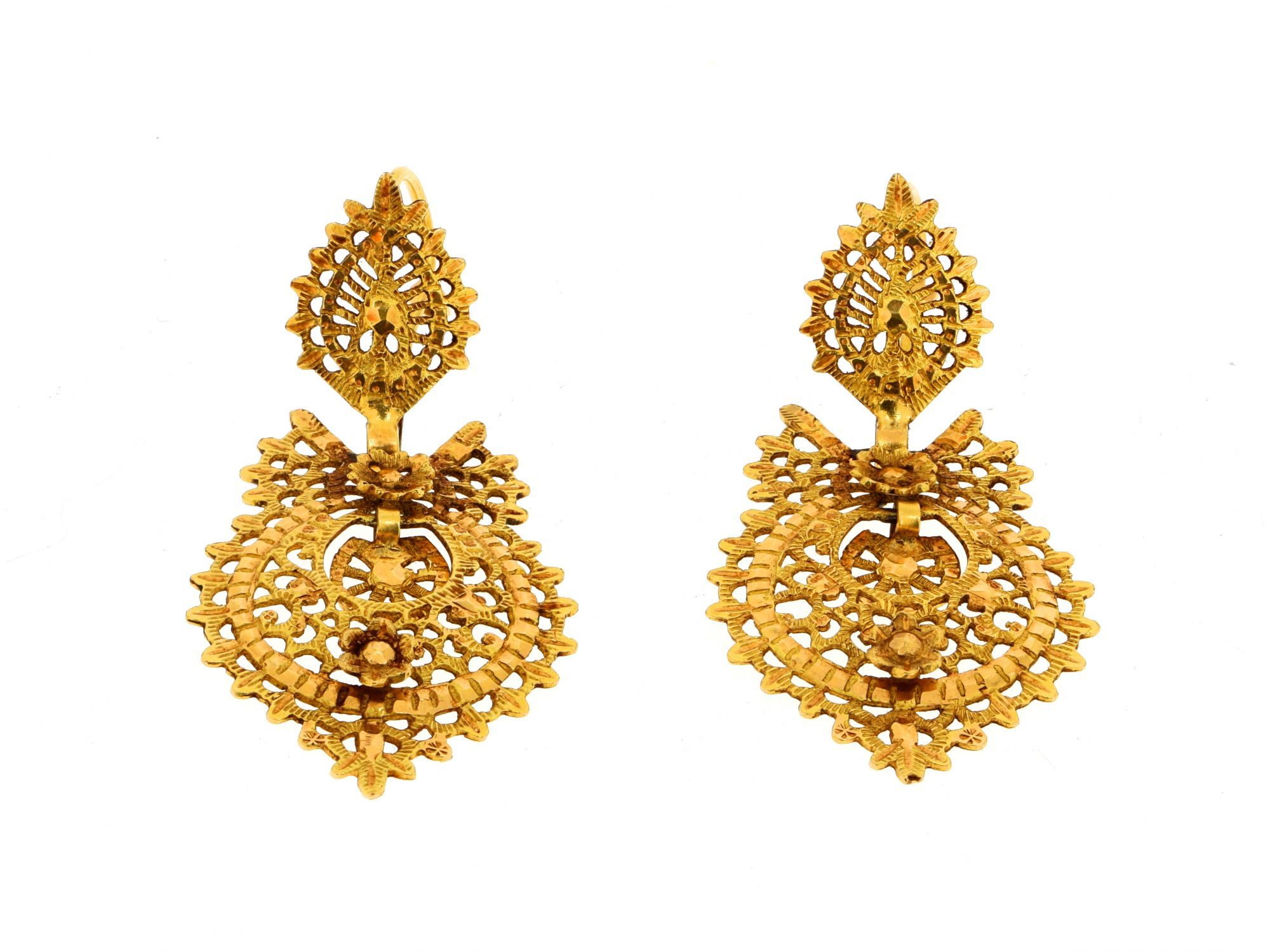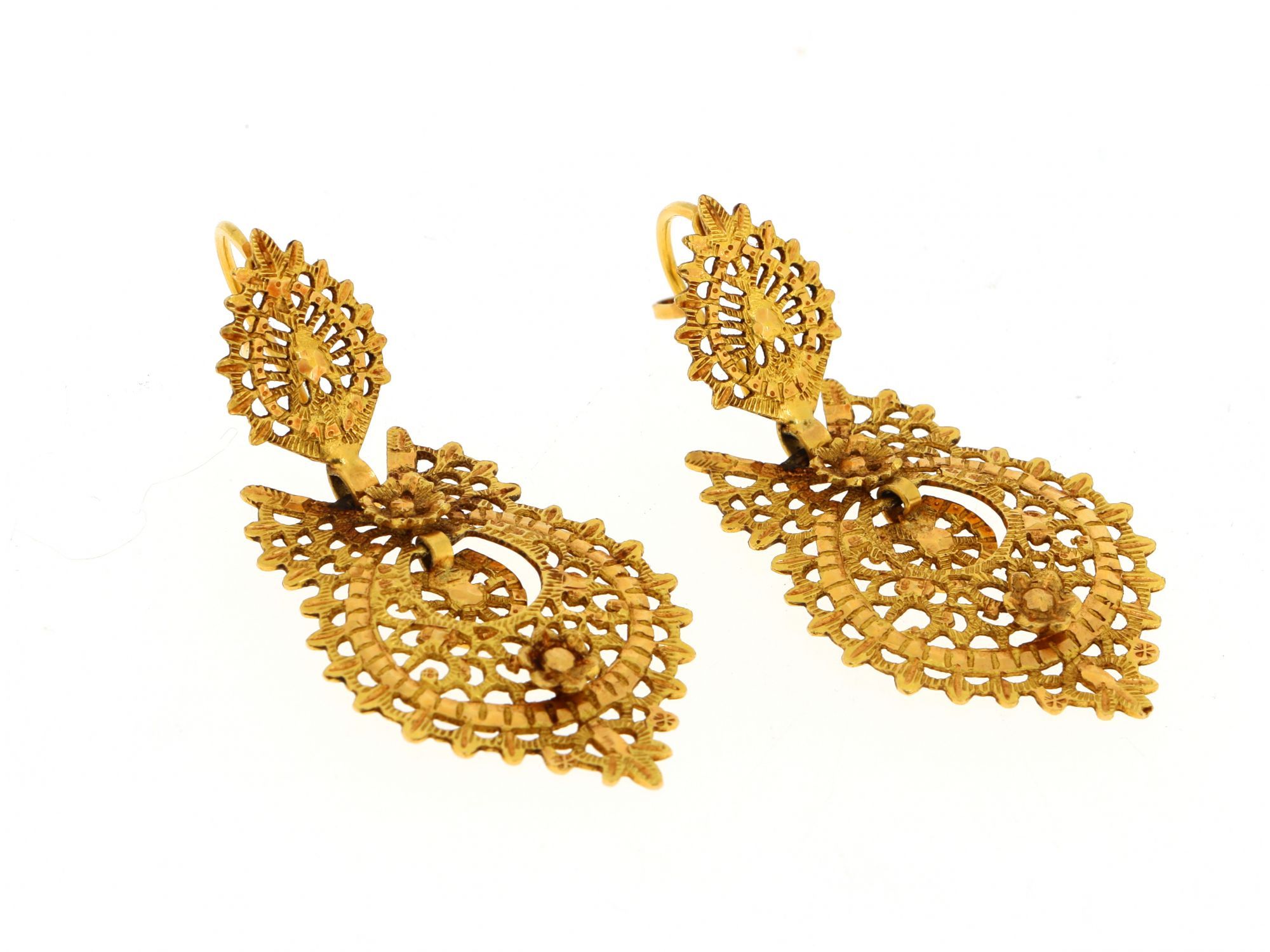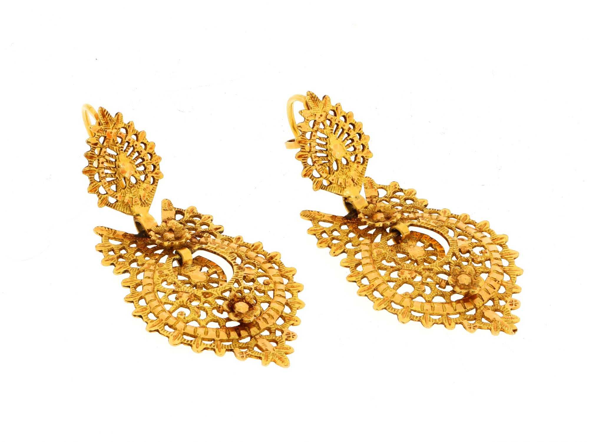Lote 008 - Brincos à Rainha trabalhados em FILIGRANA, elaborado em OURO 19,2 QUILATES. Estado de Conservação: Bom, sinais de uso. Contraste: Marca de Ourives. (ao abrigo do Decreto Lei 120/2017, artigo 3.º, alínea z). Medidas (CxL): 5,8*2,8cm. Peso Total: 13,56g.