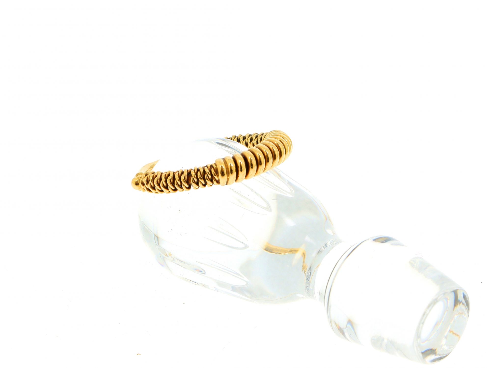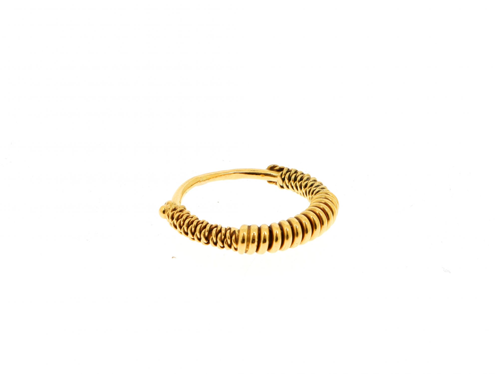 Lote 010 - Anel em Ouro polido com parte superior trabalhada em arame fino, começando alargar, elaborado em OURO 19,2 QUILATES. Estado de Conservação: Bom. Contraste: Cabeça de Veado 800 (OURO - 1985-2020, ao abrigo do Decreto Lei 120/2017, artigo 3.º, alinea Z). Tam.: 13. Medidas (CxLxA): 2,2*0,4*2,1cm. Peso Total: 4,52g.