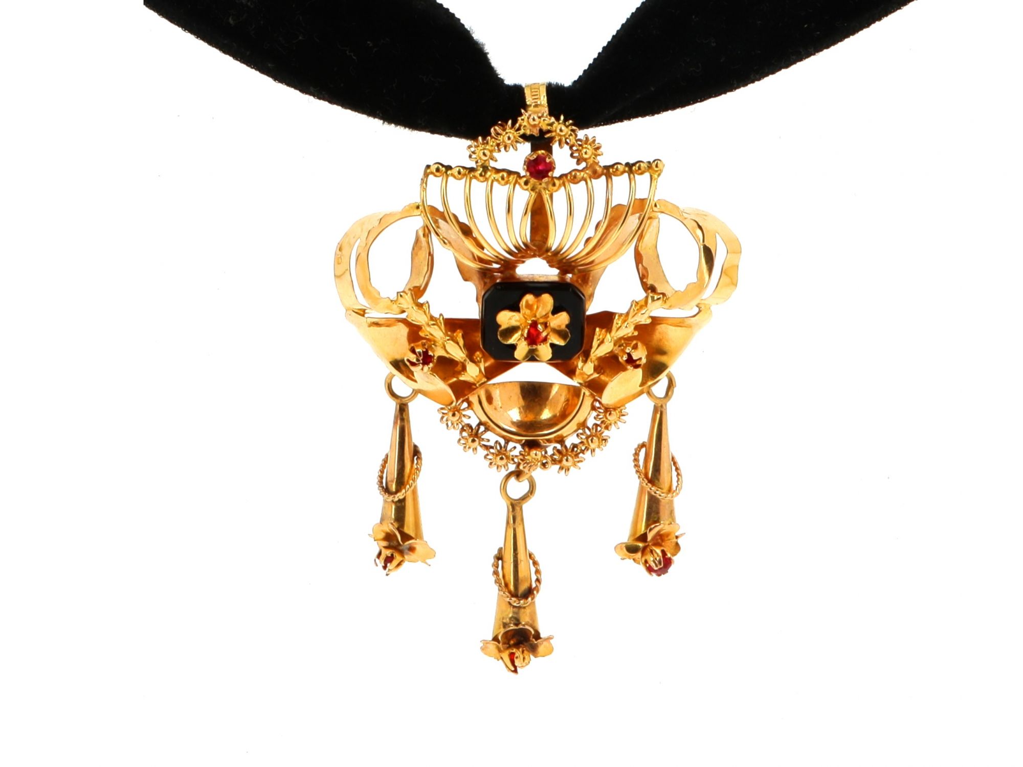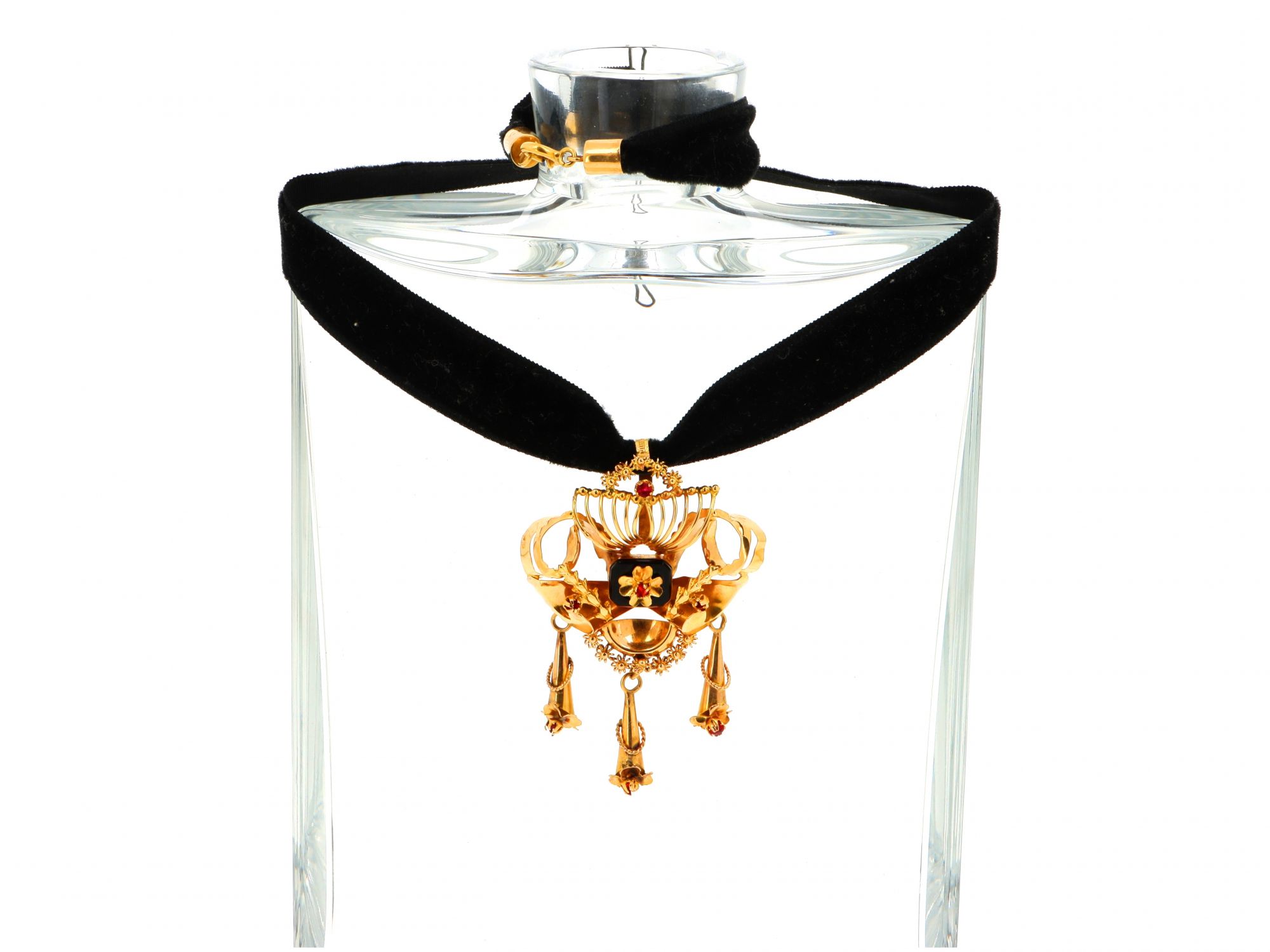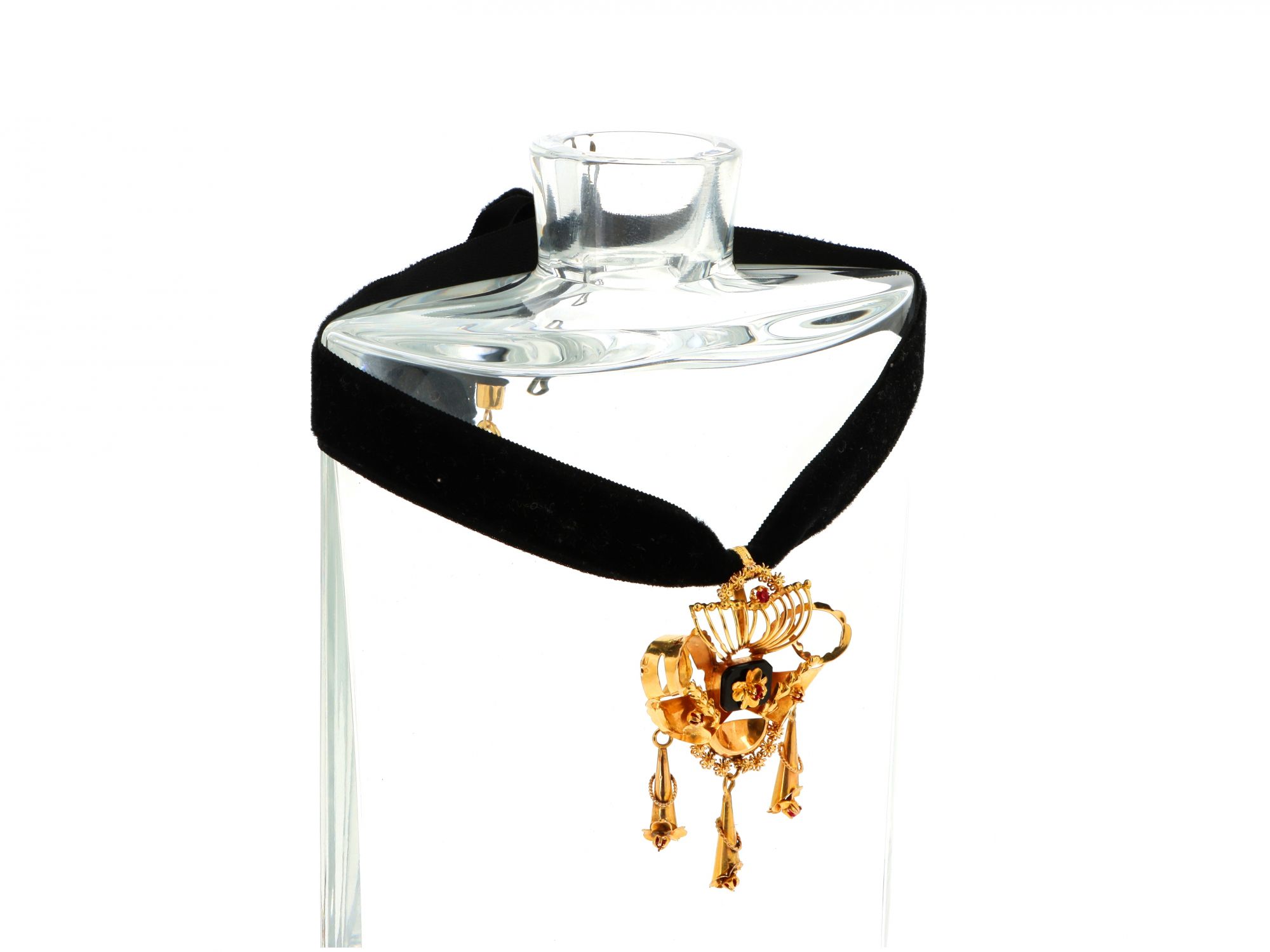 Lote 002 - Gargantilha ANTIGA em Ouro com fio em veludo preto com mosquetão em Ouro, acompanhado por Medalha estilo Gramalheira, elaborado em OURO 19,2 QUILATES. Estado de Conservação: Muito Bom. Contraste: Cabeça de Dragão 800 (1938-1984 - ao abrigo do Decreto Lei 120/2017, artigo 3.º, alínea y). Medidas (CxL): 42*6cm. Peso Total: 12,46g.
