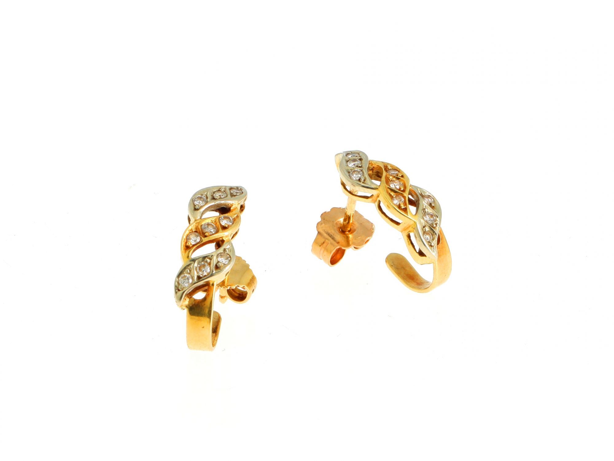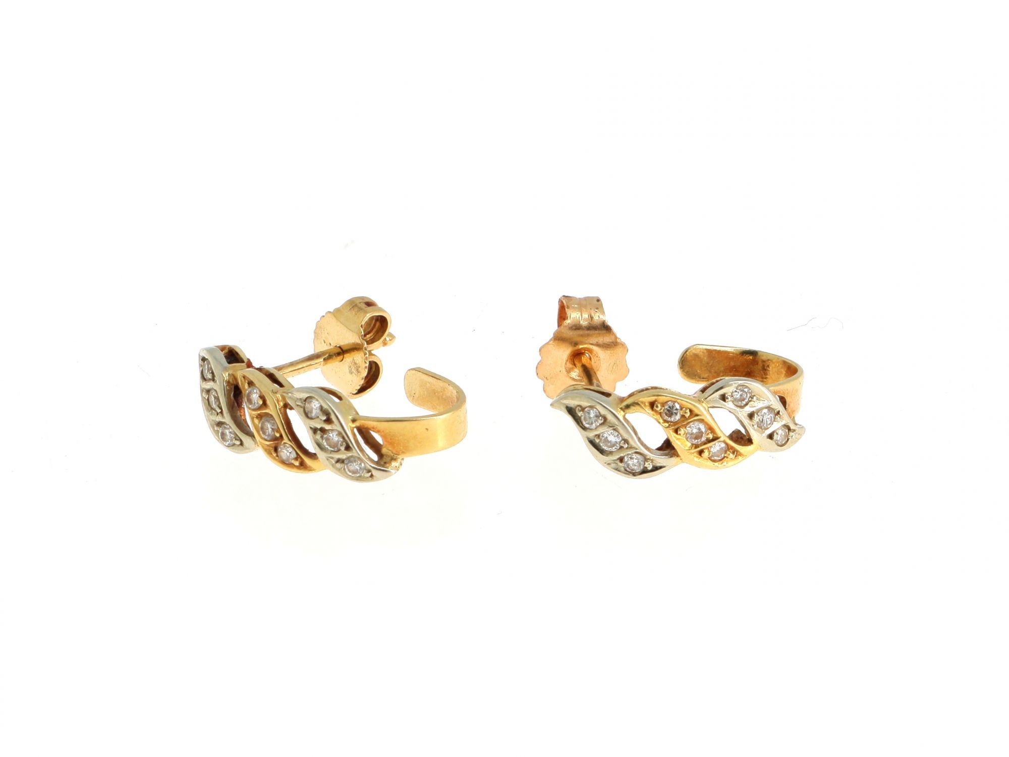 Lote 005 - Brincos em Ouro Bicolor em onda, cravejados com 9 DIAMANTES cada, elaborado em OURO 19,2 QUILATES. Estado de Conservação: Bom, sinais de uso. Contraste: Cabeça de Veado 800 (OURO - 1985-2020, ao abrigo do Decreto Lei 120/2017, artigo 3.º, alínea.