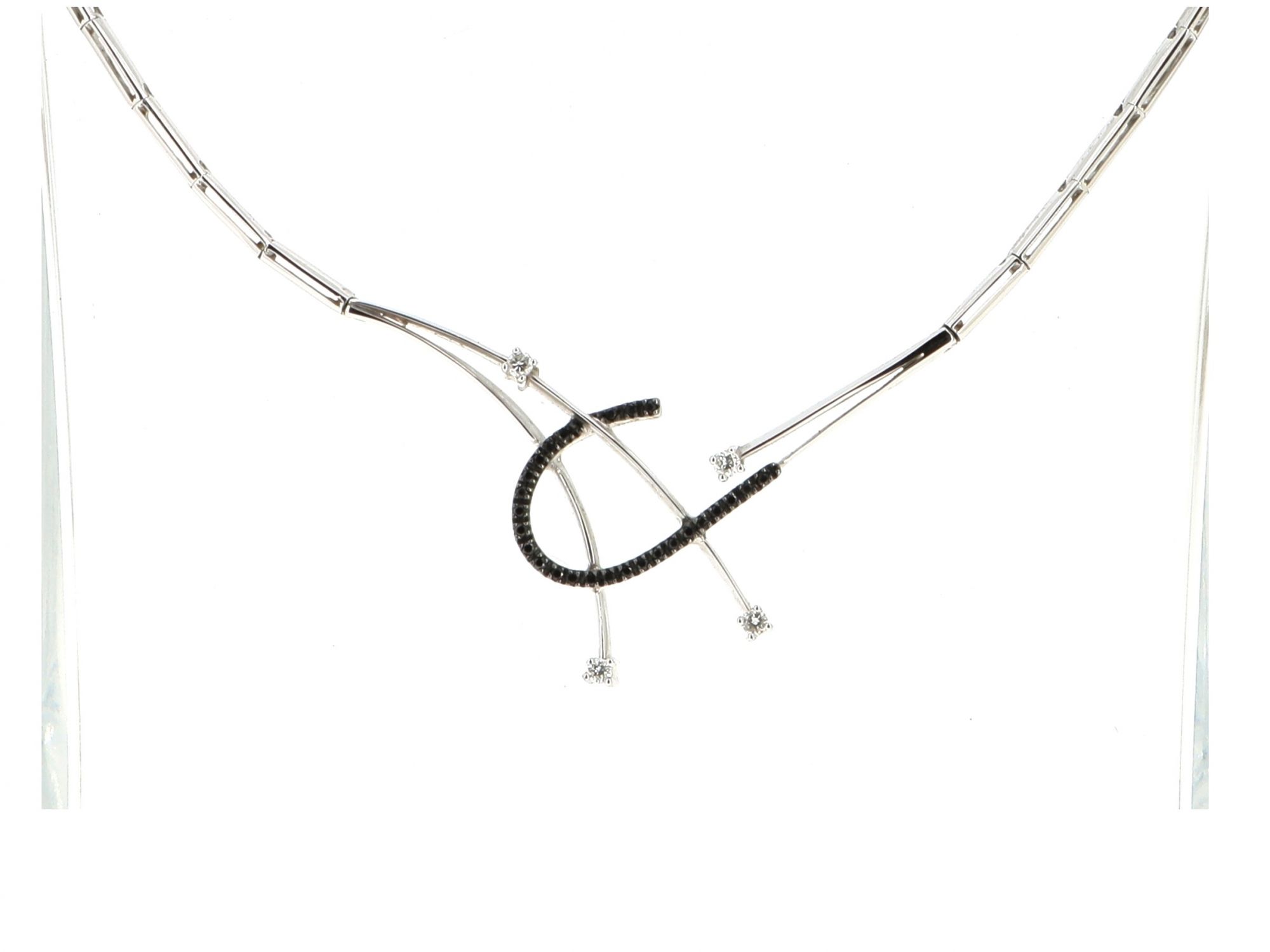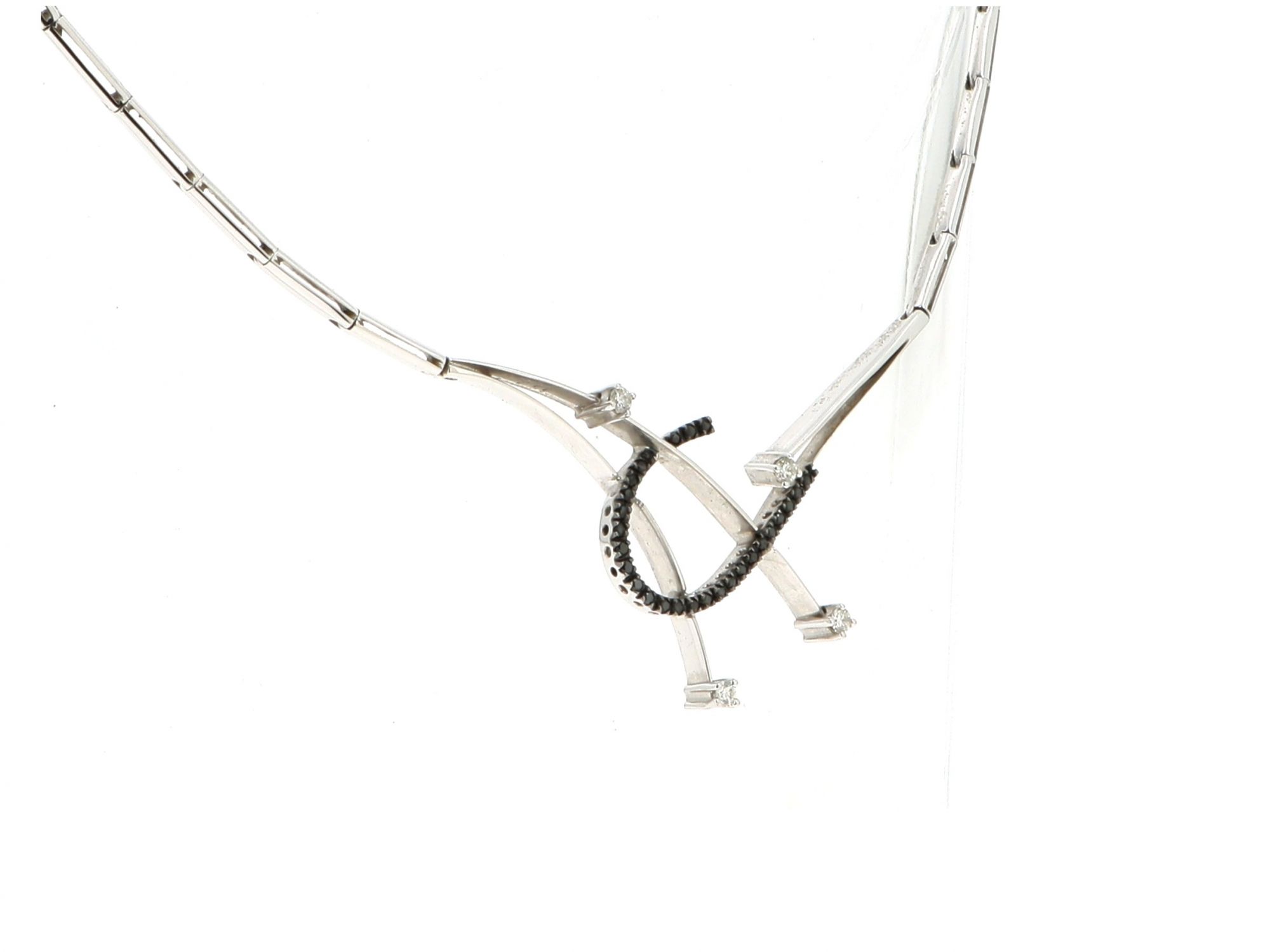 Lote 007 - Gargantilha em Ouro Branco de malha elos maleáveis unidos em quatro pontas cravejados com 26 DIAMANTES PRETOS em talhe redondo e 4 DIAMANTES incolores de talhe quadrado brilhante, elaborado em OURO 19,2 QUILATES. Estado de Conservação: Muito Bom.