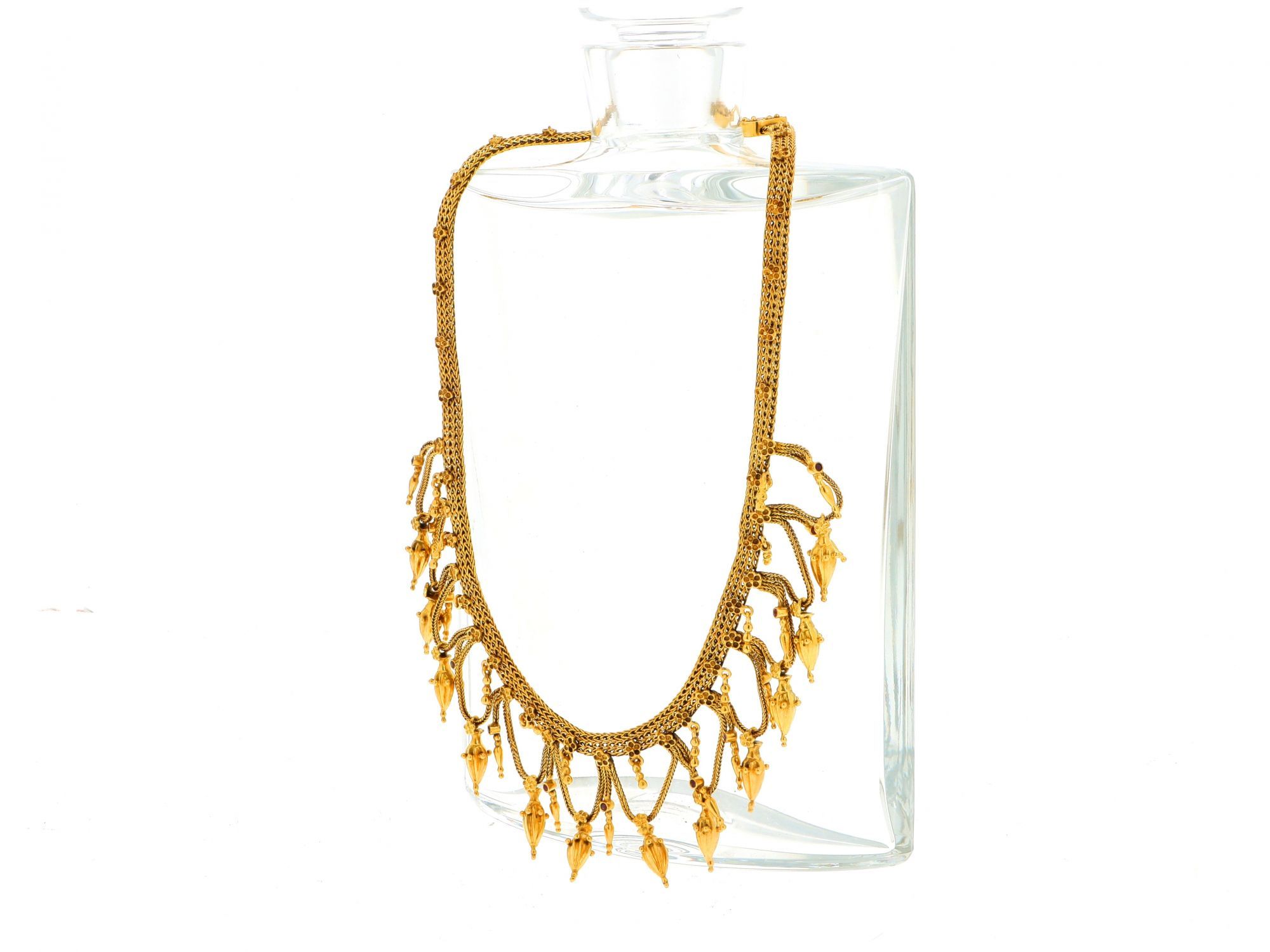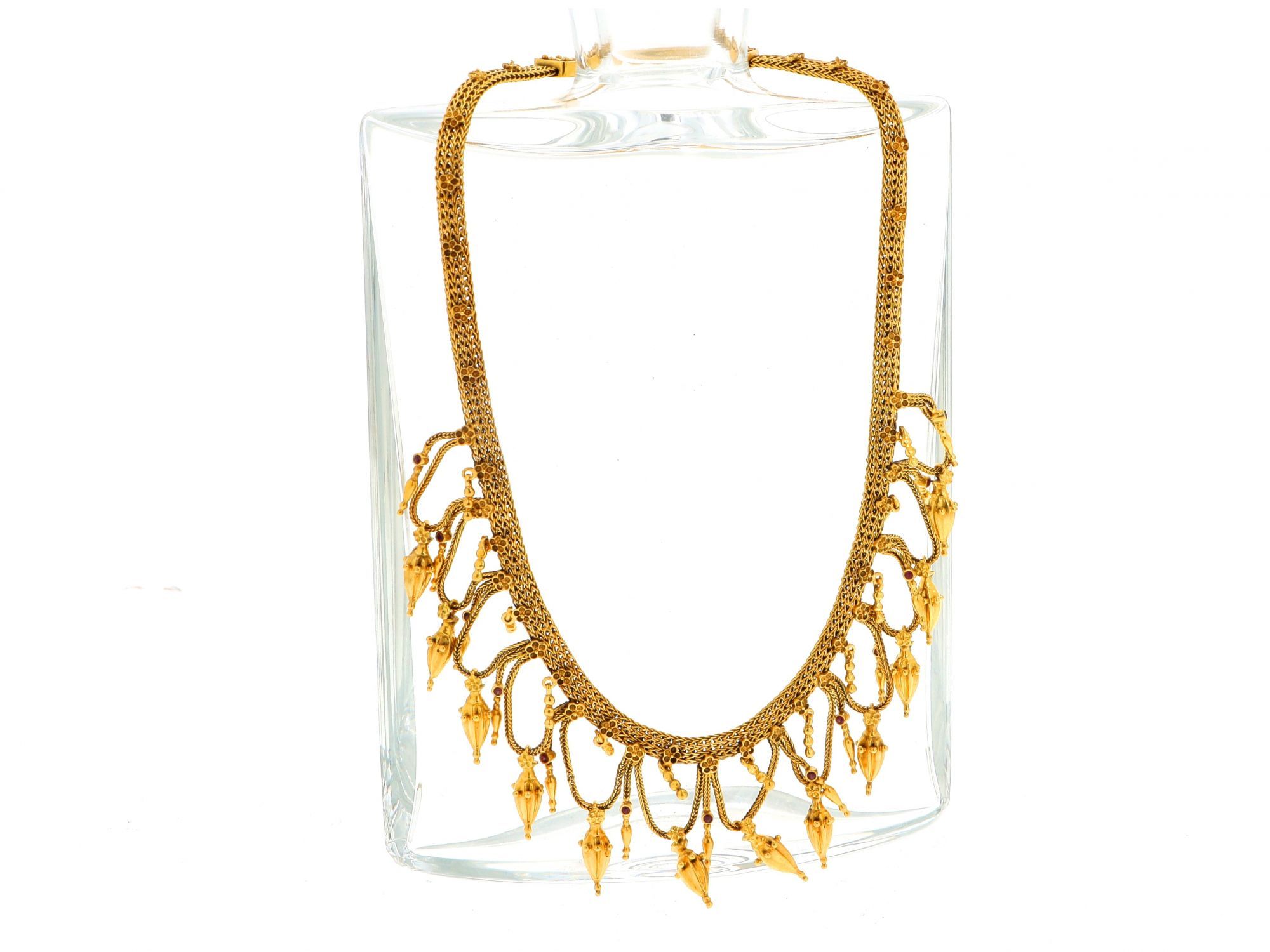 Lote 001 - Gargantilha em Ouro polido de malha cordão baiano achatado com flores em relevo com parte central em pendentes tipo egípcios intercalados com pequenas zicórnias vermelhas, elaborado em OURO 19,2 QUILATES. Estado de Conservação: Muito Bom. Medidas (CxL): 41,5*4cm. Peso Total: 68,88gr.