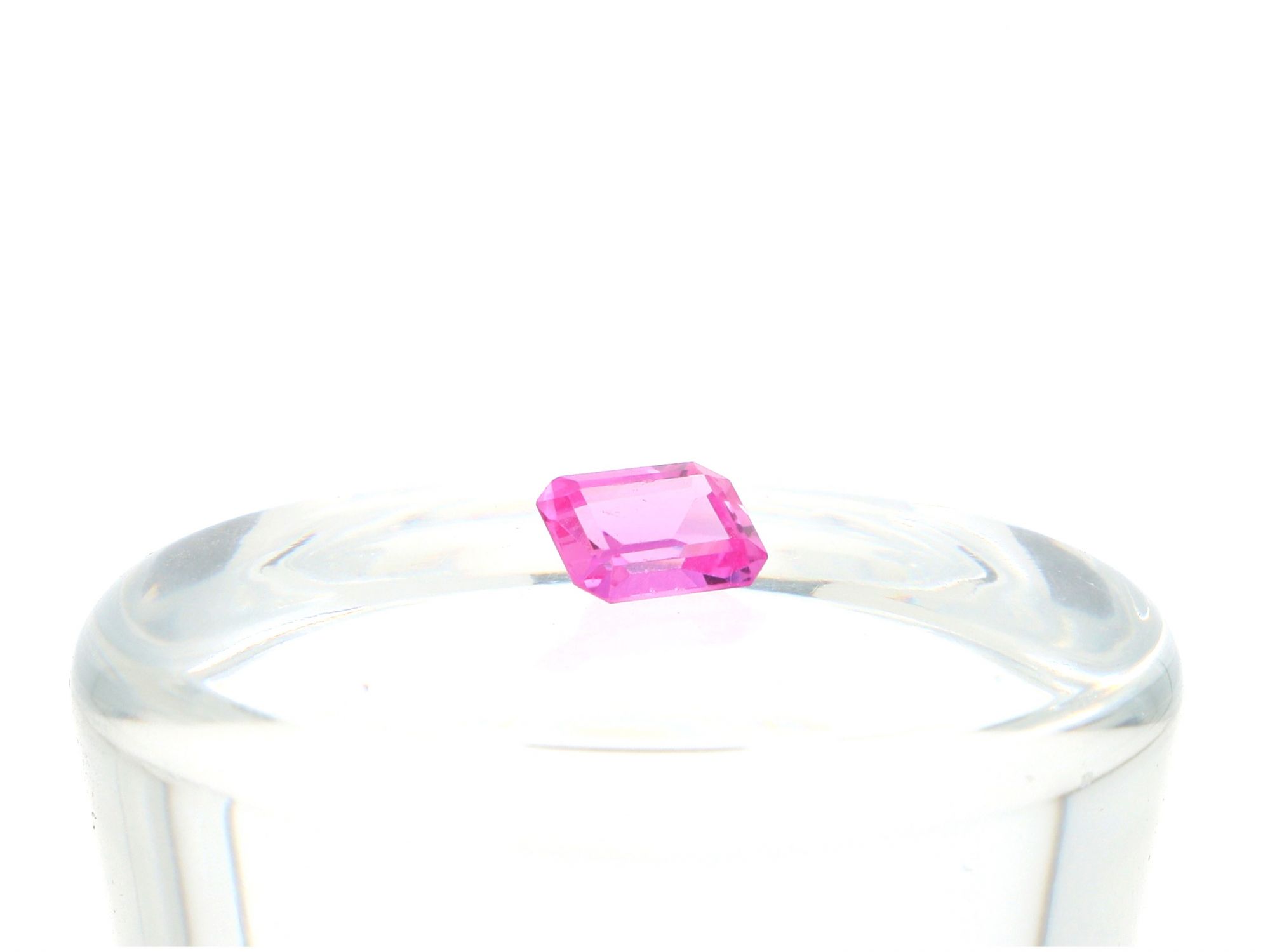 Lote 009 - Pedra SAFIRA ROSA em talhe retangular com 1,80CT, testada por máquina Presidium Duo Tester II. Estado de Conservação: Bom. Medidas (CxL): 0,8*0,6cm. Peso Total: 1,8. Nota Importante: As pedras preciosas apresentadas neste leilão foram testadas em máquina para verificação do tipo de material. No entanto, este teste não permite determinar se a pedra é natural, tratada ou sintética. Assim, informamos que não nos responsabilizamos pela origem ou natureza exata das mesmas, sendo vendidas no estado em que se encontram e sem certificado gemológico.